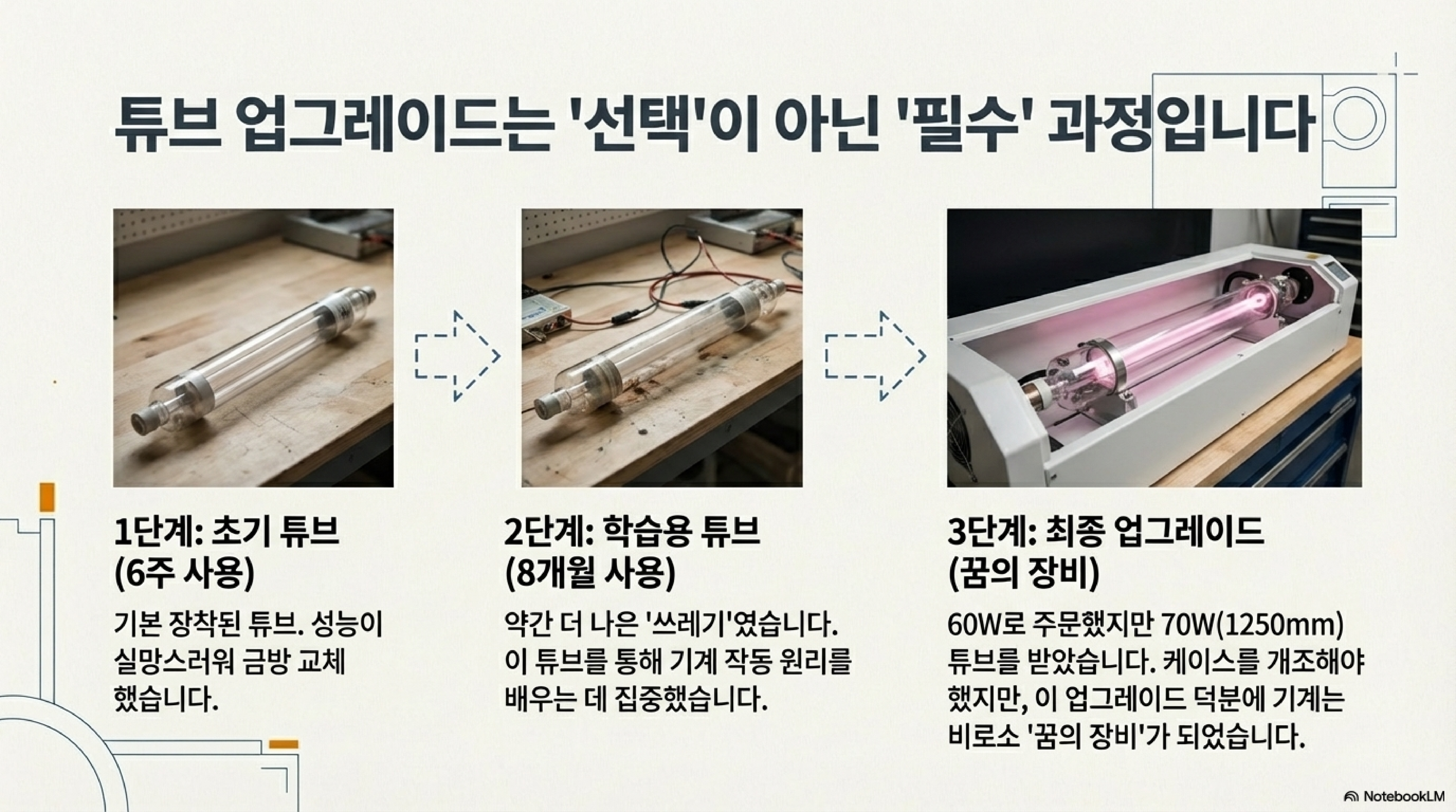 Russ의 경험에 따르면, '50W' 기계로 판매되는 제품은 보통 50W 전원 공급 장치를 갖추고 있지만, 정작 핵심 부품인 레이저 튜브는 그보다 낮은 등급의 40W 튜브가 장착되어 있는 경우가 대부분입니다. 그는 첫 번째 번들 튜브를 약 6주간 사용했고, 이후 교체한 두 번째 튜브는 8개월가량 "학습 보조 도구"로 활용하며 기계의 작동 원리를 파고들었습니다. 이 과정을 통해 그는 초기에 장착된 튜브의 한계를 명확히 깨닫고 제대로 된 업그레이드를 결심하게 되었습니다. 따라서 기계를 구매할 때, 머지않아 튜브를 교체해야 할 비용까지 염두에 두는 것이 현명합니다.