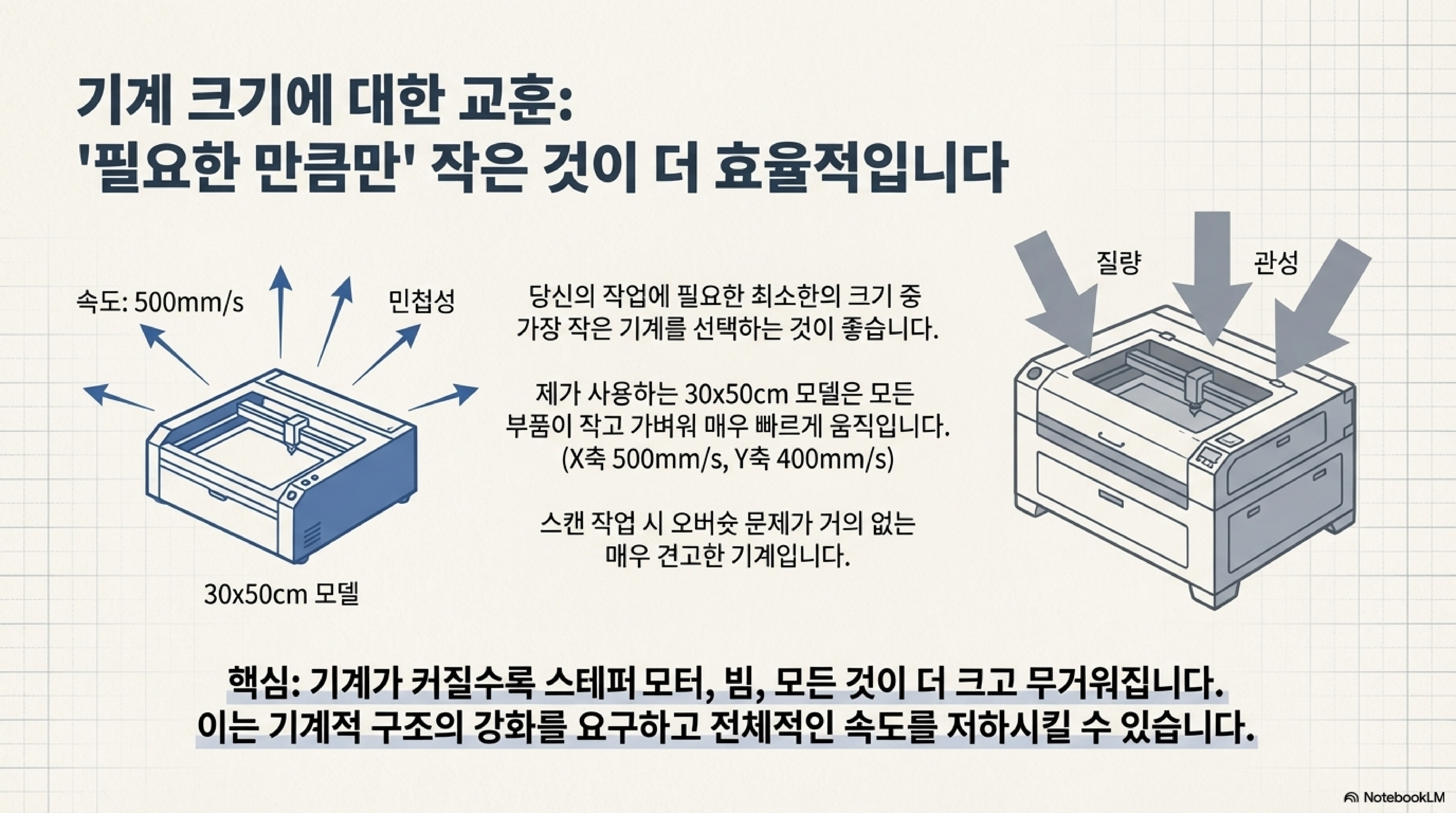 - 가볍고 빠르다: 한 단계 더 큰 기계는 더 큰 스테퍼 모터와 빔 등 모든 부품이 무거워집니다. 반면 소형 기계는 부품이 작고 가벼워 빠르게 움직입니다.