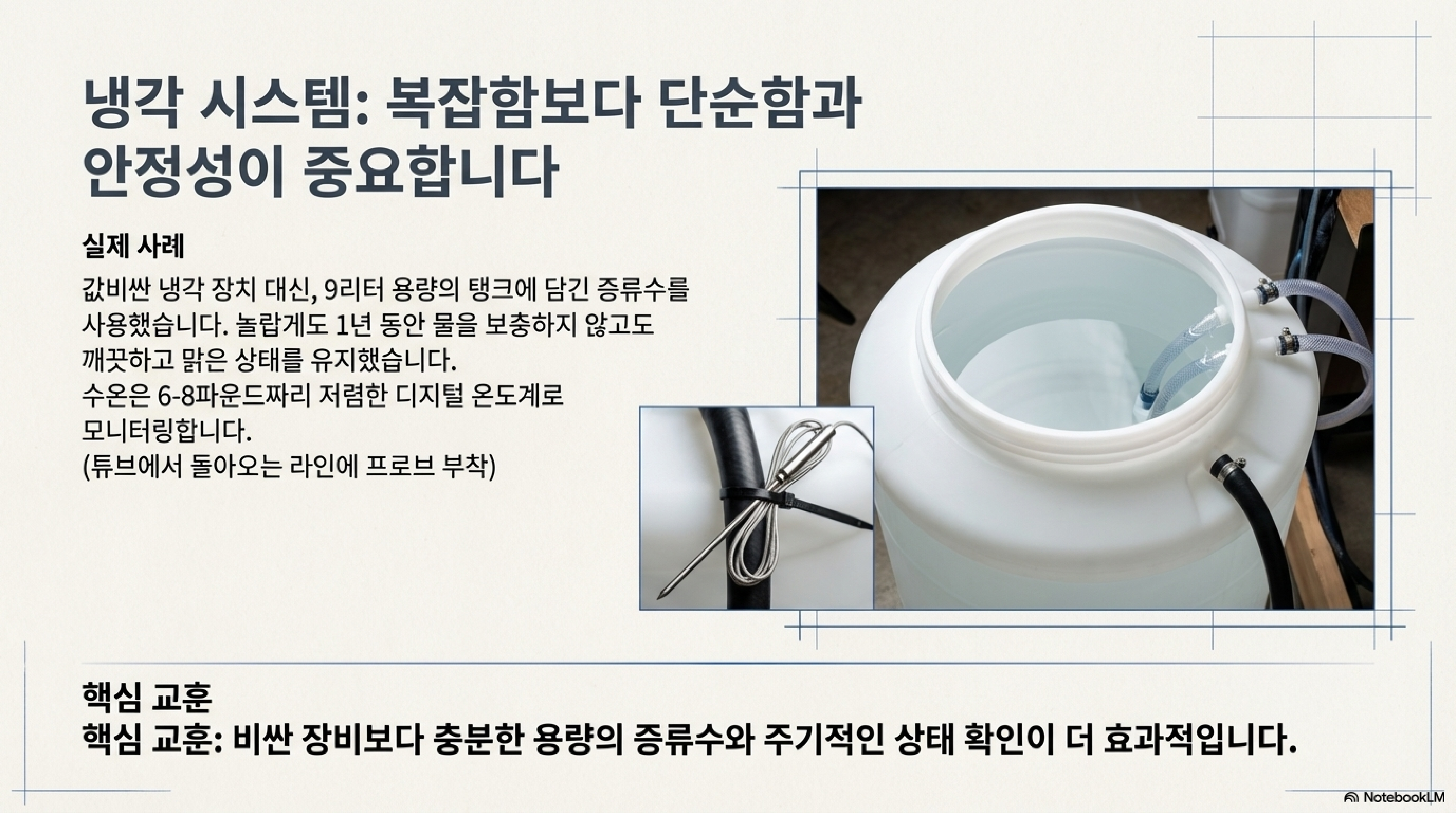 - 냉각수: Russ는 냉각 탱크에 담긴 증류수를 1년 동안 한 번도 교체하거나 보충하지 않았습니다. 그는 한 달에 한 번쯤 온도계를 막대기처럼 사용해 물을 찍어본 뒤, 냄새를 맡고 심지어 맛까지 보며 상태를 확인했습니다. 1년이 지난 후에도 물은 여전히 깨끗하고 맑았으며, 맛도 완벽하게 괜찮았다고 합니다. 이는 냉각 시스템 관리가 생각보다 복잡하지 않을 수 있음을 보여주는 유쾌한 증거입니다.