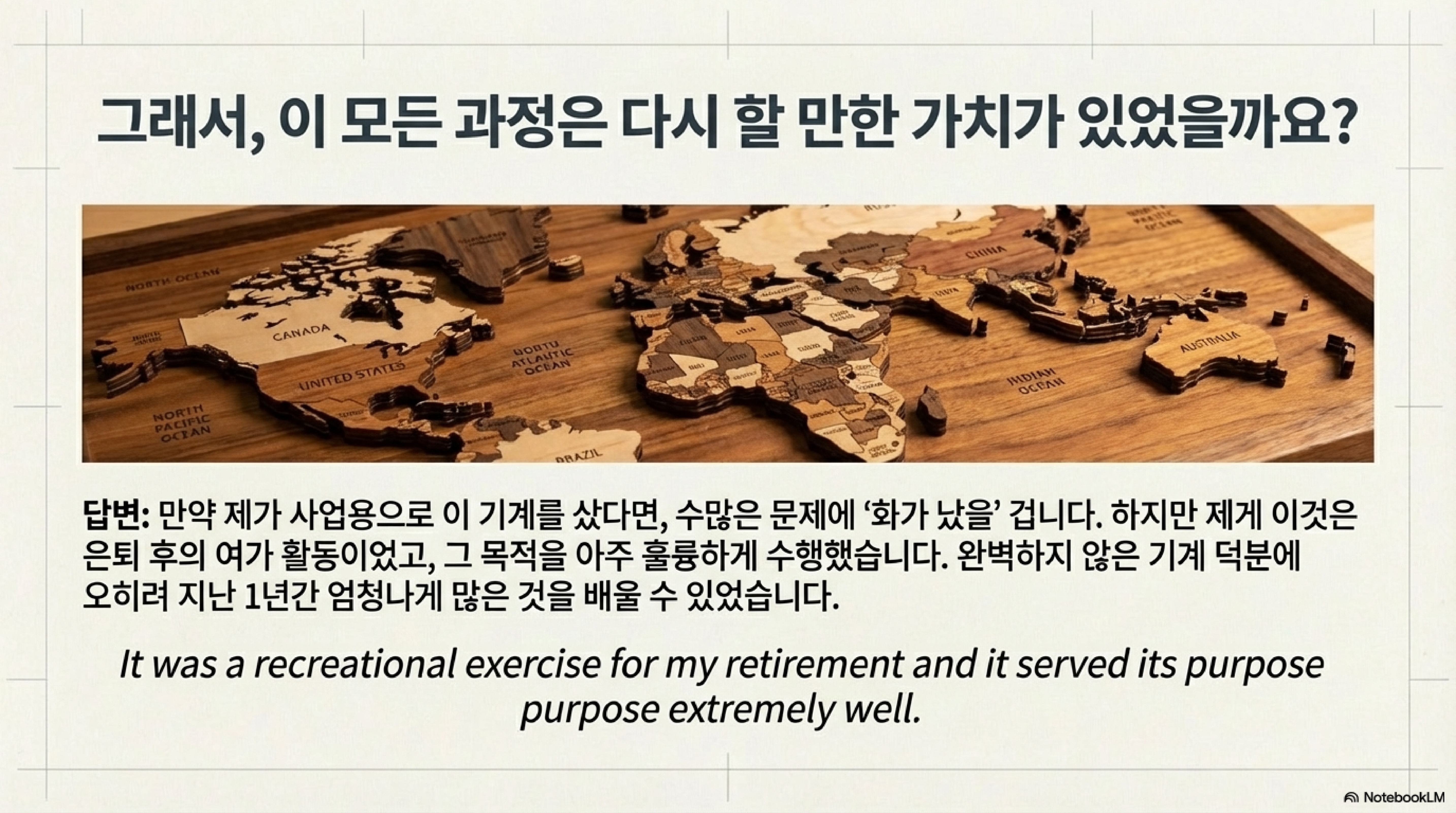 Russ의 1년은 단순한 기계 사용기를 넘어, 문제 해결과 학습, 그리고 성장의 여정이었습니다. 만약 그가 사업을 위해 완벽한 기계를 원했다면, 이 모든 불완전함은 큰 좌절이었을 것입니다. 하지만 은퇴 후 취미 활동으로 기계를 다루는 그에게 이 과정은 더없이 보람 있는 경험이었습니다. 기술적인 배움 외에도, 그는 전 세계에서 수백 명의 좋은 친구들을 사귀는 기쁨을 누렸습니다.