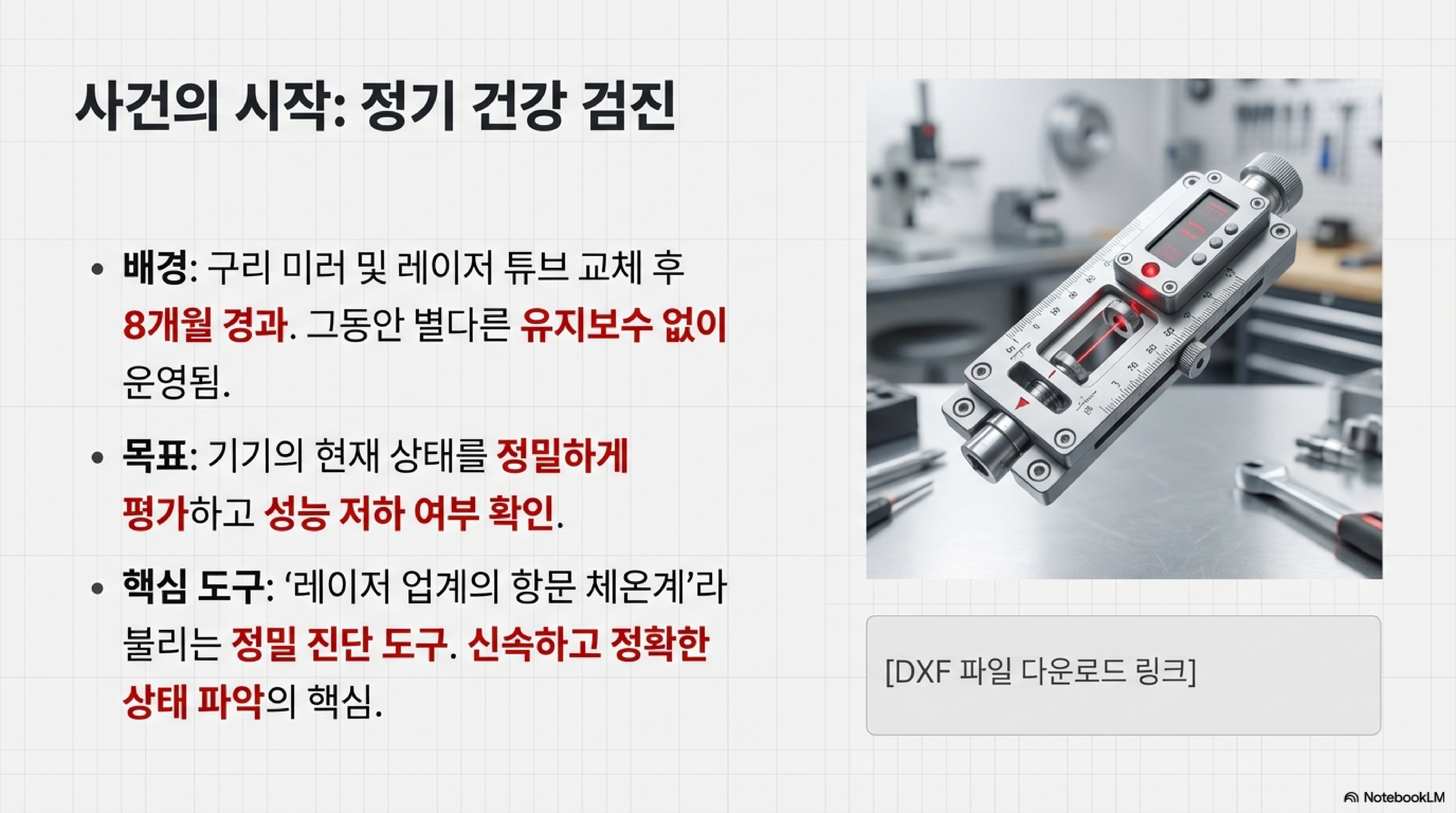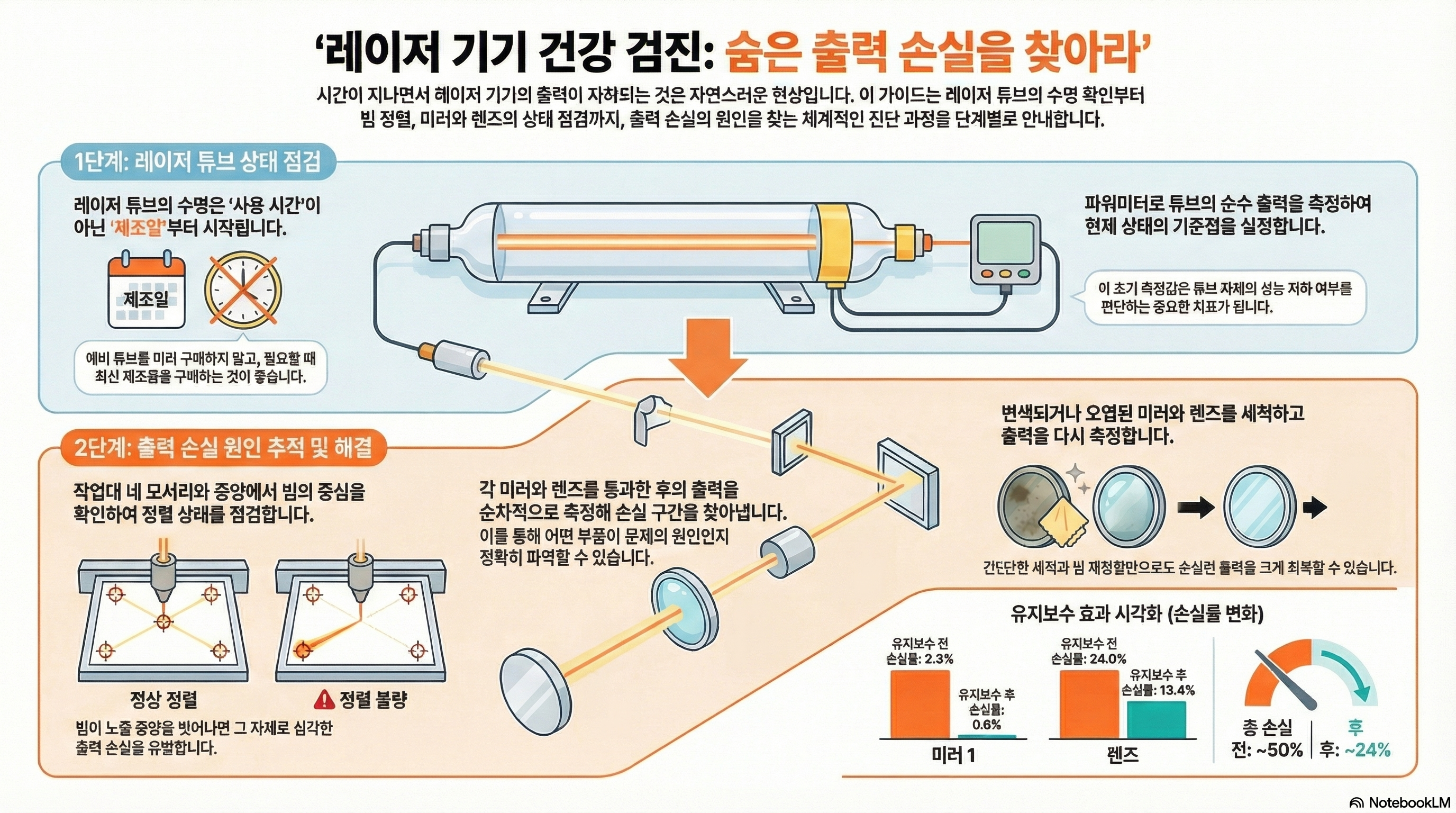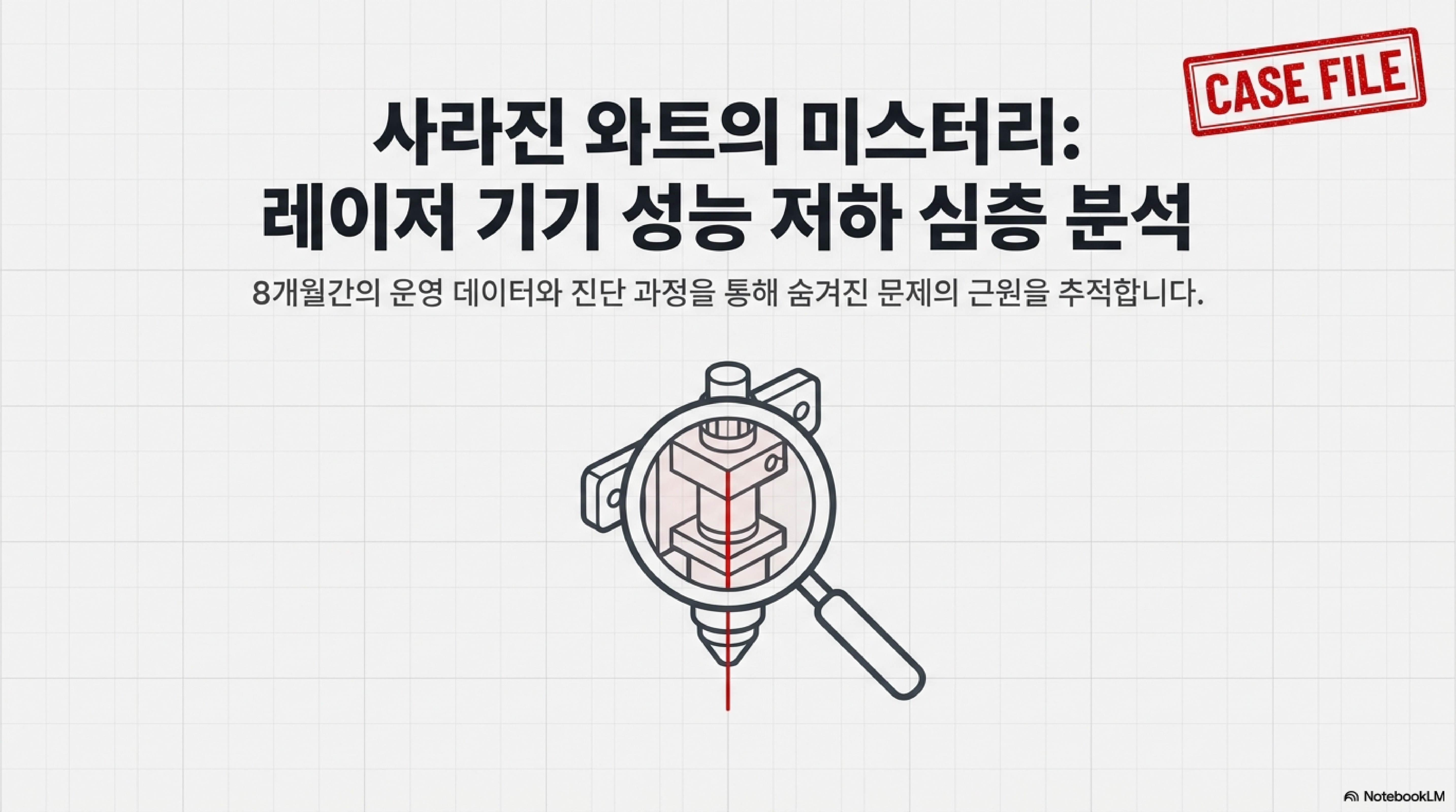이 글은 한 레이저 전문가가 8개월 만에 자신의 기계를 정밀 점검하면서 발견한, 예상치 못한 놀라운 사실들에 대한 이야기입니다. 단순한 노후화나 고장이 아니었습니다. 범인은 전혀 생각지 못한 곳에 숨어있었고, 그 과정은 마치 탐정의 추리와도 같았습니다. 당신의 기계에도 숨어있을지 모를 '출력 도둑'의 정체를 지금부터 함께 파헤쳐 보겠습니다.