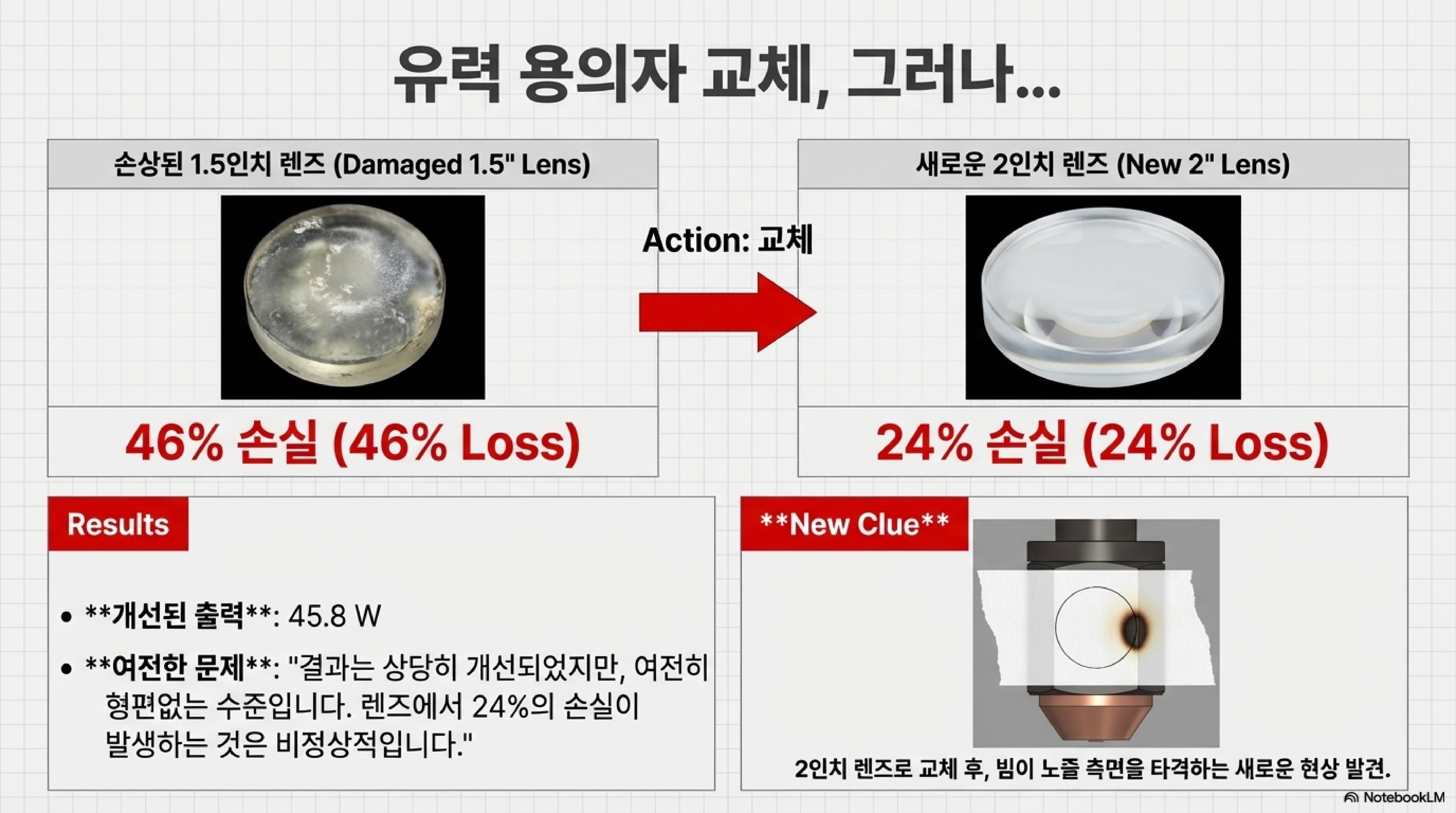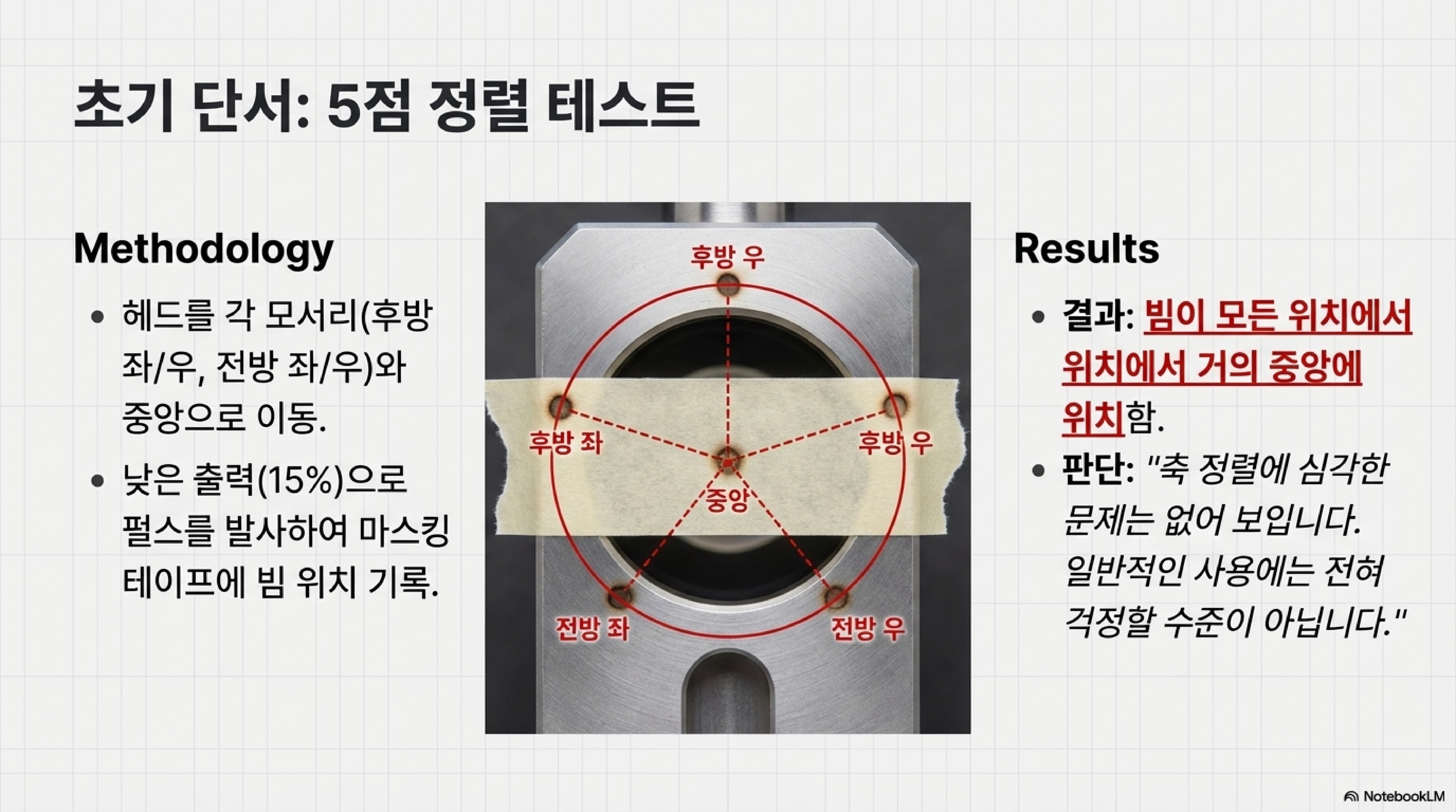 다음 용의선상은 '정렬'이었습니다. 육안으로는 완벽해 보였지만, 정밀한 테스트는 다른 이야기를 들려주었습니다. 새로운 2인치 렌즈로 교체한 후, 빔이 노즐의 중앙을 통과하지 못하고 미세하게 측면에 부딪히는 현상을 발견했습니다.