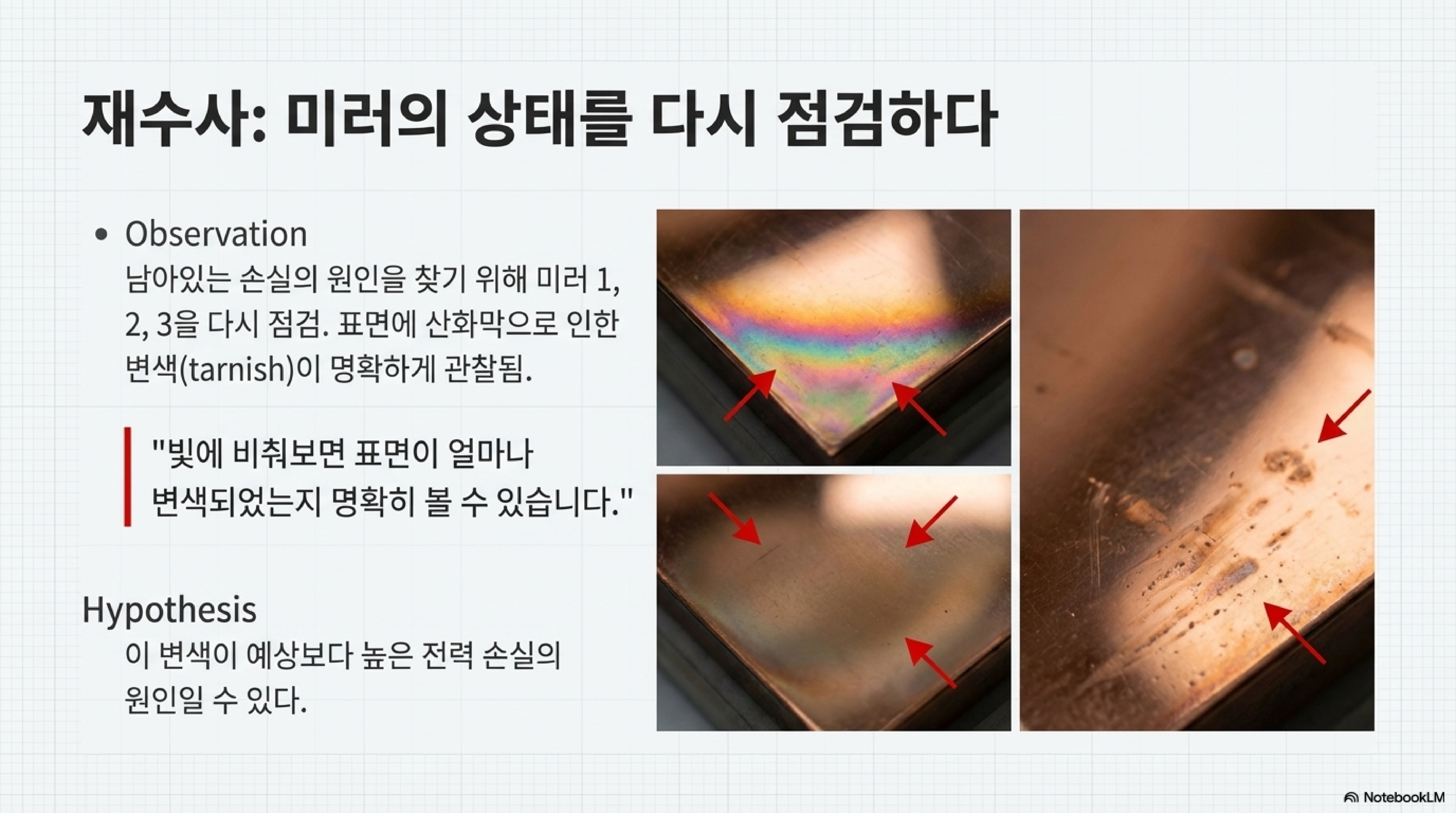 이해할 수 없는 결과는 단순한 표면 오염이 문제가 아님을 시사합니다. 빔 자체의 질이나 미러의 근본적인 특성에 예상치 못한 변화가 생겼을 수 있다는 강력한 증거입니다. 이 경험은 부품 '업그레이드'가 단순히 장착하고 잊어버리면 되는 만능 해결책이 아니라는 교훈을 줍니다. 고성능 부품일수록 그 성능을 유지하기 위한 더 세심하고 지속적인 점검이 필요합니다.