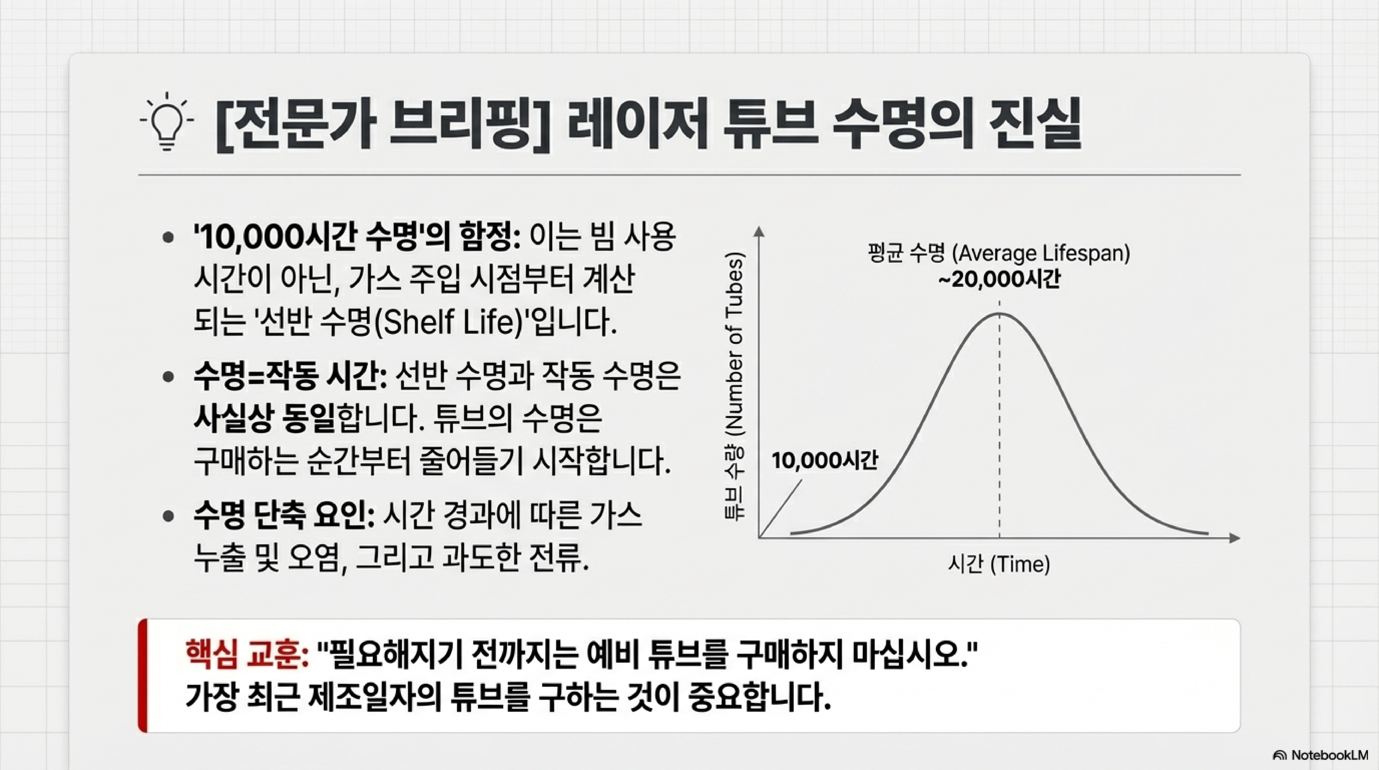 첫 번째 단서는 가장 핵심 부품인 레이저 튜브 그 자체에 숨어 있었습니다. 우리는 흔히 레이저 튜브의 수명을 '작동 시간'으로 생각하지만, 여기에는 충격적인 함정이 있습니다. 레이저 튜브의 수명은 빔 사용 시간이 아니라, 제조일자로부터 시작되는 '유통기한'입니다.