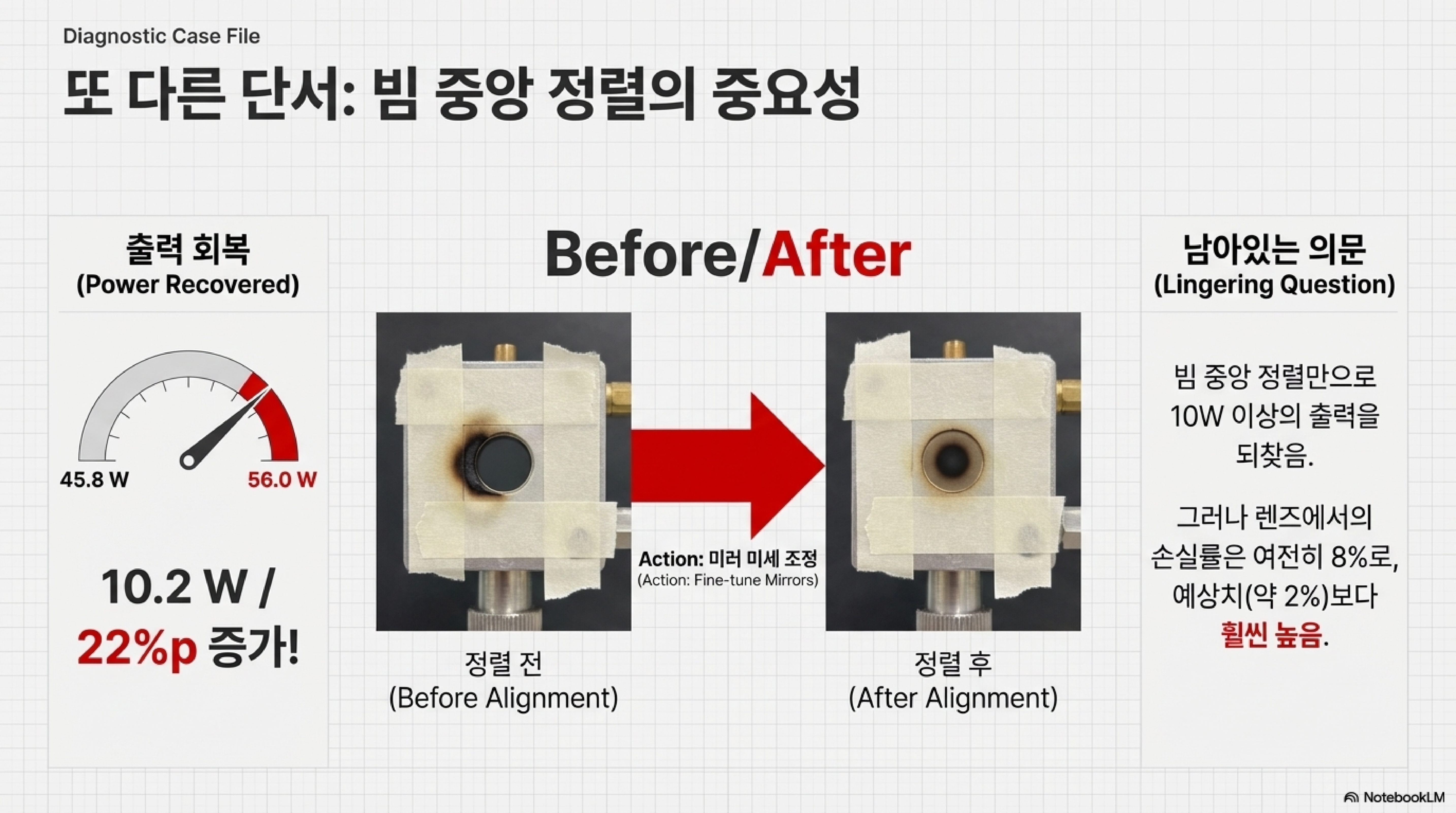 하지만 이 작은 문제를 해결한 결과는 놀라웠습니다. 단순히 빔의 중심을 다시 맞추는 것만으로 무려 10와트(watt)의 출력을 되찾았습니다. 이는 전체 성능에 있어 "경이로운(phenomenal)" 수준의 증가량이었습니다.