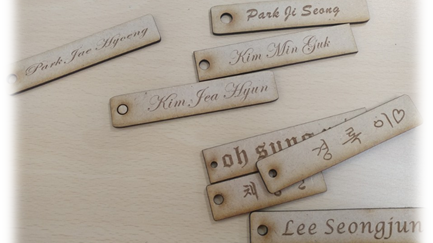 절단과 각인으로 가장 쉽게 할수 있는 이름표 만들기다. 네모난 틀 만들고 글씨만 입력한다. 그 다음 테두리는 자르고 이름 부분은 각인을 한다. 만드는 방법은 다음장에서 설명한다.