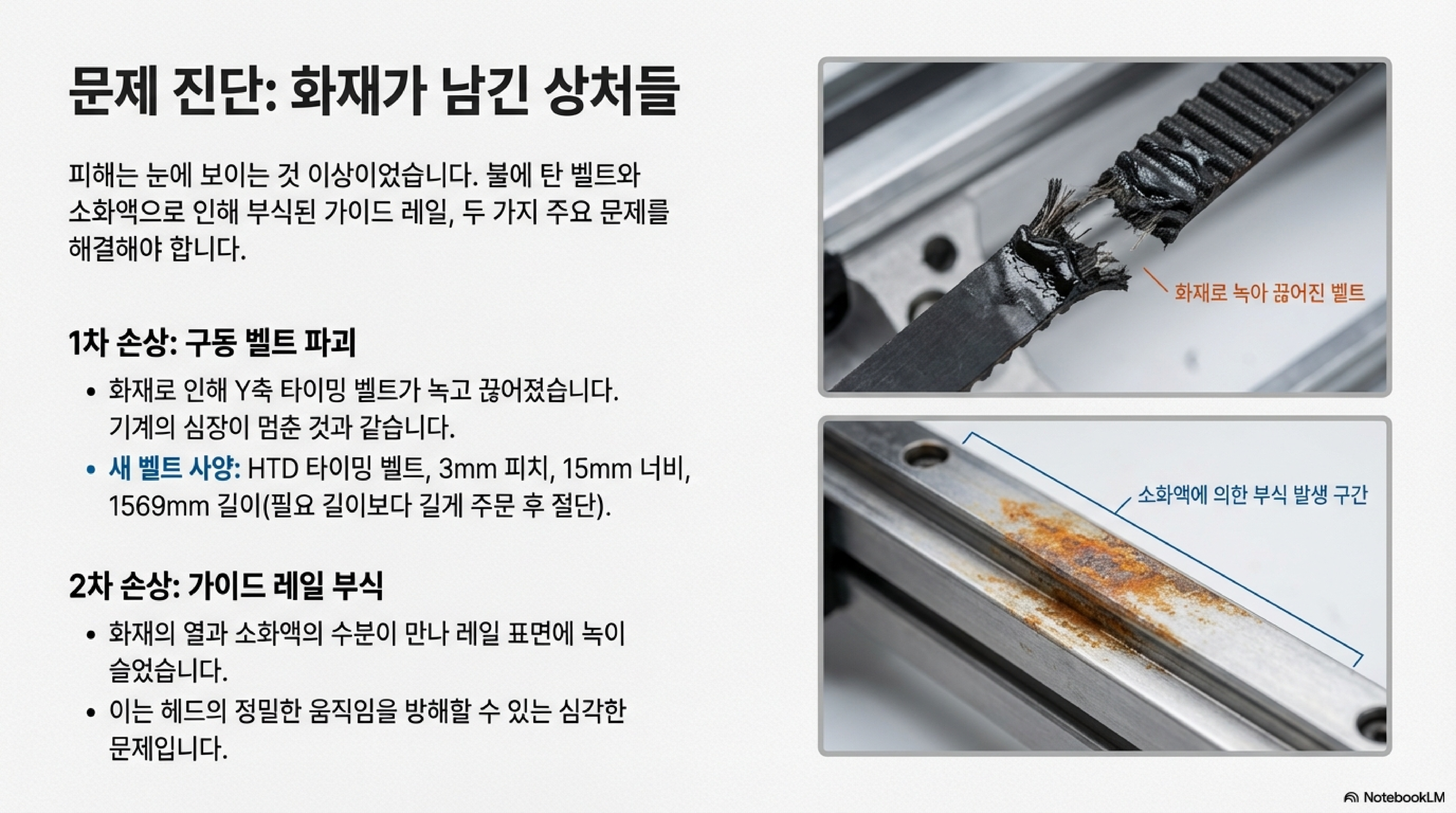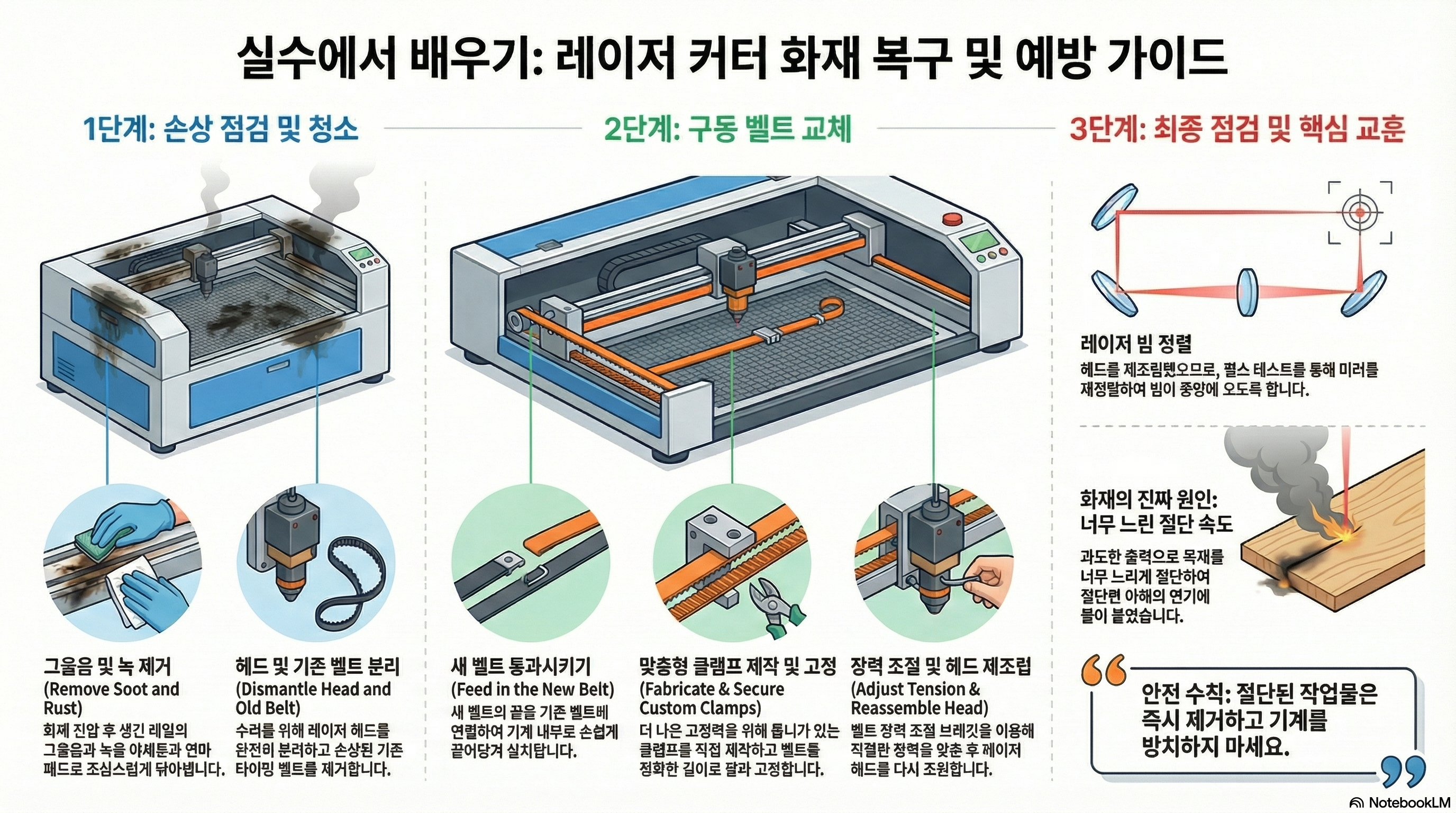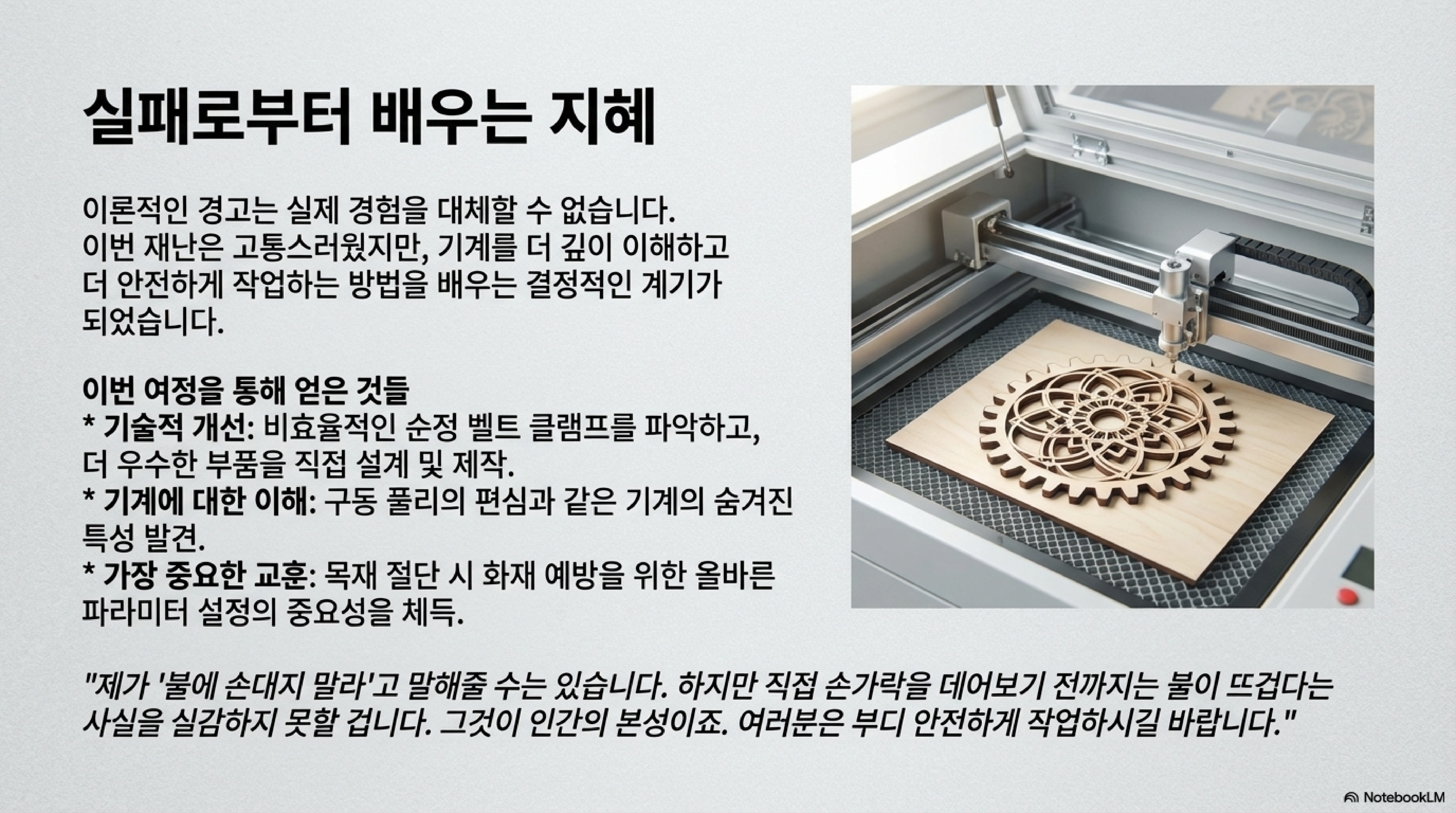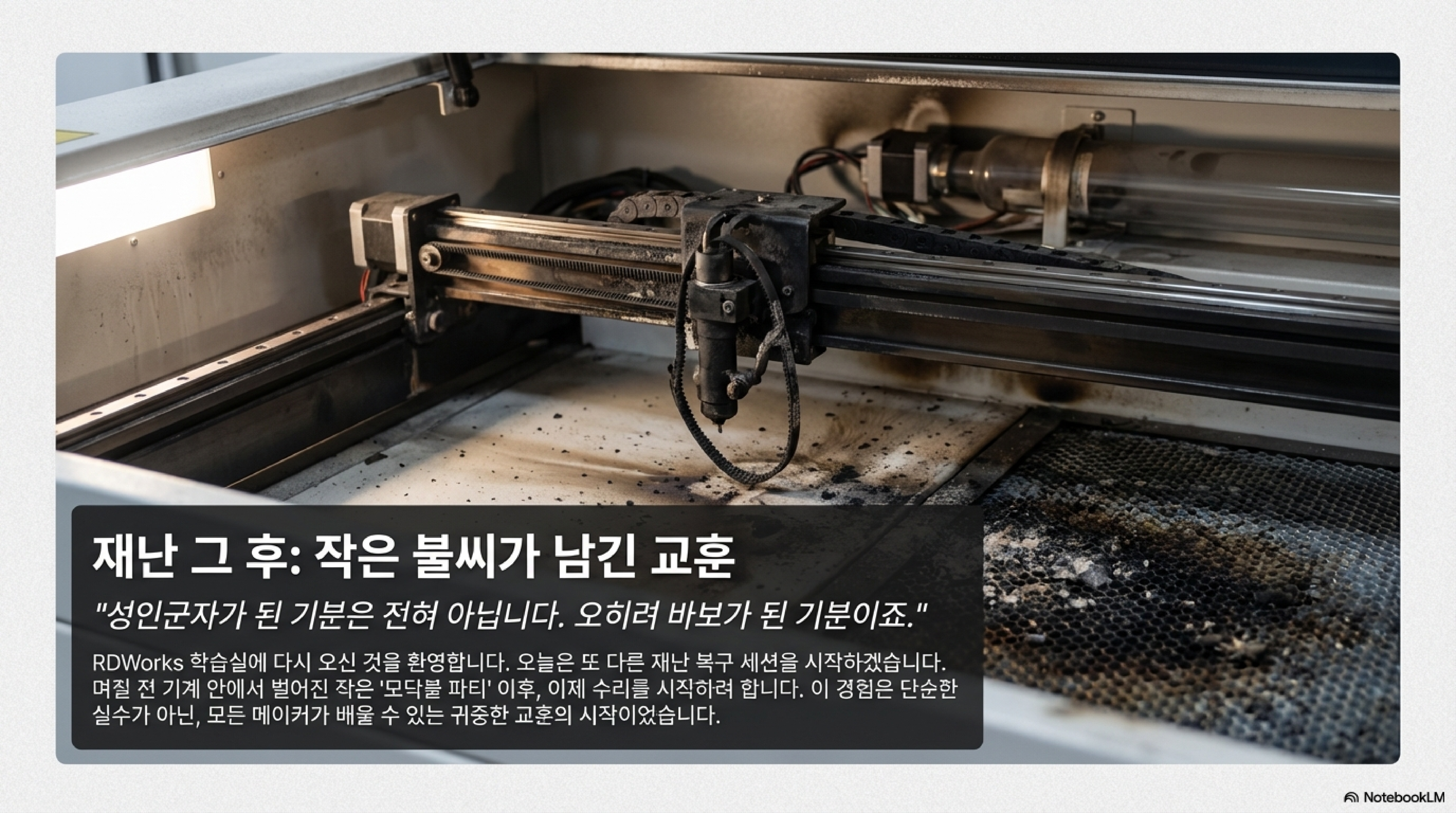레이저 커터에서 연기가 피어오르고 작은 불꽃이 춤추는 것을 보는 것만큼 메이커의 심장을 철렁하게 하는 순간은 없을 것입니다. 저에게도 그런 끔찍한 날이 있었습니다. 제 작업실의 심장과도 같았던 기계가 한순간의 실수로 화염에 휩싸였습니다. 처음에는 그저 망가진 부품을 교체하고 기계를 원상 복구하는 것만이 목표였습니다. 하지만 기계를 분해하고 수리하는 과정에서, 저는 단순히 부품을 교체하는 것 이상의 예상치 못한 발견과 귀중한 교훈들을 얻게 되었습니다. 이 글은 단순한 수리 기록이 아니라, 값비싼 실패를 통해 배운 교훈에 대한 이야기입니다.