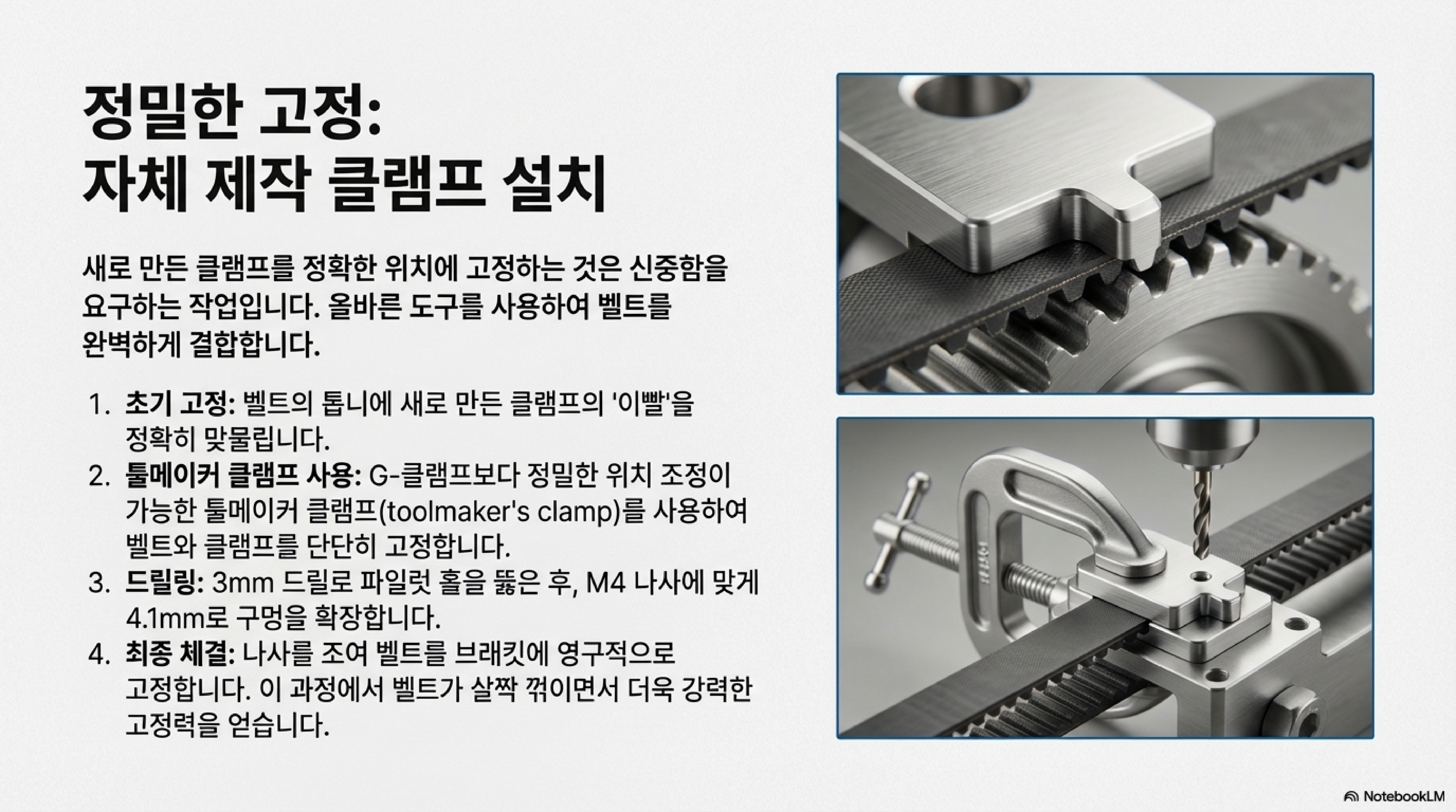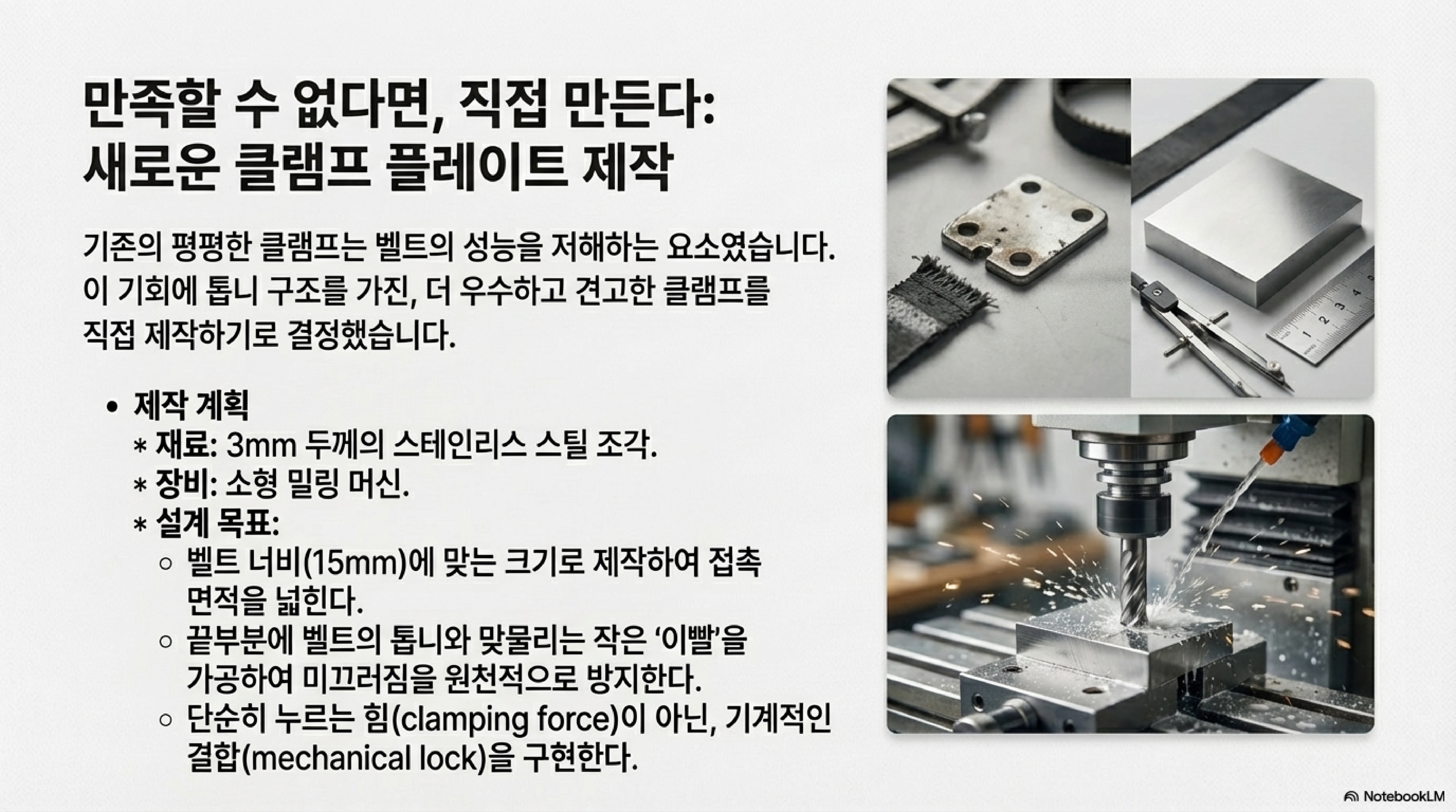 첫째, 타이밍 벨트를 고정하는 클램프 플레이트는 벨트의 톱니와 맞물리는 이빨이 전혀 없이, 그저 평평한 금속판으로 벨트를 눌러 고정하는 방식이었습니다. 저는 이것을 "조잡한 엔지니어링(tacky engineering)"이라고 부를 수밖에 없었습니다. 이런 방식은 강한 힘을 받을 때 벨트가 미끄러질 위험이 있습니다. 저는 작업실에 있는 작은 밀링 머신을 사용해 직접 개선된 부품을 만들기로 했습니다. 기존의 폭 8mm짜리 부품 대신, 벨트의 전체 너비인 15mm짜리 클램프를 새로 제작했습니다. 가장 중요한 개선점은, 벨트의 톱니와 맞물려 미끄러짐을 원천적으로 방지할 수 있도록 끝에 작은 '이빨'을 가공해 넣은 것입니다. 이렇게 하자 훨씬 더 강력하고 안정적인 체결 하중을 확보할 수 있었습니다.