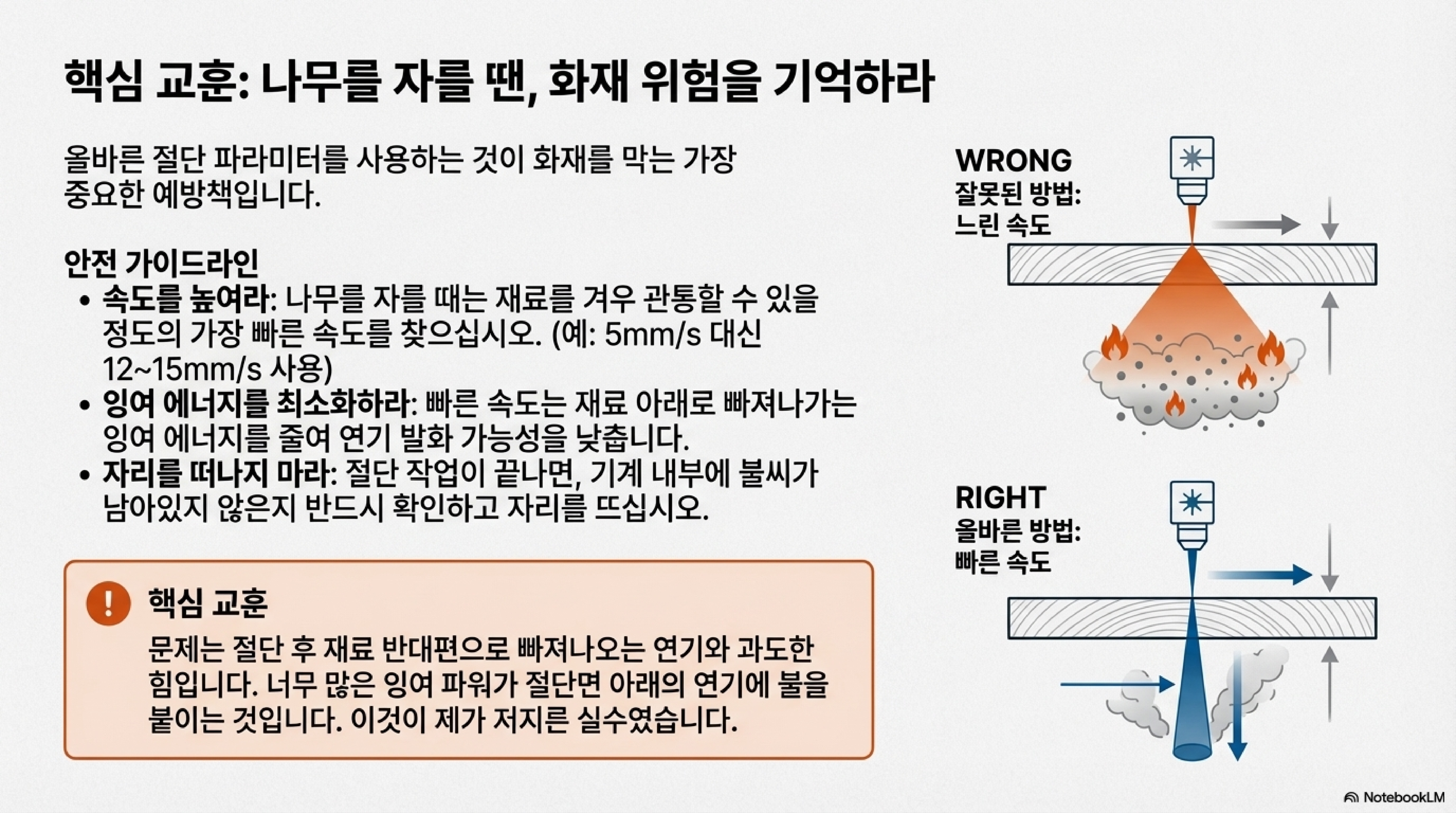 나무와 같은 재료를 너무 느린 속도로 절단하면, 레이저 빔의 에너지가 재료를 완전히 관통하고도 남아돌게 됩니다. 이 과도한 잔류 에너지가 절단면 아래쪽에 모여있던 농축된 연기에 불을 붙인 것이 화재의 직접적인 원인이었습니다. 더 빨리 움직여서 절단면 아래에 잔류 에너지가 남지 않도록 했어야 했습니다. 저 자신도 과거에 다른 사람들에게 했던 조언을 스스로 지키지 못해 벌어진, 뼈아픈 실수였습니다.