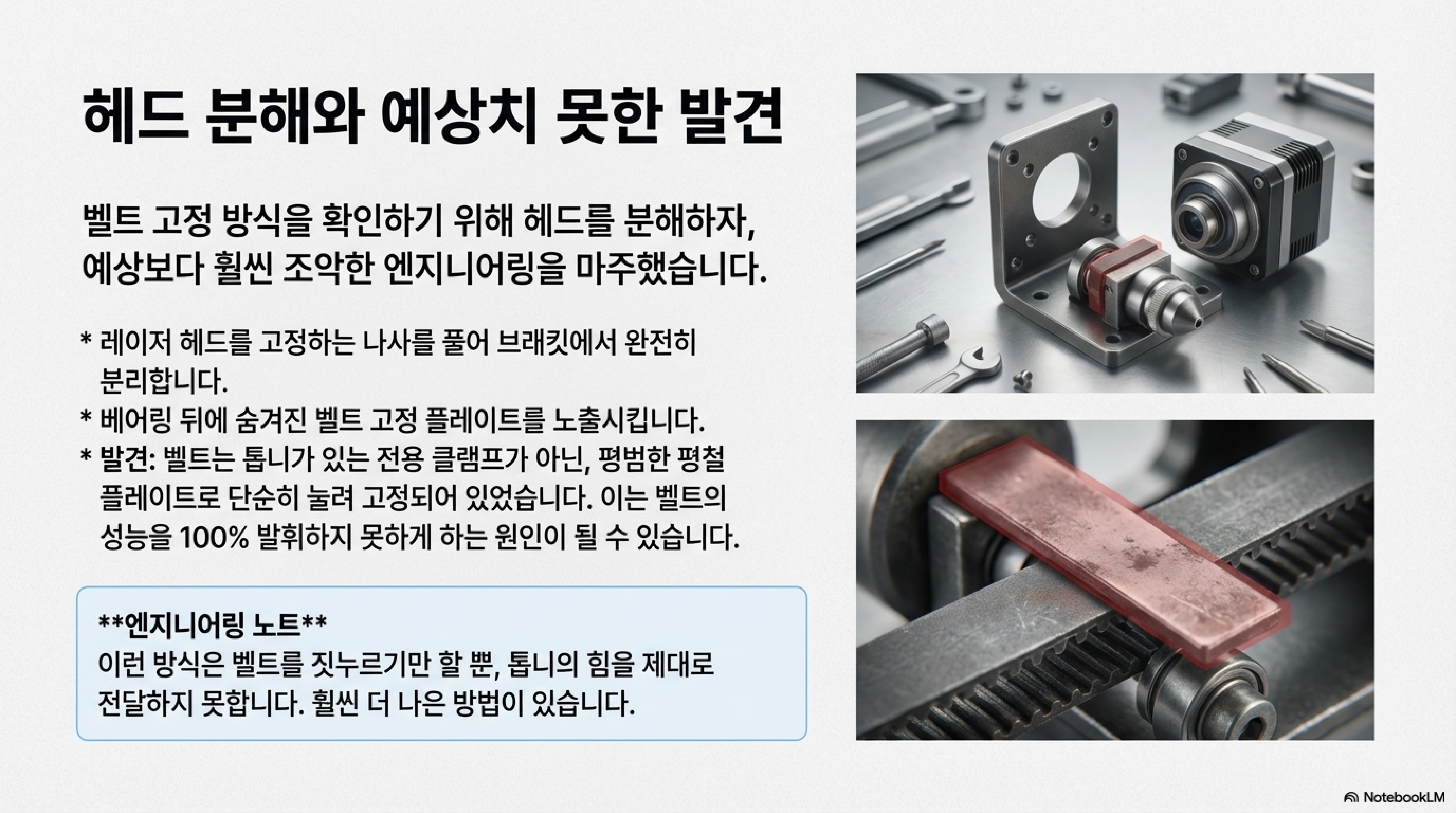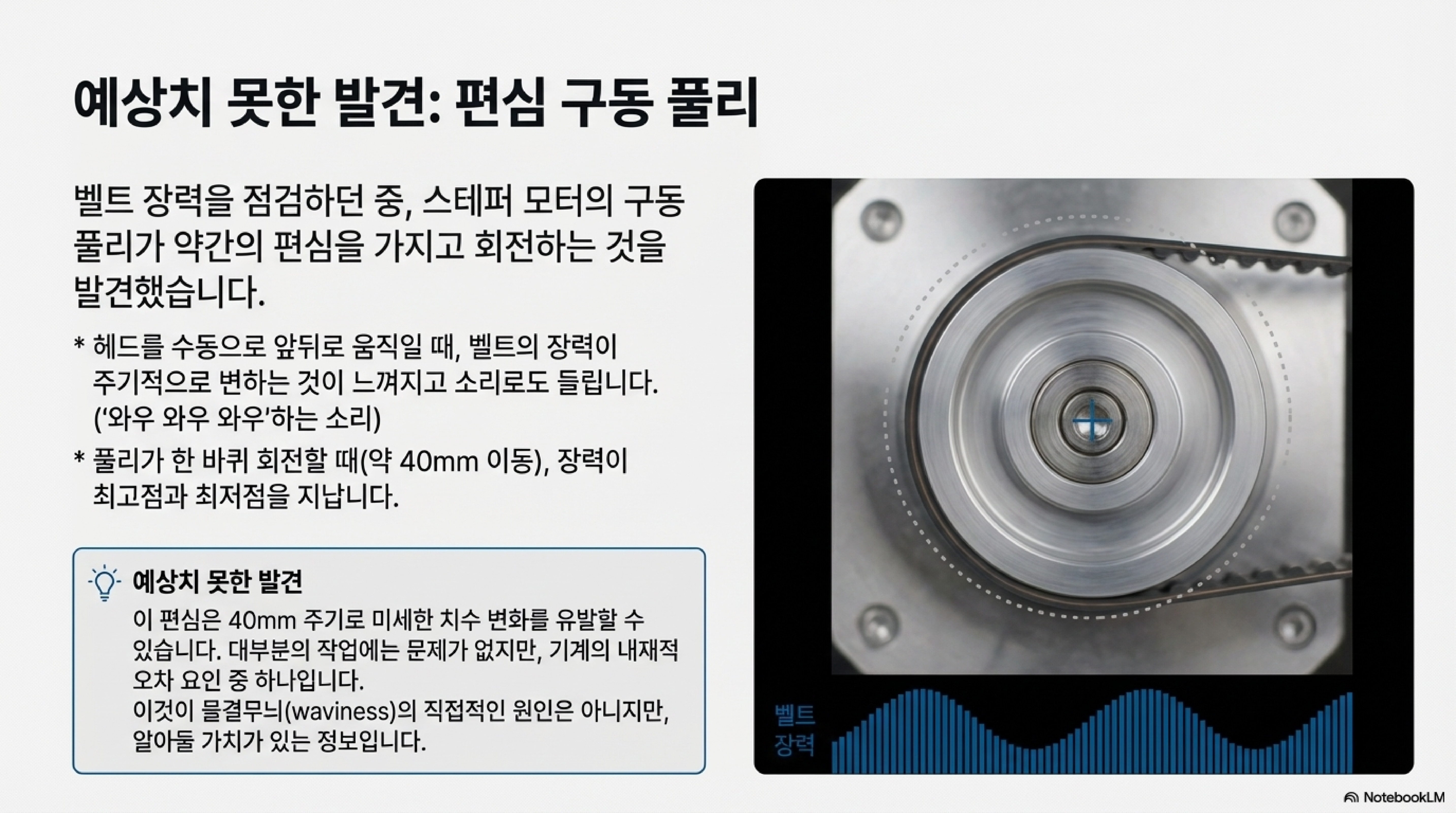 둘째, 새 벨트를 설치하고 장력을 조절하는데, 헤드를 움직일 때마다 '와우, 와우, 와우' 하는 주기적인 소리와 함께 장력이 변하는 것을 느낄 수 있었습니다. 정밀하게 관찰해보니, X축 스테퍼 모터의 구동 풀리 자체가 완벽한 원이 아니라 약간 편심(eccentric)이었습니다. 풀리가 한 바퀴 회전할 때마다 약 40mm의 이동 거리에 해당하는 주기로 장력이 변동하는 것을 확인했습니다. 이것이 작업물의 전체적인 품질에 큰 영향을 미칠 정도는 아니었지만, 미세한 '주기적인 치수 변화'를 유발할 수 있다는 중요한 사실을 발견한 것입니다. 이 경험은 겉보기에 멀쩡한 완제품 내부에도 원가 절감의 흔적이나 예상치 못한 설계 결함이 숨어있을 수 있다는 교훈을 주었습니다.