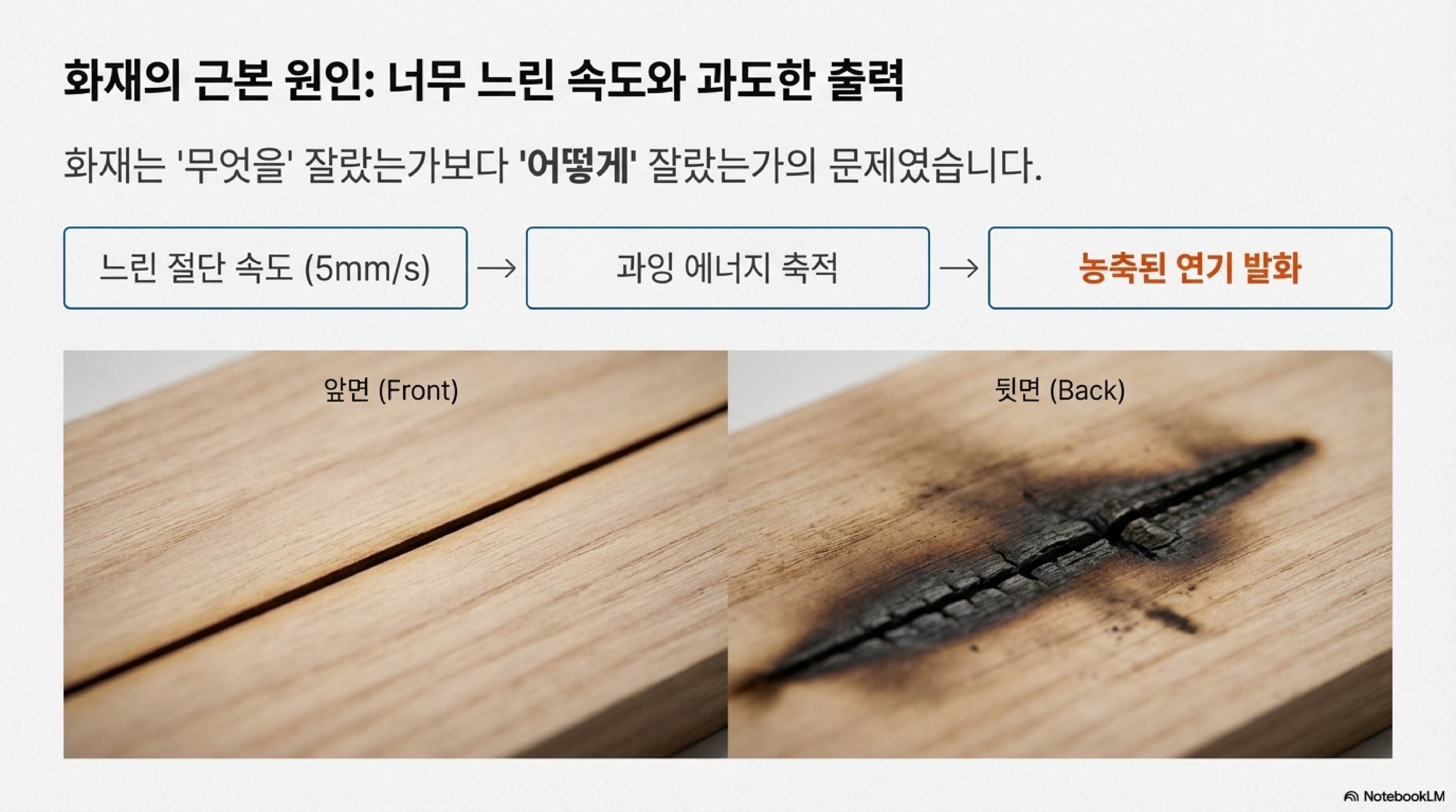 대부분의 사람들은 레이저 커터의 화재 위험을 생각할 때, 출력을 너무 높게 설정했거나 속도를 너무 빠르게 했을 경우를 떠올립니다. 하지만 역설적이게도 제 기계에 불이 난 이유는 정반대였습니다. 바로 절단 속도가 '너무 느렸기' 때문입니다.