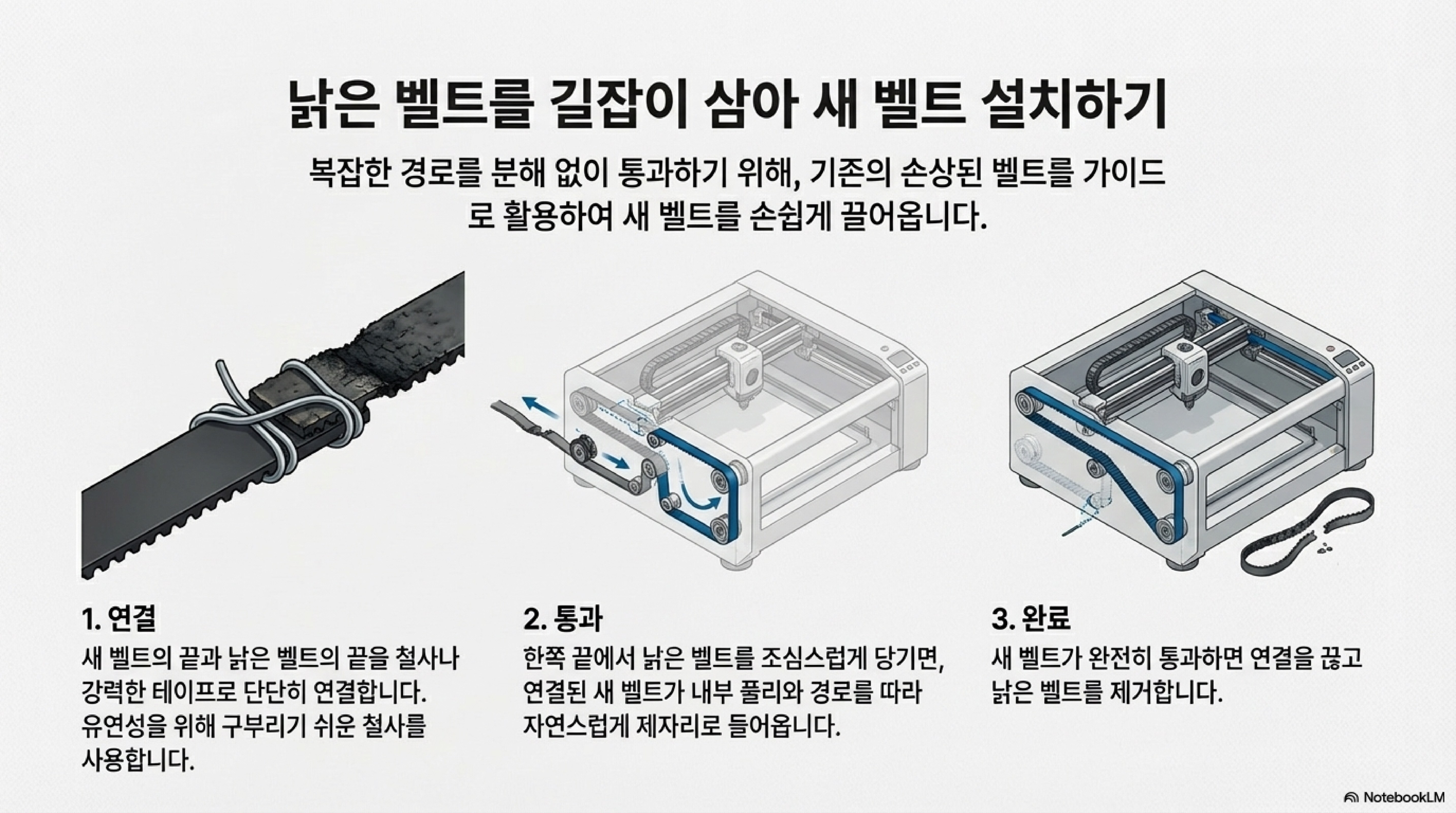 바로 낡고 불에 탄 벨트의 끝과 새 벨트의 끝을 얇은 와이어로 단단히 묶는 것이었습니다. 그리고 기계 반대편에서 낡은 벨트를 조심스럽게 당기기 시작했습니다. 잠시 후, 마치 마법처럼 낡은 벨트가 새 벨트를 이끌고 반대편으로 모습을 드러냈을 때의 안도감이란! 이 간단한 트릭 덕분에 복잡한 분해 과정 없이 새 벨트를 완벽하게 제자리에 위치시킬 수 있었습니다. 이 방법은 특별한 도구 없이도, 낡은 부품을 창의적으로 활용하여 어려운 문제를 쉽게 해결할 수 있다는 것을 보여주는 좋은 예시였습니다. 비슷한 상황에 처한 다른 메이커들에게도 훌륭한 팁이 될 것입니다.
