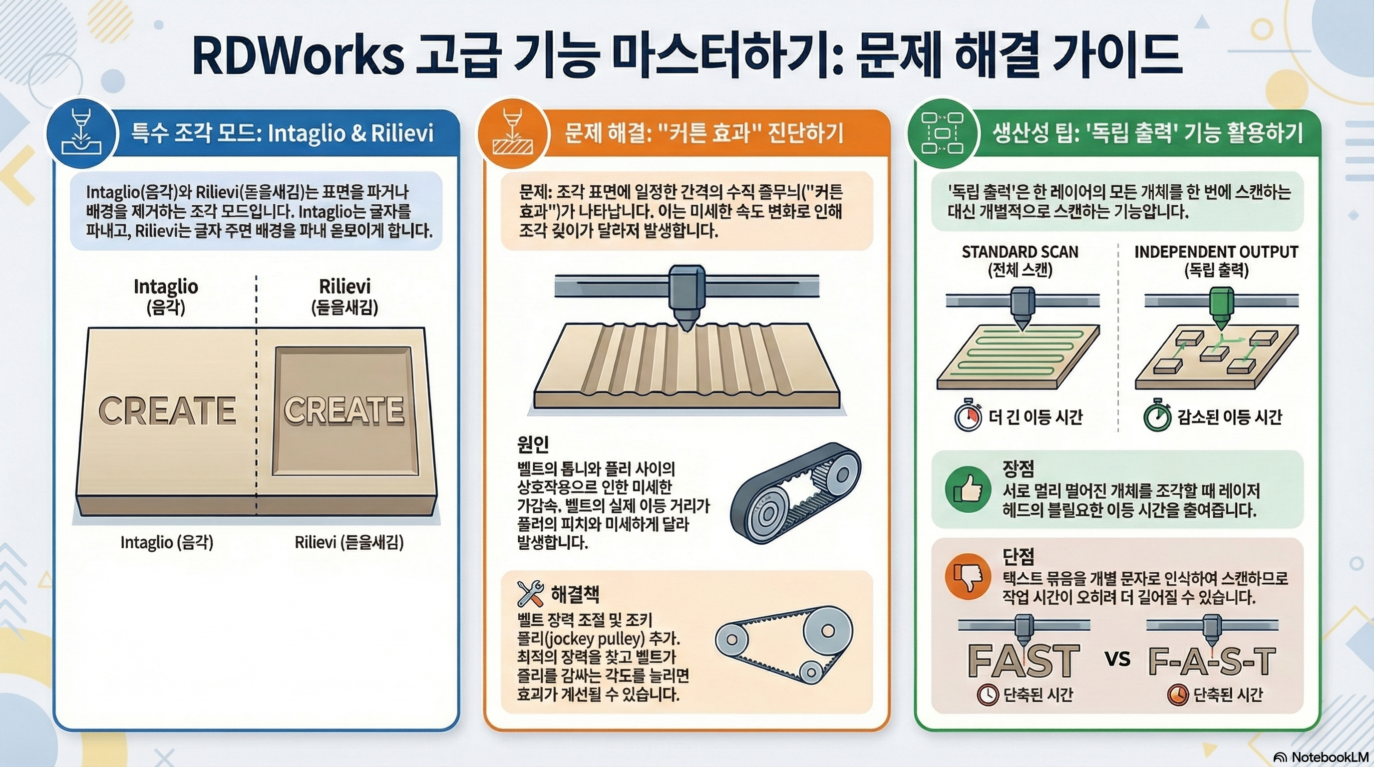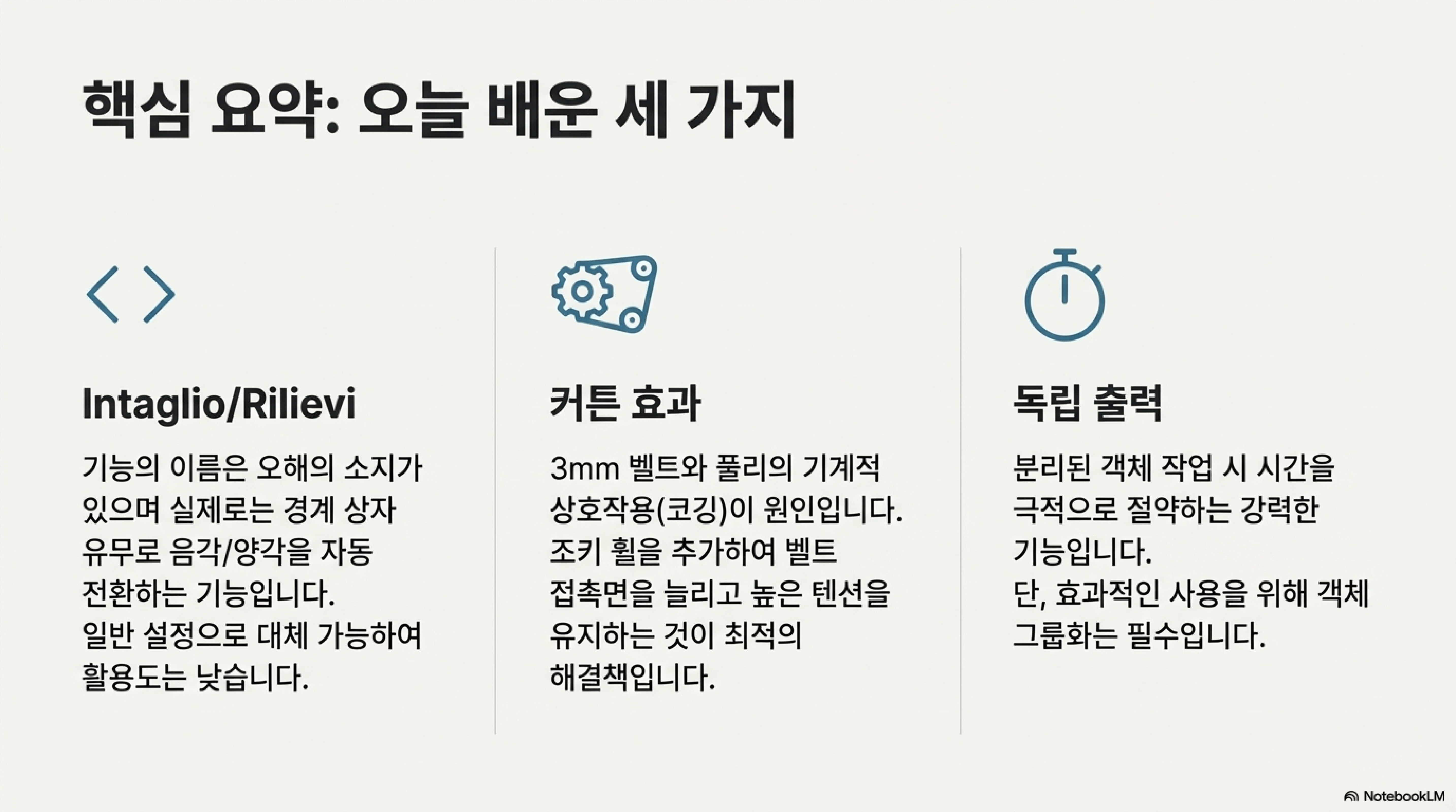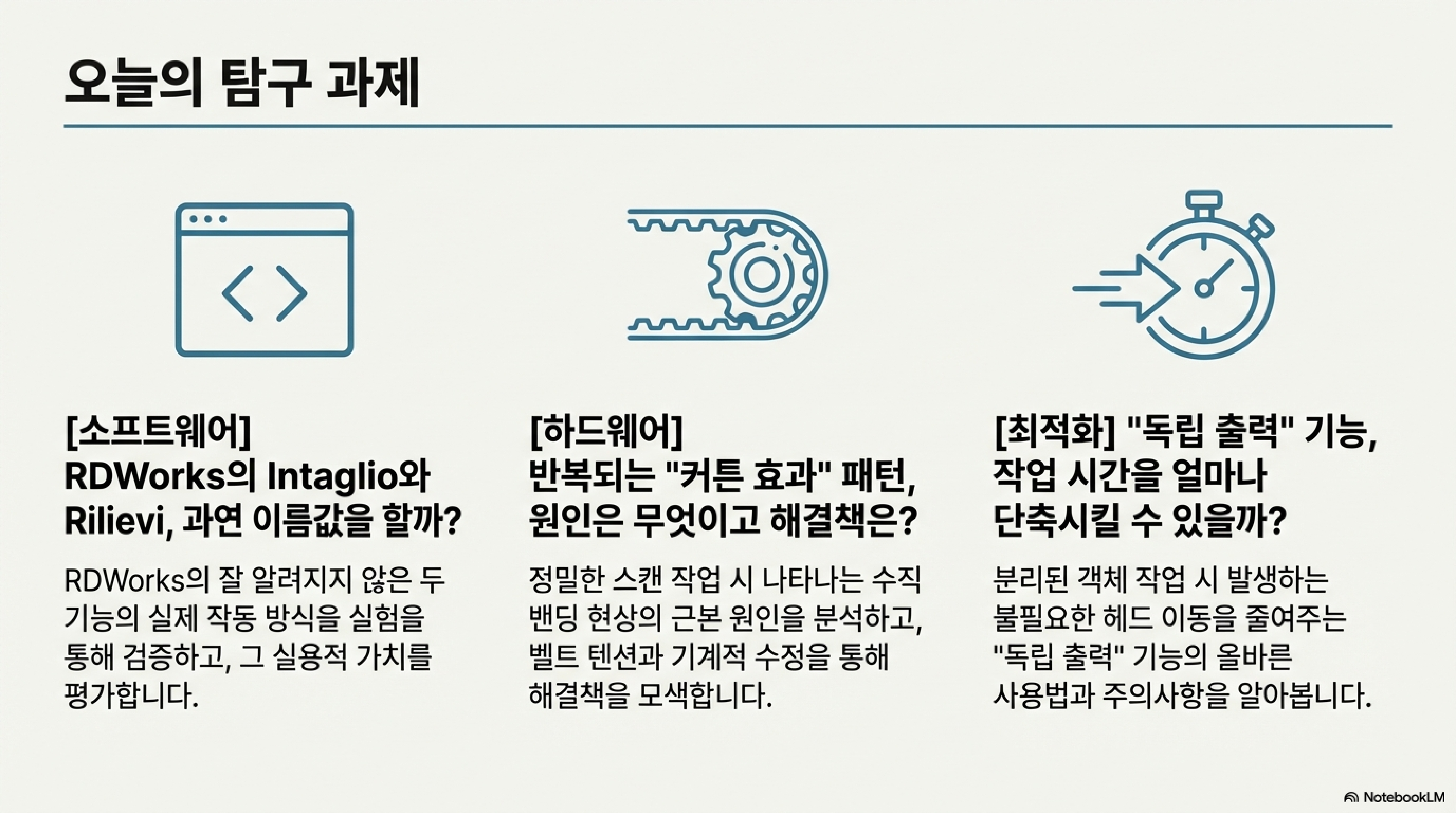 오늘 살펴본 네 가지 사례는 공통된 메시지를 전달합니다. 레이저 커터와 같은 정밀한 도구를 완벽하게 다루기 위해서는 소프트웨어의 기능을 맹신하거나 표면적인 현상에만 머물러서는 안 된다는 것입니다. 끊임없이 '왜?'라고 질문하고, 가설을 세우고, 직접 부품을 만들어 테스트하며 그 작동 원리를 깊이 이해하려는 노력만이 우리를 진정한 마스터의 길로 이끌 것입니다.