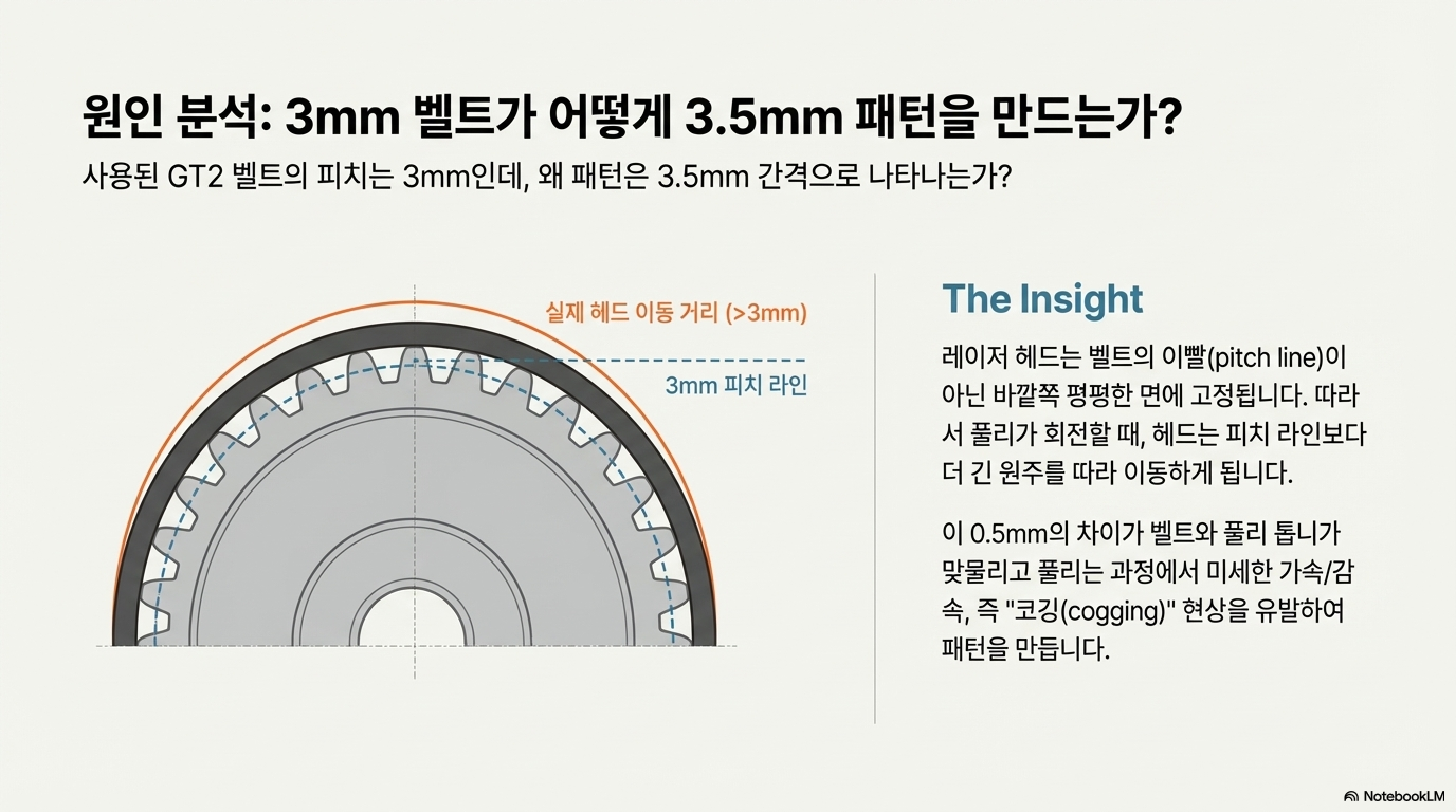 - 결론: 이 현상은 벨트의 톱니가 풀리와 맞물리거나 풀릴 때 발생하는 미세한 가속과 감속, 즉 '코깅(cogging)' 현상 때문에 발생합니다. 흥미로운 점은 이 패턴이 작업 속도와는 전혀 무관하다는 것입니다. 고속(200mm/s)과 저속(50mm/s)에서 모두 동일한 3.5mm 간격의 패턴이 나타났기 때문입니다.