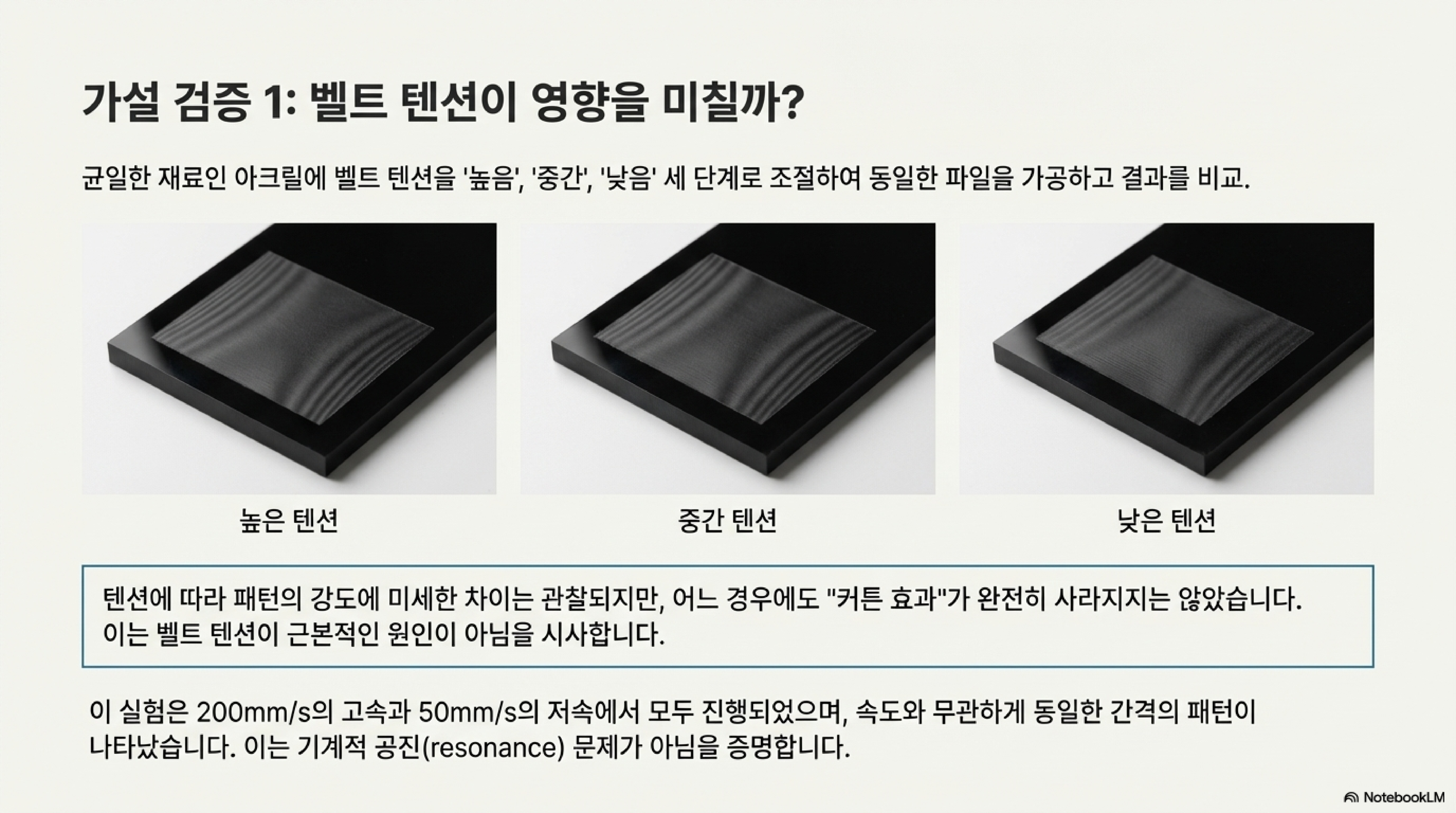 '커튼 효과'의 원인이 벨트와 풀리의 상호작용이라면, 벨트의 장력을 조절하면 해결할 수 있지 않을까요? 이 가설을 검증하기 위해 높은 장력, 중간 장력, 낮은 장력 세 가지 조건에서 테스트가 진행되었습니다. 아크릴과 같이 균일한 재료에서 테스트한 결과, 장력 변화가 '커튼 효과'에 미치는 영향은 거의 미미했습니다.