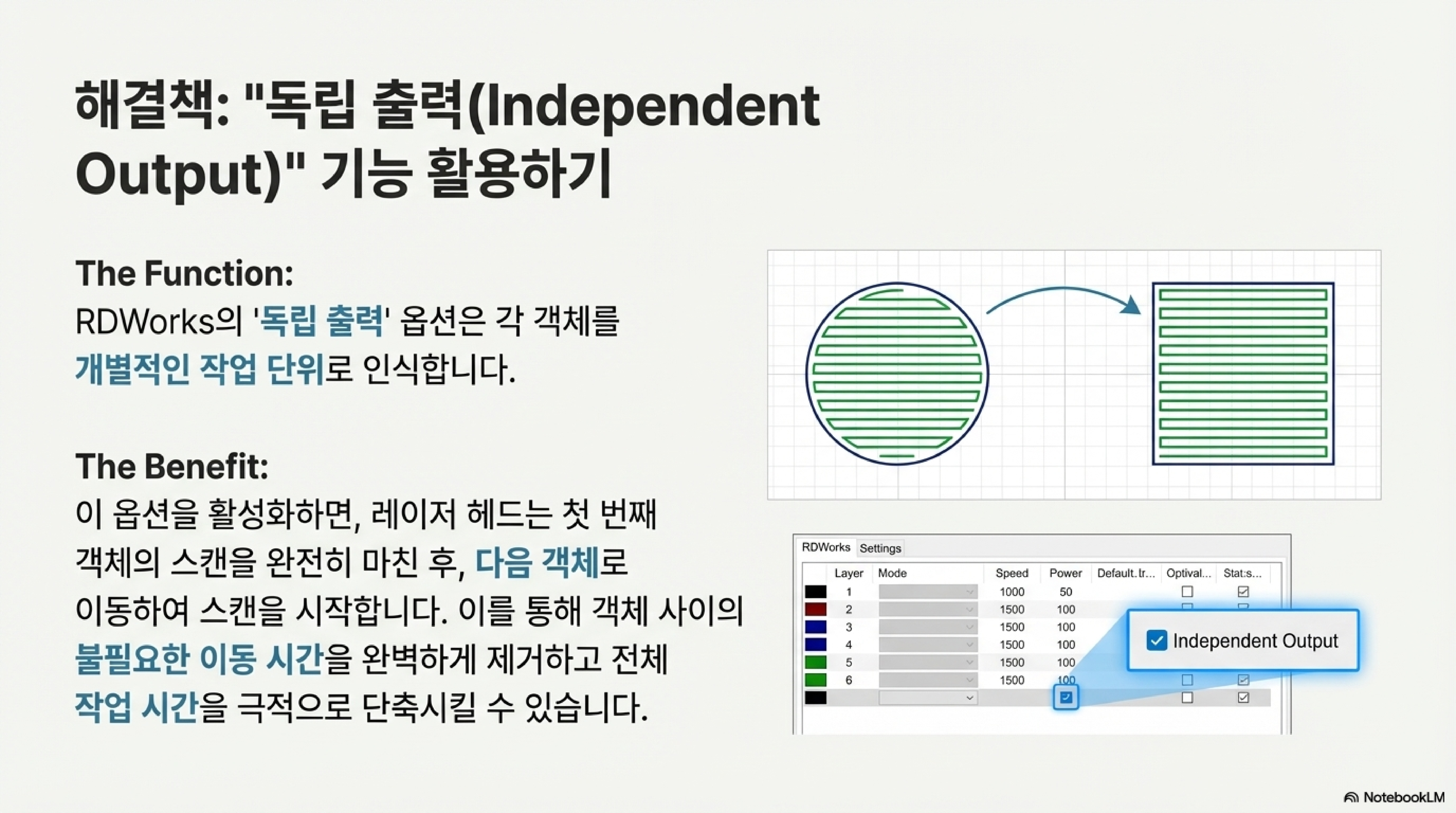 RDWorks에는 '독립 출력(Independent Output)'이라는 흥미로운 기능이 있습니다. 작업 영역에 여러 객체가 멀리 떨어져 있을 때, 전체 영역을 가로지르며 스캔하는 대신 각 객체를 개별적으로 스캔하여 불필요한 이동 시간을 줄여주는 효율적인 기능으로 알려져 있습니다.