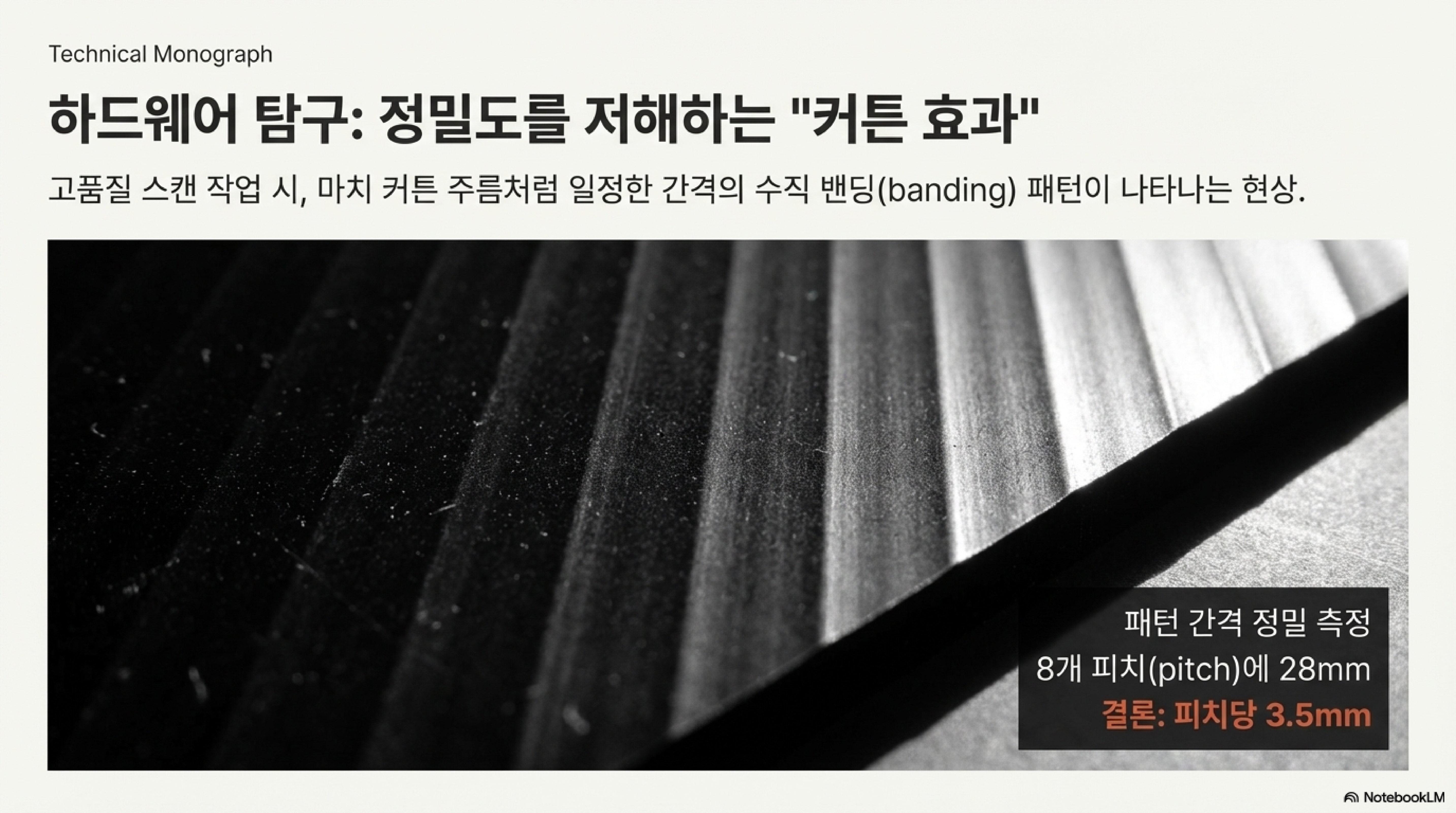 - 결정적 증거: 더 깊이 관찰하자, 이 '커튼 효과'가 일정하게 나타나는 것이 아니라 약 40mm 주기로 패턴이 강해졌다가 약해지기를 반복하는 것을 발견했습니다. 이 40mm는 정확히 구동 풀리가 한 바퀴 회전할 때 헤드가 이동하는 거리와 일치했습니다. 이로써 문제의 원인이 벨트와 풀리의 상호작용이라는 가설이 확증되었습니다.