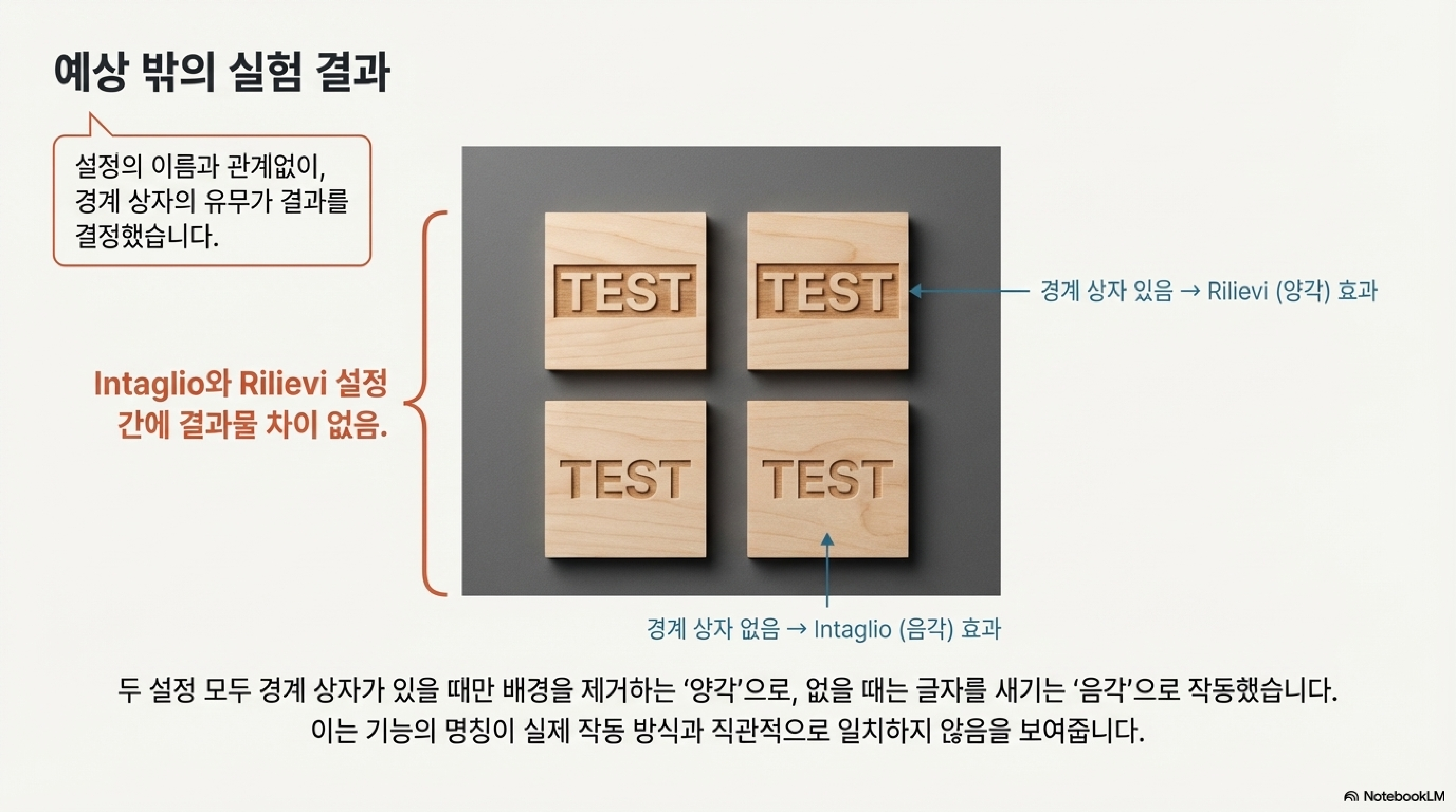 결과는 놀라웠습니다. 두 가지 완전히 다른 설정('인탈리오'와 '릴리프')을 적용했음에도 불구하고, 조각할 영역을 지정하는 경계 상자(bounding box)가 없을 때는 모두 똑같은 결과가 나왔습니다. 즉, 양각을 기대했던 '릴리프' 설정조차 글자를 파내는 일반적인 '음각(incision engraving)'으로 작동한 것입니다. 경계 상자로 배경을 명확히 지정해 주었을 때만 릴리프 기능이 의도대로 작동했습니다.