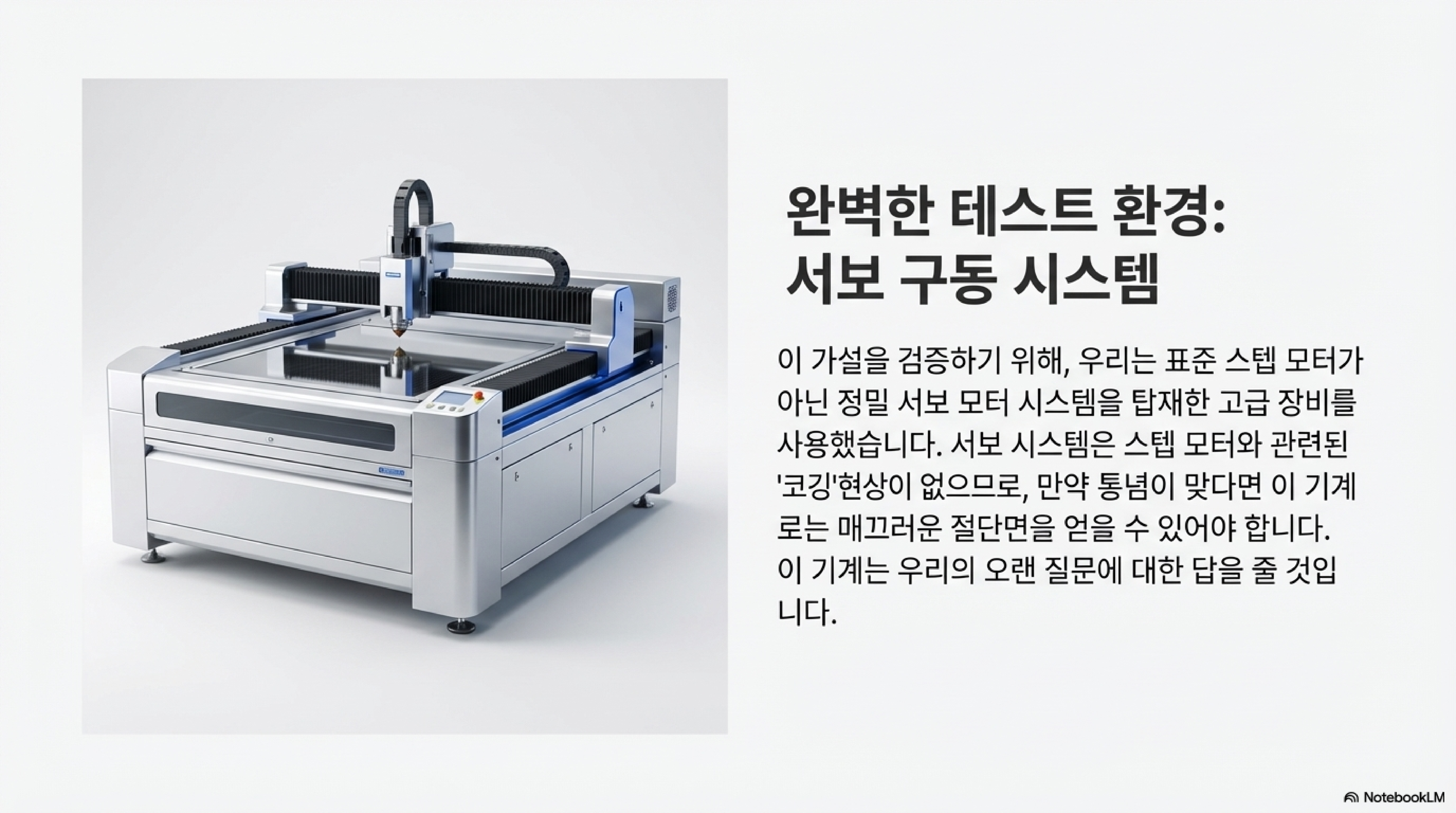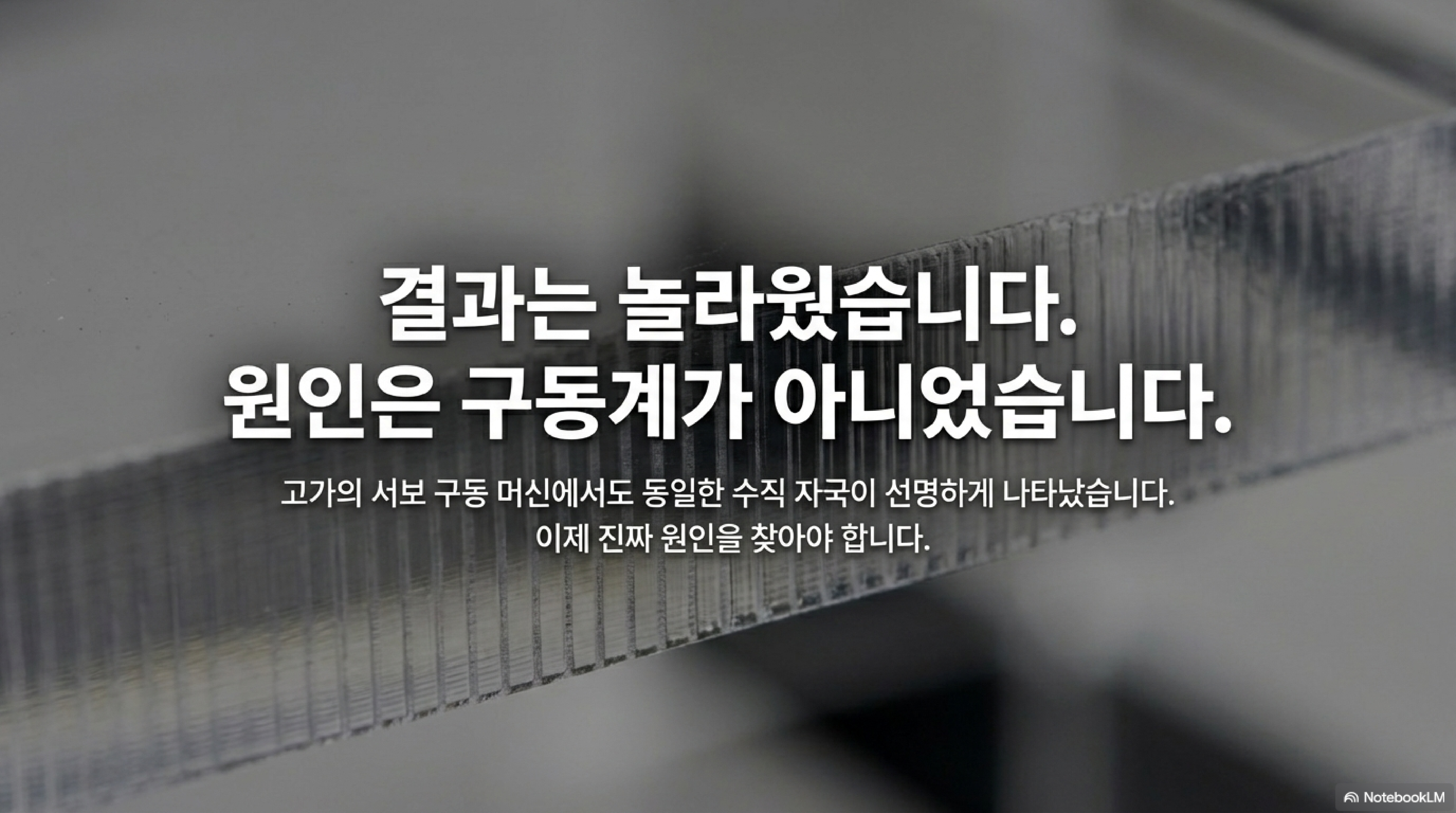 많은 사용자들이 아크릴 절단면에 생기는 줄무늬가 스텝 모터의 미세한 움직임이나 구동 벨트의 톱니 때문에 생긴다고 믿습니다. 기계가 한 스텝씩 움직일 때마다 절단면에 흔적을 남긴다는, 일견 그럴듯한 추측입니다. 하지만 이 가설은 한 가지 간단한 실험으로 인해 흔들리게 됩니다. 기존의 스텝 모터 방식이 아닌, 훨씬 더 부드럽게 움직이는 서보 시스템을 갖춘 새로운 기계에서 동일한 아크릴을 절단했을 때도 결과는 같았습니다. 절단면에는 여전히 똑같은 수직 줄무늬가 선명하게 나타났습니다. 이는 줄무늬의 원인이 기계의 구동 방식이 아니라는 결정적인 증거였습니다.