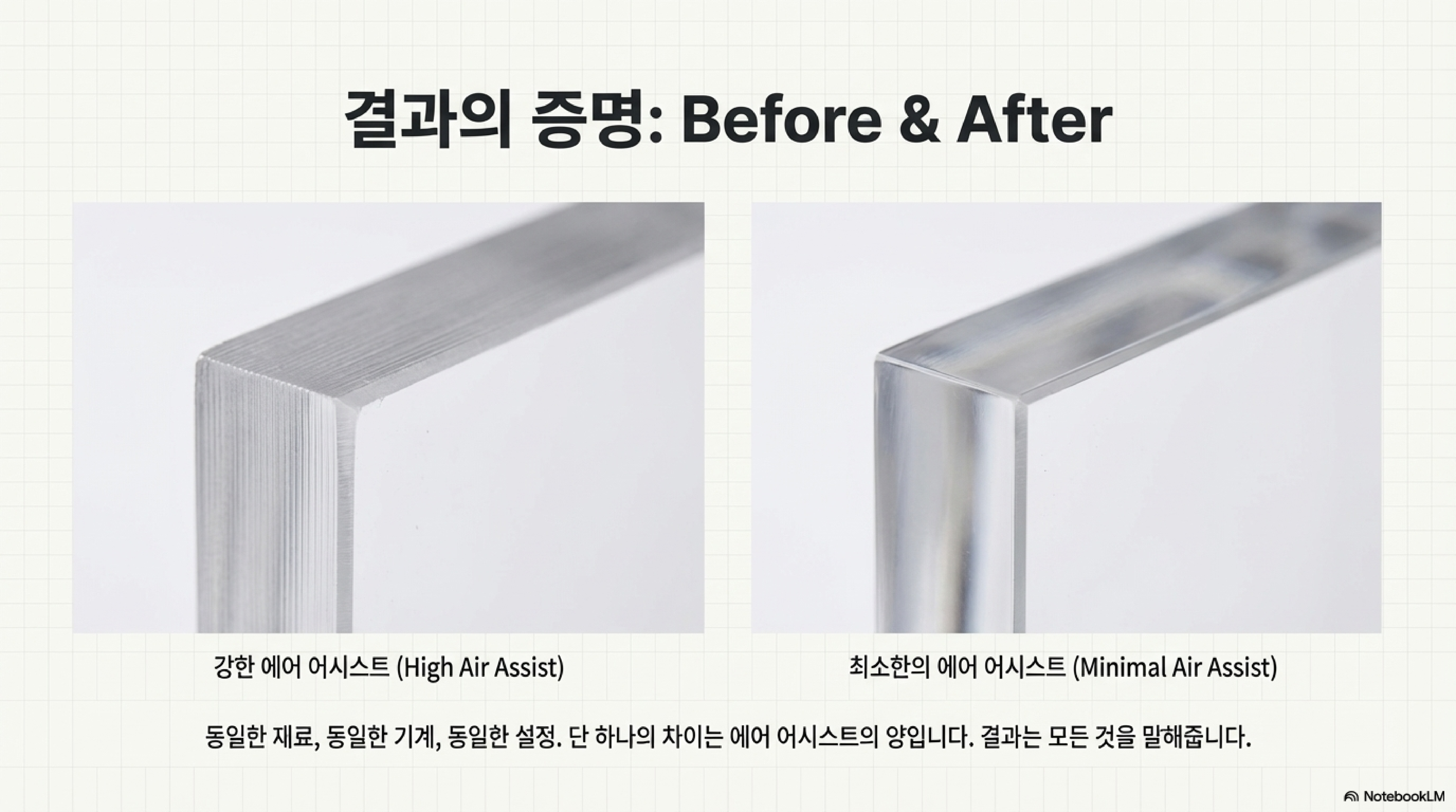 "공기가 적을수록 훨씬 더 나은 광택 마감을 얻을 수 있습니다. 공기가 많으면 연기를 더 잘 제거할 수는 있겠지만, 실제로는 절단 효율을 감소시키고 최악의 마감면을 만듭니다. 왜냐하면 절단면이 훨씬 더 빨리 식어버리기 때문입니다."