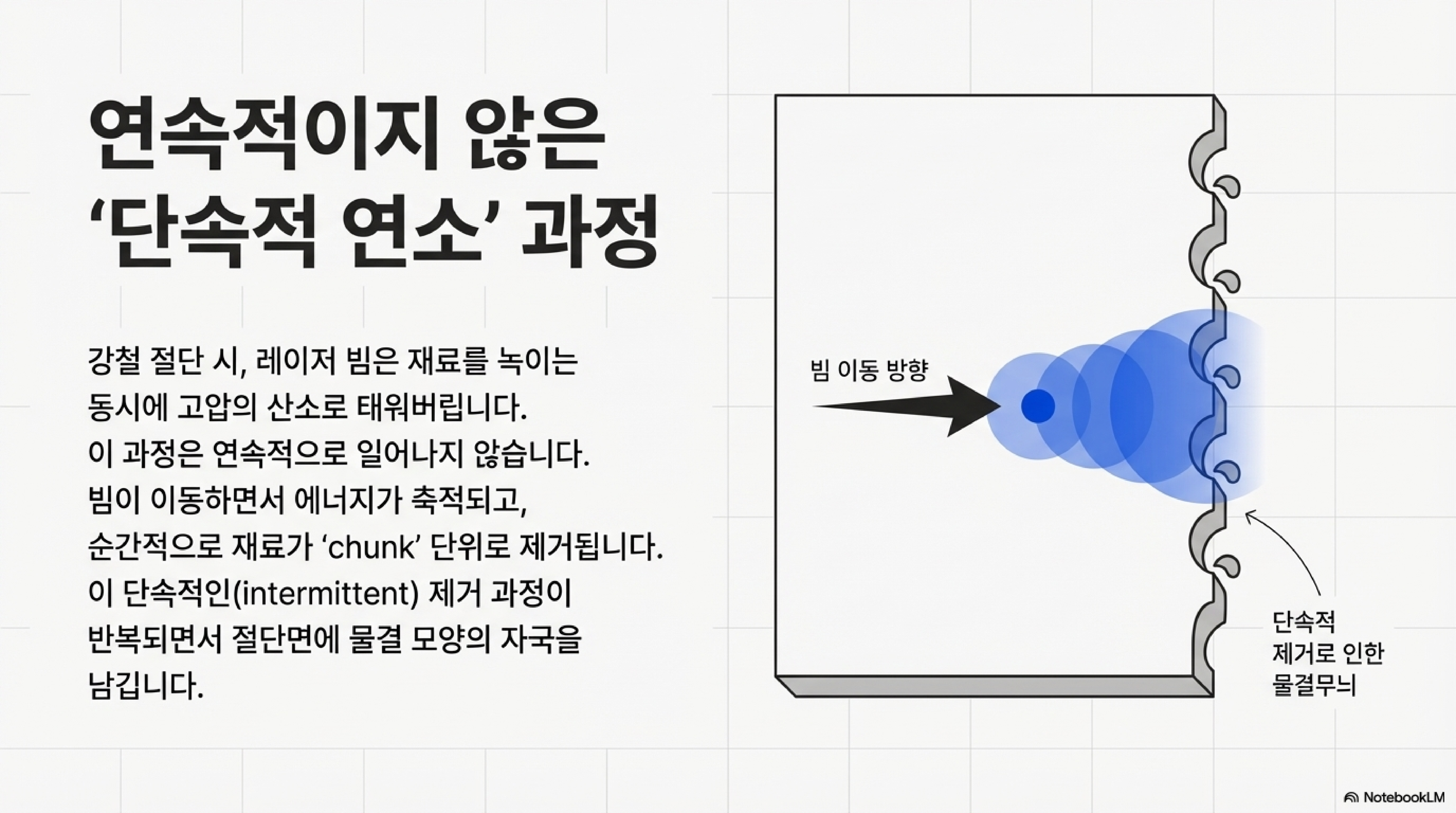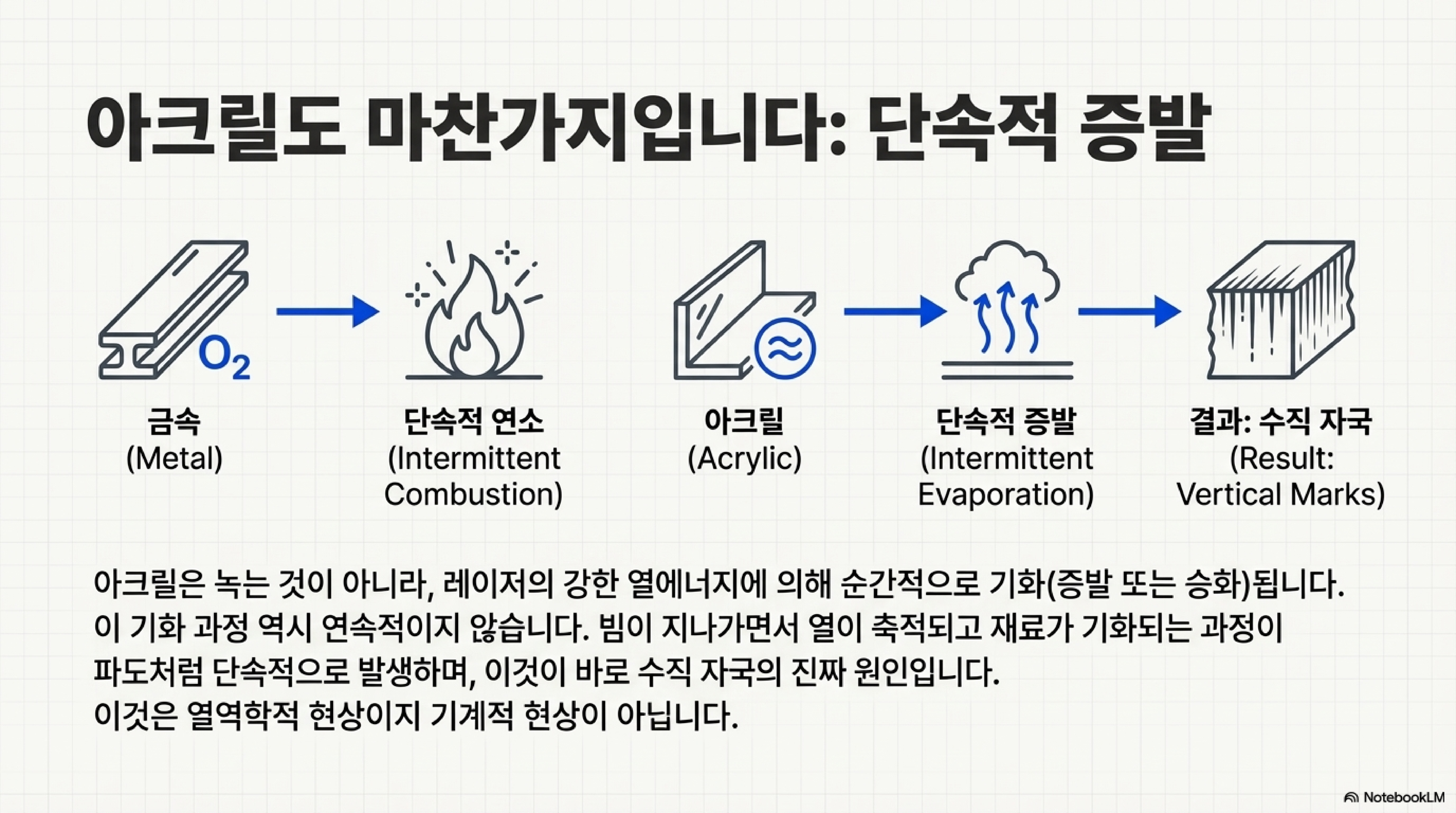 그렇다면 진짜 원인은 무엇일까요? 정답은 '레이저 절단 과정 자체'에 내재되어 있습니다. 이 현상을 이해하기 위해 산소를 보조제로 사용하는 금속 절단 과정을 하나의 유용한 비유로 살펴볼 수 있습니다. 레이저 절단은 버터처럼 재료를 매끄럽게 녹여내는 연속적인 과정이 아닙니다. 오히려 빔이 앞으로 나아갈 때마다 그 주변 영역의 재료를 순간적으로 증발시키거나 태워 '떼어내는(chunking away)' 간헐적인 과정에 가깝습니다. 즉, 빔은 계속해서 움직이지만 재료 제거는 불연속적인 '영향권' 안에서 겹겹이 일어납니다. 아크릴이 증발하고 승화하는 과정에서도 이와 동일한 원리가 적용되어 규칙적인 줄무늬를 남기게 된다고 추정할 수 있습니다.