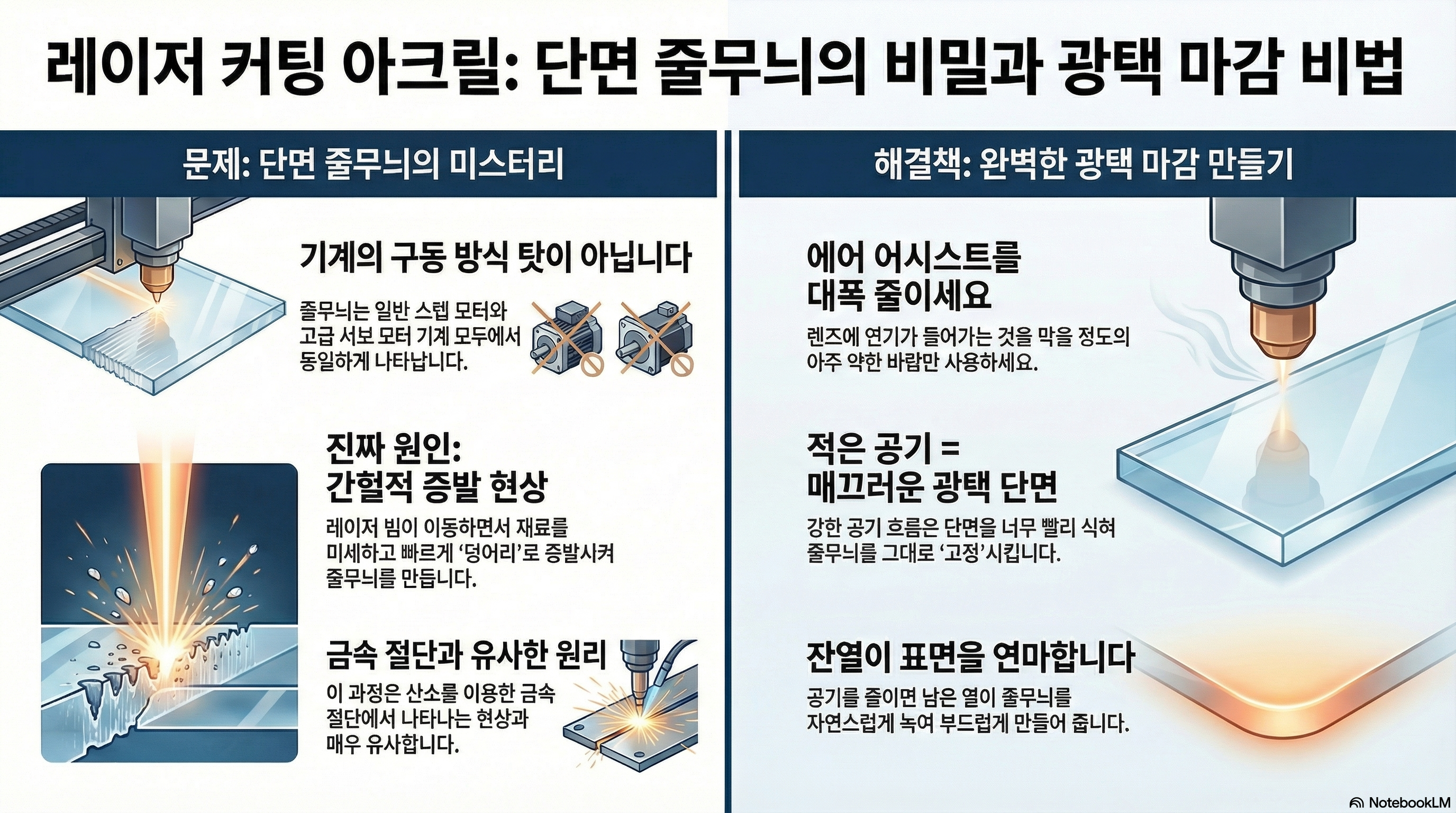 레이저 커터를 사용하는 메이커라면, 특히 아크릴을 다룰 때 한 번쯤은 마주쳤을 고민이 있습니다. 바로 절단면에 나타나는 보기 흉한 수직 줄무늬(striations)입니다. 많은 이들이 이 문제를 해결하기 위해 기계 설정을 바꾸거나, 더 비싼 장비로 업그레이드하면 해결될 것이라 생각합니다. 하지만 만약 그 줄무늬가 기계의 성능이나 설정 문제가 아니라면 어떨까요? 진실은 우리가 생각했던 것보다 훨씬 더 흥미롭고 예상 밖의 곳에 숨어있을지 모릅니다. 완벽한 절단면을 향한 여정, 그 속에 숨겨진 놀라운 진실 세 가지를 지금부터 공개합니다.