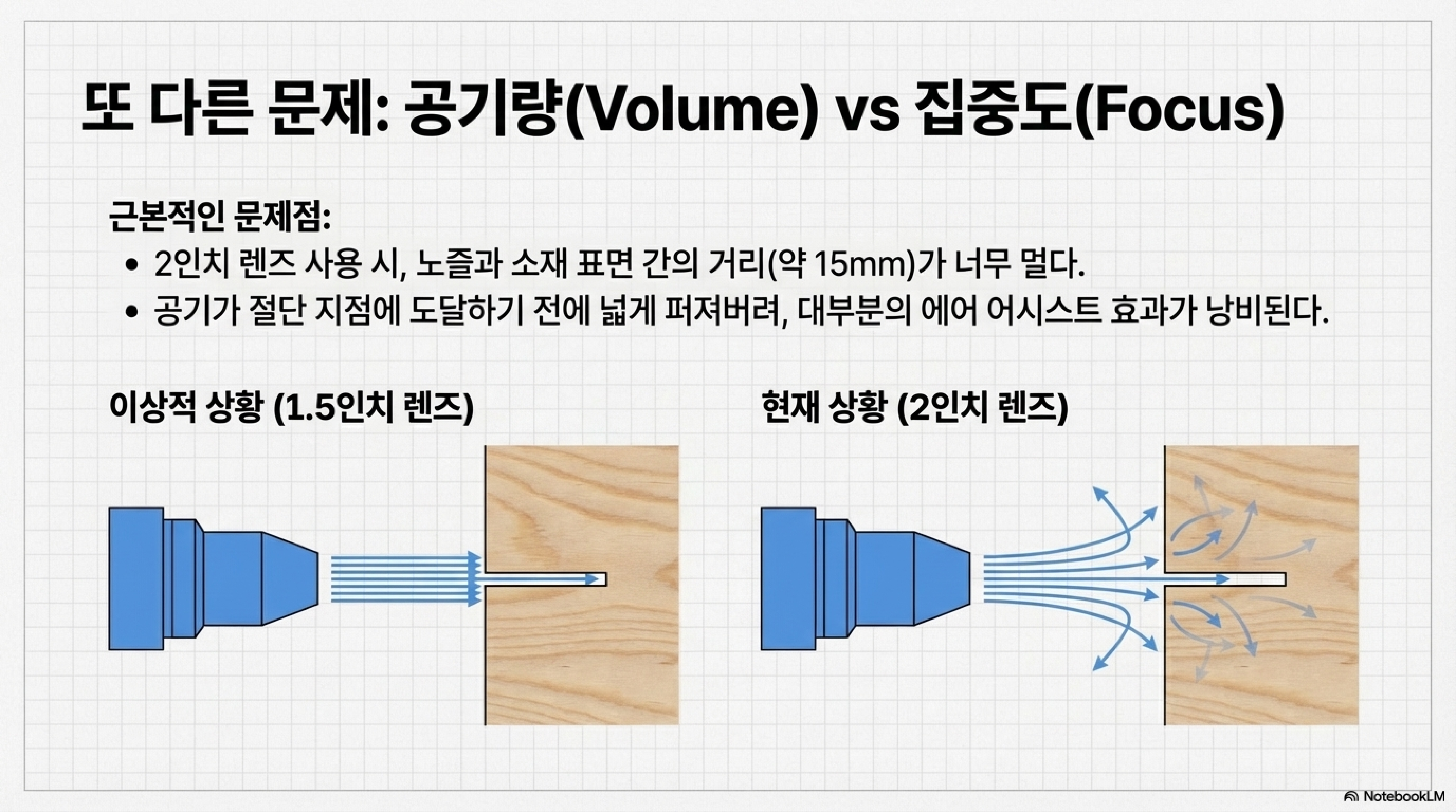 병목 현상을 해결했지만, 2인치 렌즈를 사용할 때 또 다른 비효율이 존재했습니다. 노즐 끝에서 재료 표면까지의 거리가 15mm나 되어, 에어 어시스트의 공기가 절단면에 닿기 전에 사방으로 흩어져 버리는 문제였습니다. 저는 이로 인해 공기의 약 80%가 낭비되고 있다고 판단했습니다.