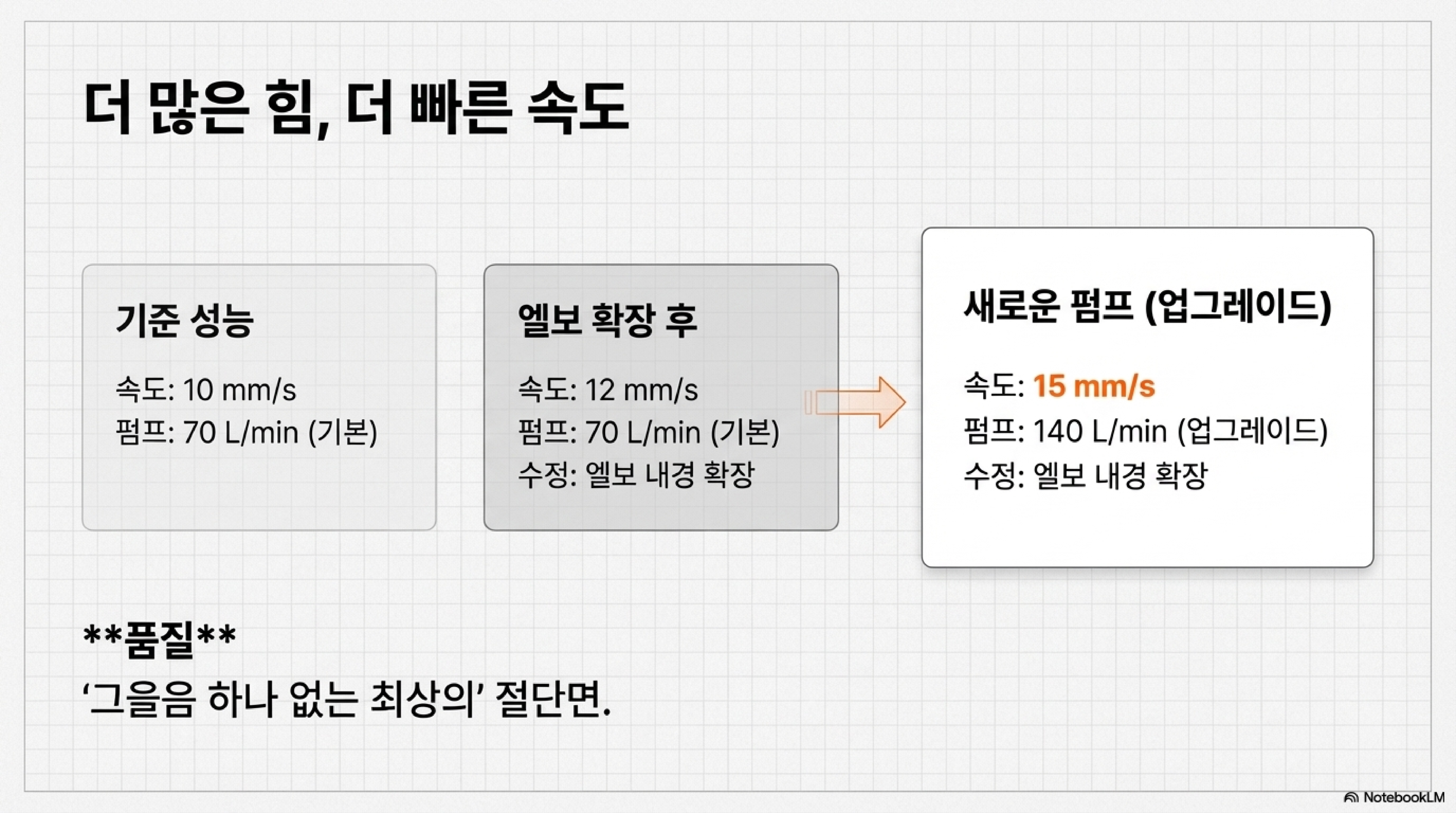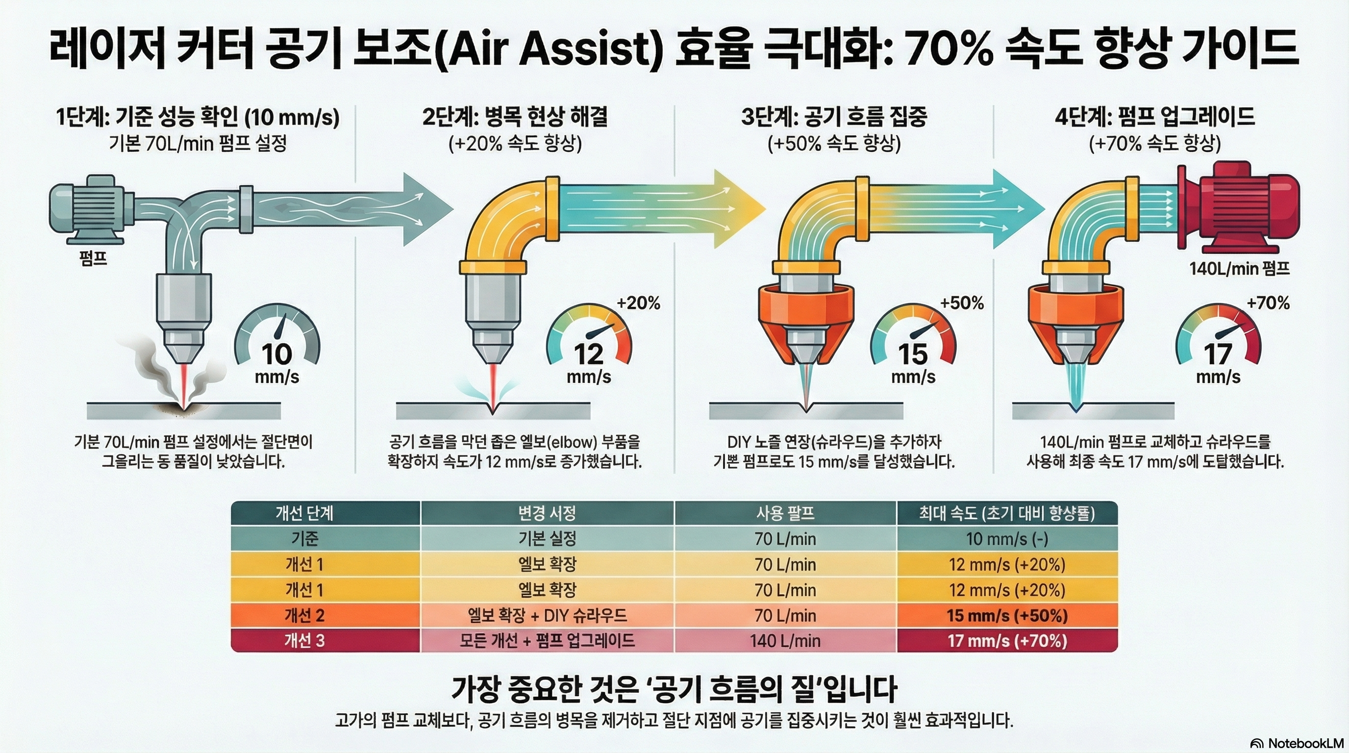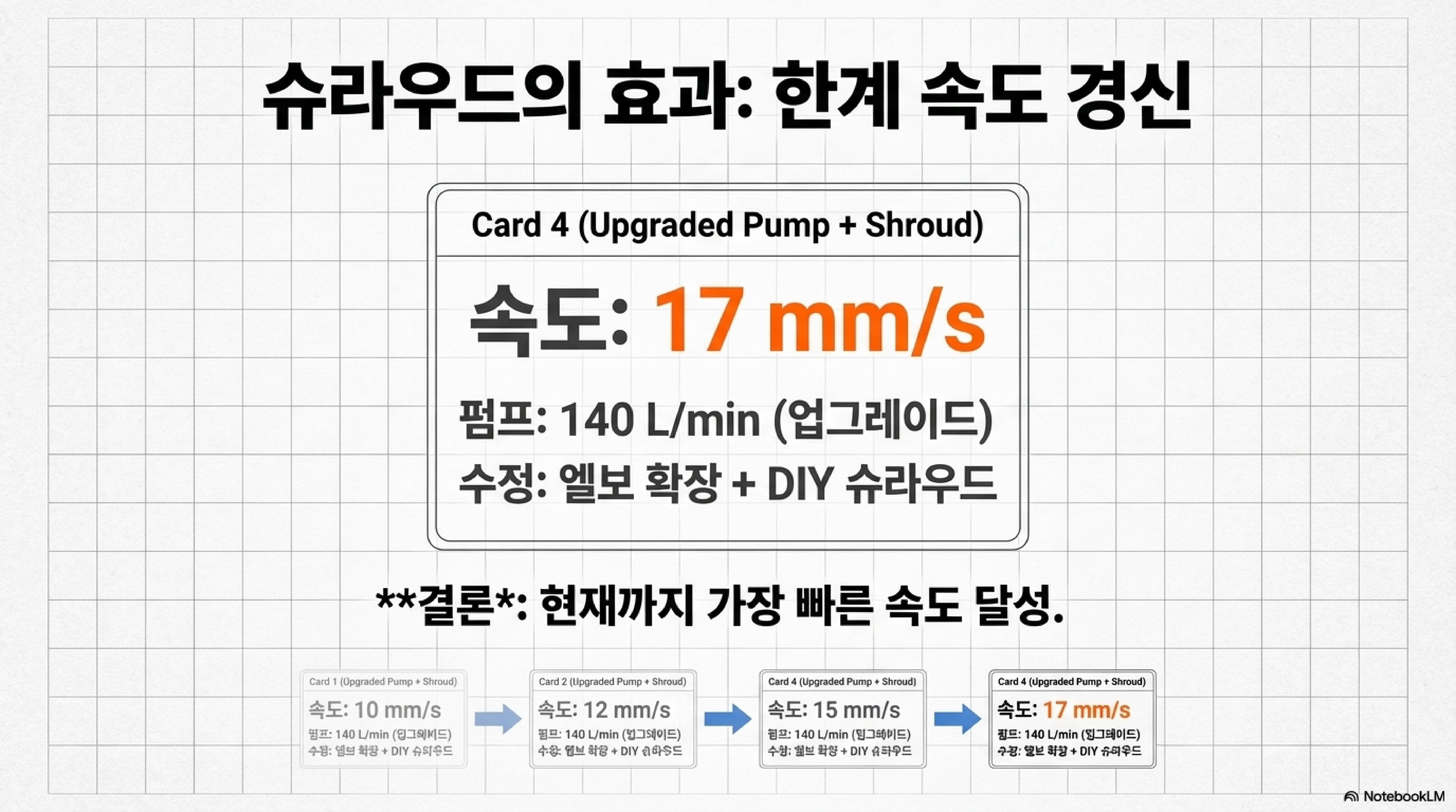 - 3단계: 펌프 업그레이드 (Pump Upgraded): 17 mm/s (초기 대비 총 70% 향상)