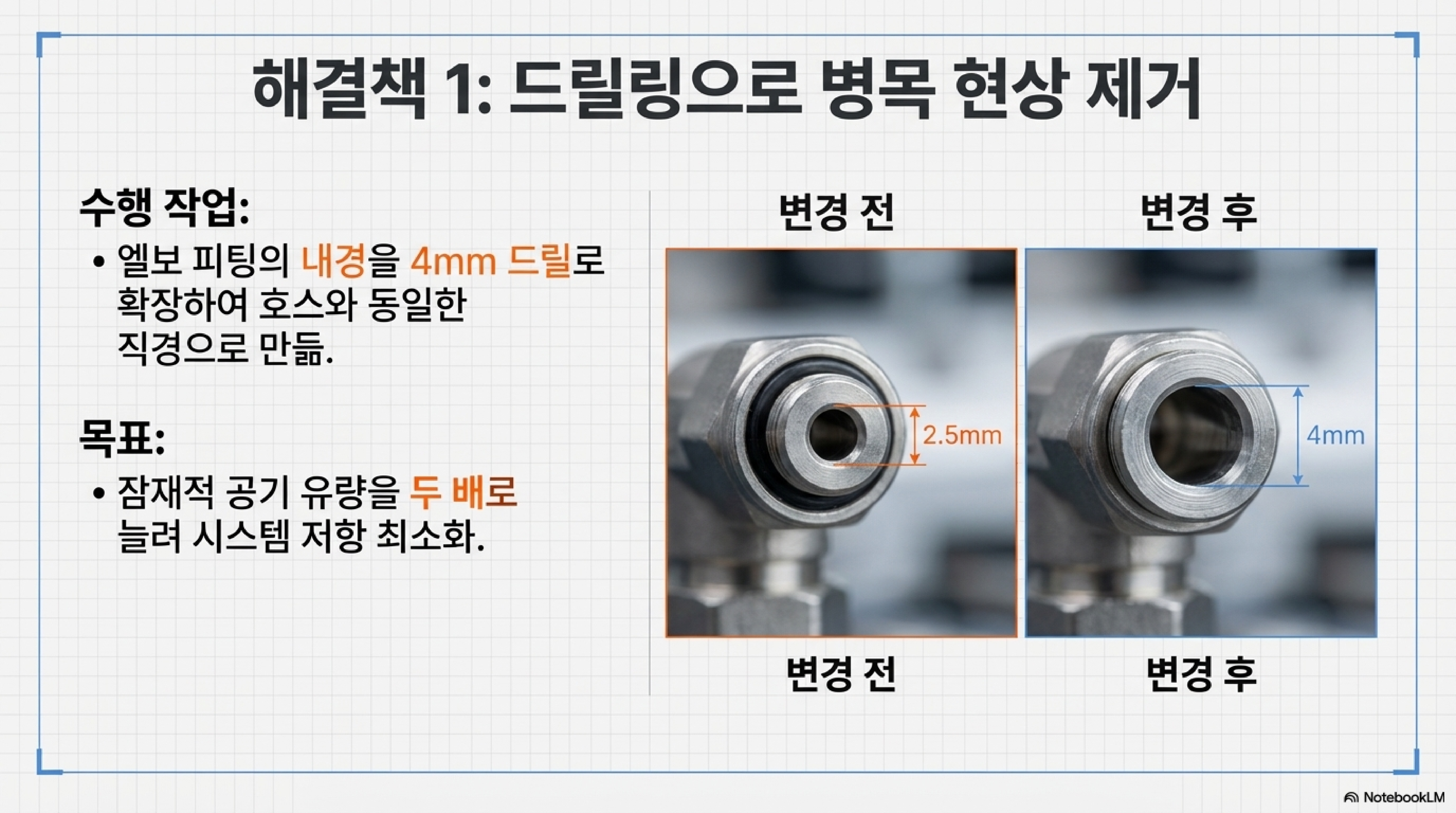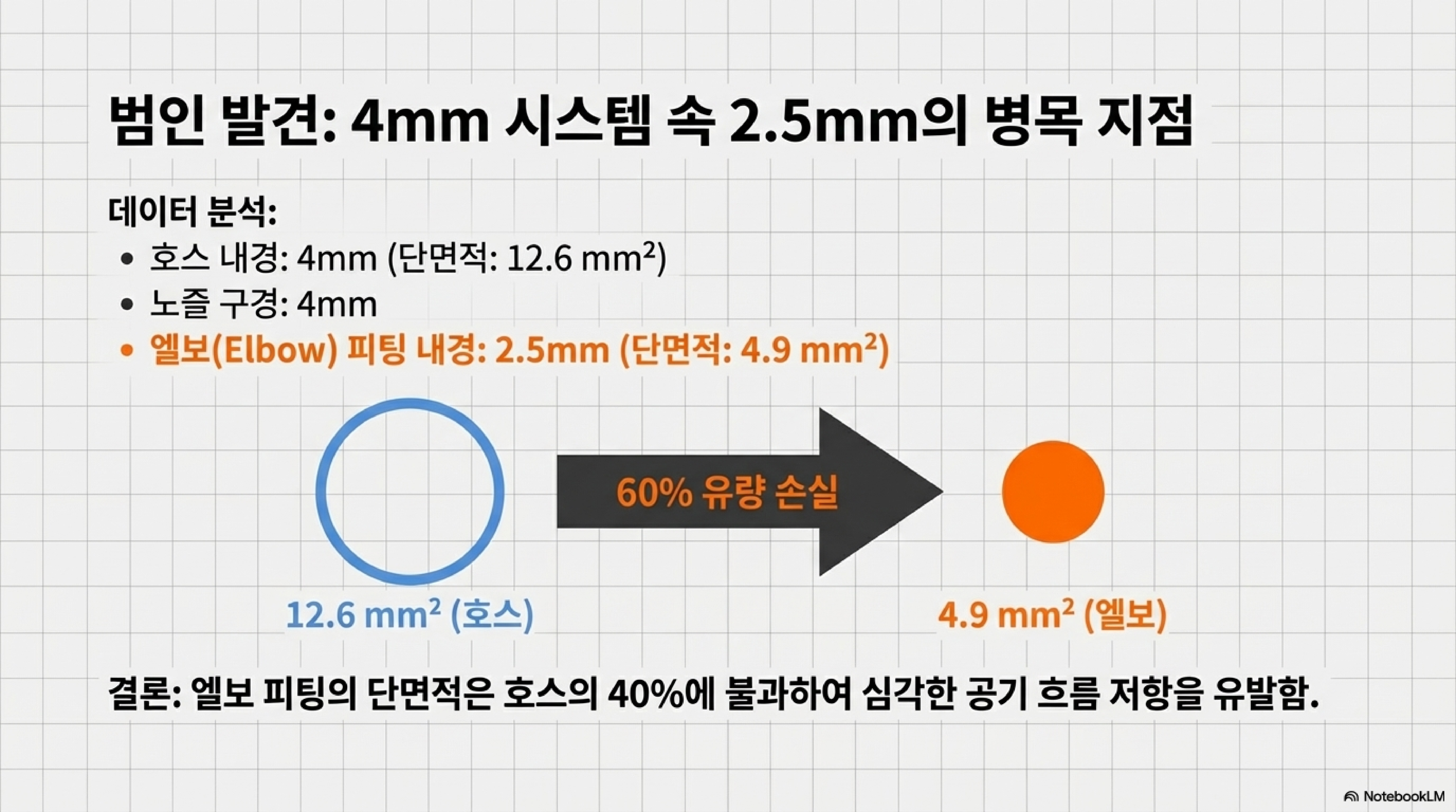 에어 호스와 노즐의 내경은 4mm였지만, 그 둘을 연결하는 작은 엘보(elbow) 부품의 내경은 고작 2.5mm에 불과했습니다. 공기가 지나가는 통로가 갑자기 절반 이하로 좁아지는 심각한 병목 현상이 있었던 것입니다.