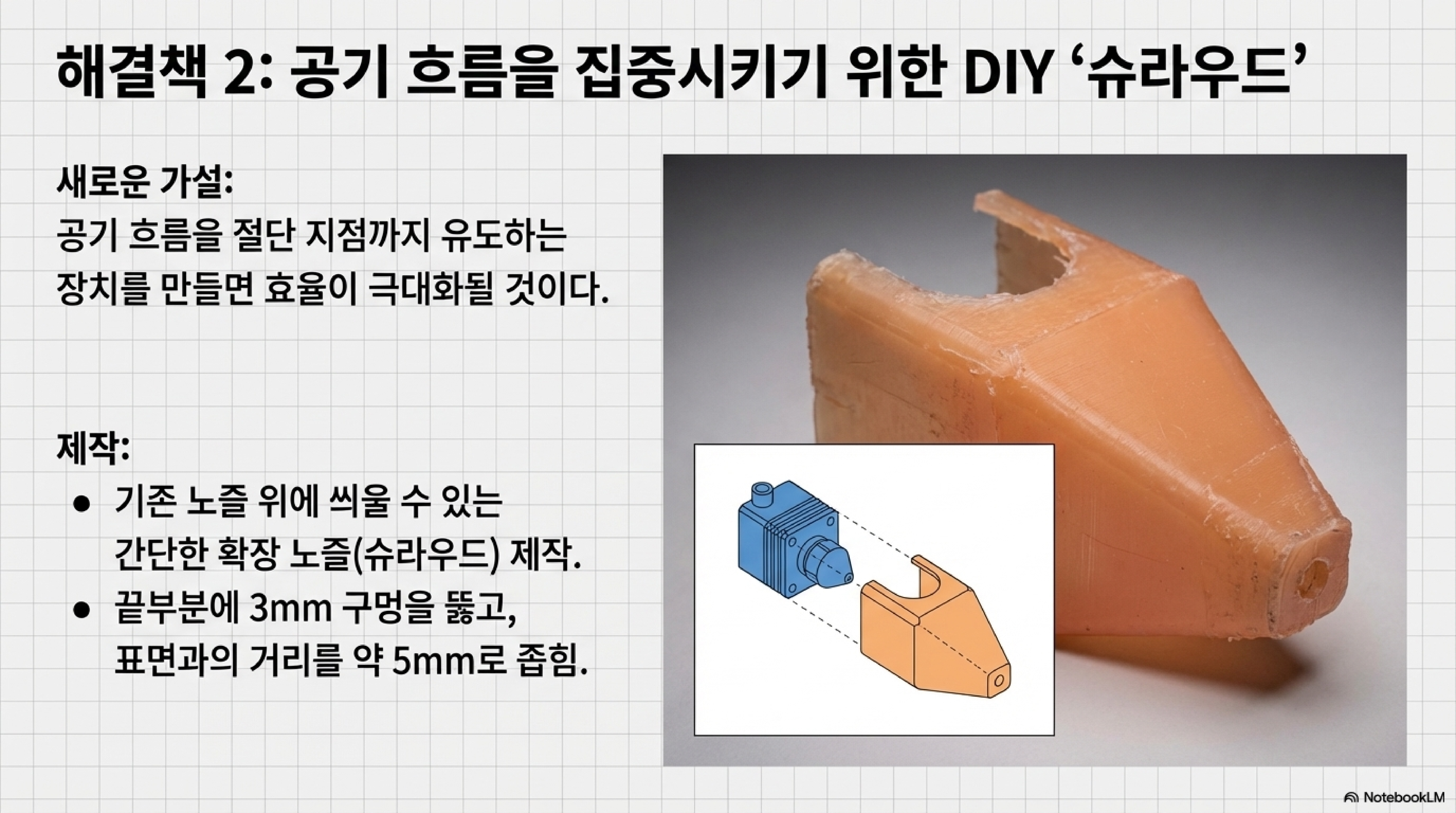 그래서 저는 공기 흐름을 모아주는 일종의 '깔때기' 역할을 할 간단한 연장 노즐을 3D 프린터로 만들었습니다. 저는 이걸 '슈라우드(shroud)'라고 부릅니다. 이 슈라우드는 노즐과 재료 표면 사이의 거리를 5mm로 좁혀 공기 흐름을 절단 지점에 정확하게 집중시키는 역할을 합니다.