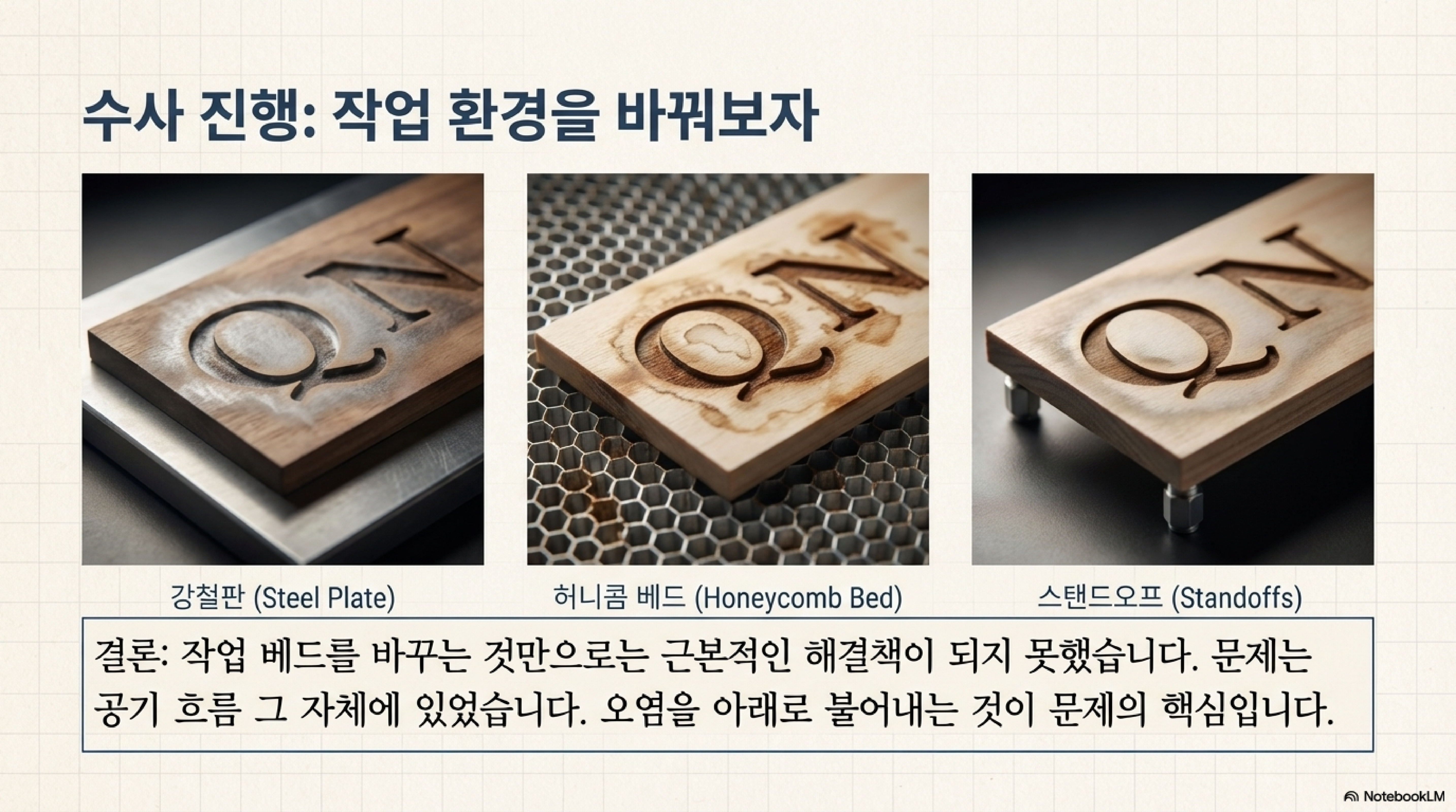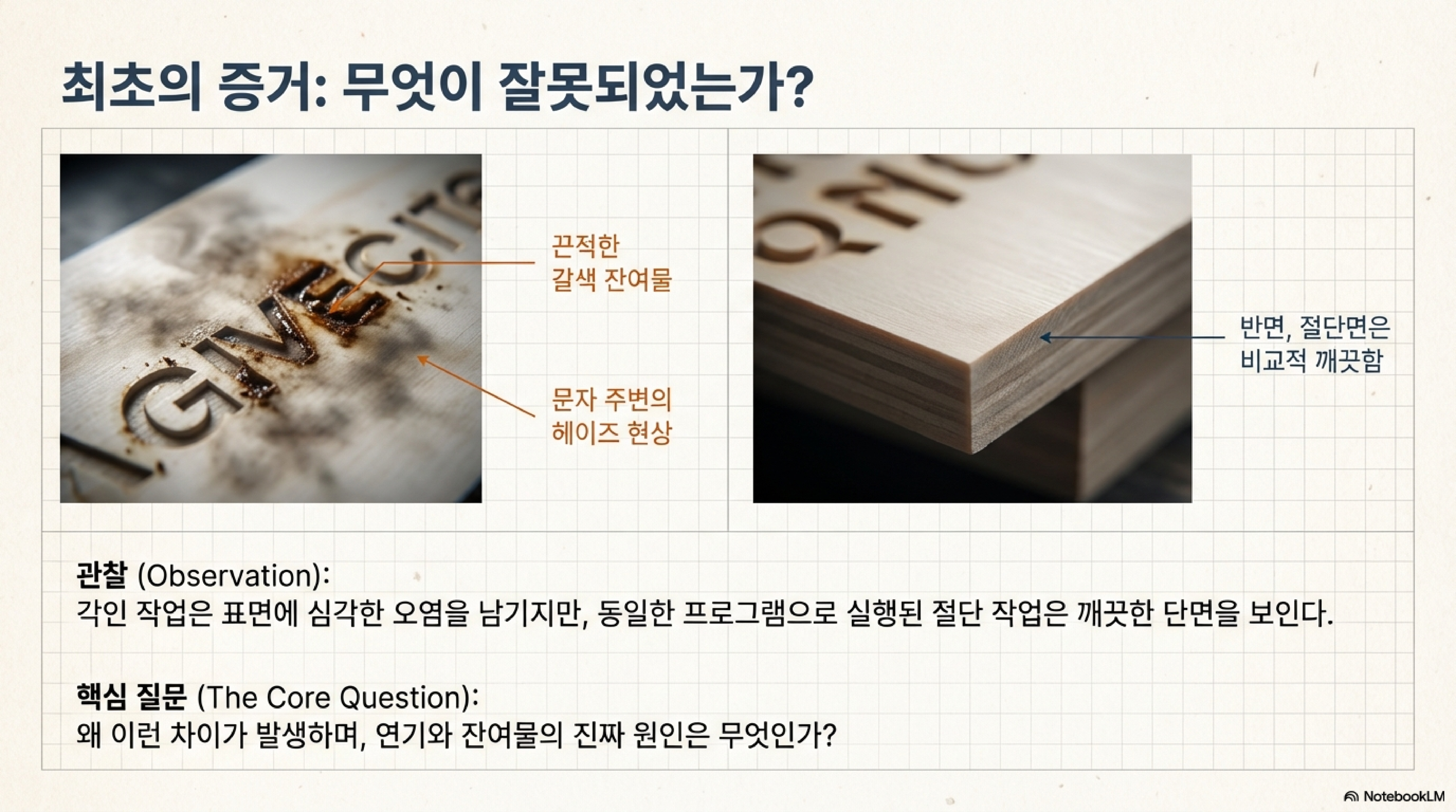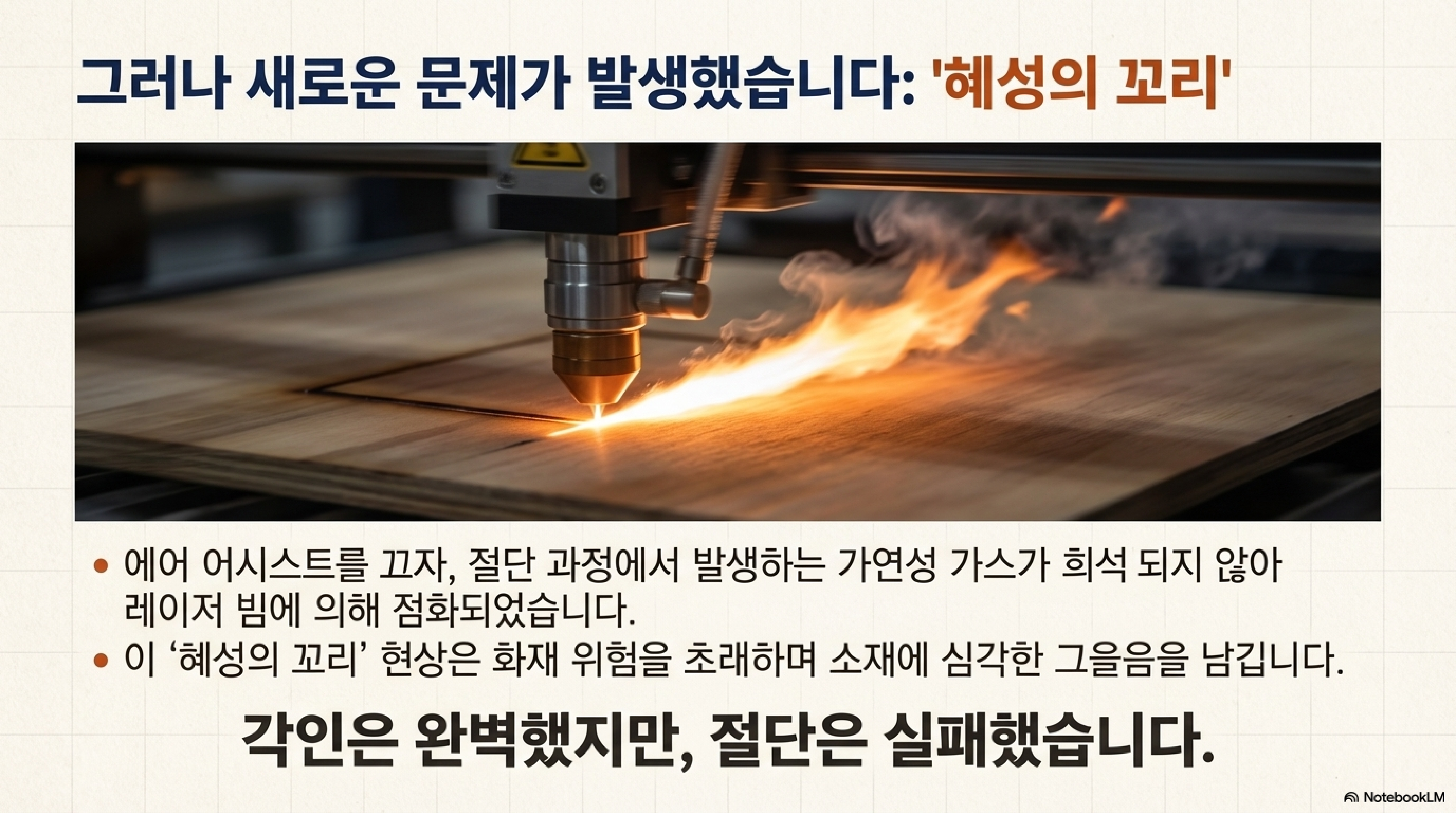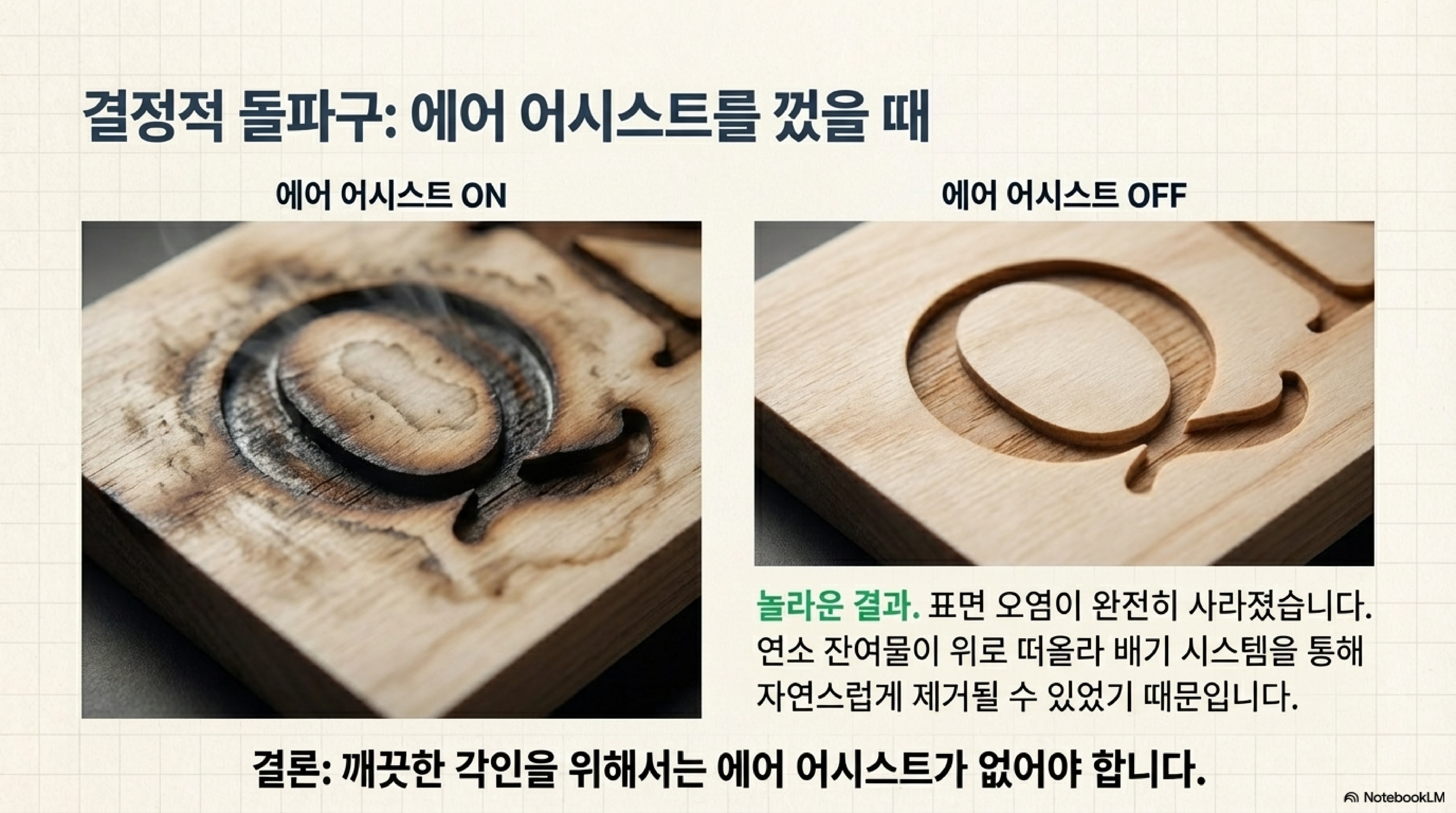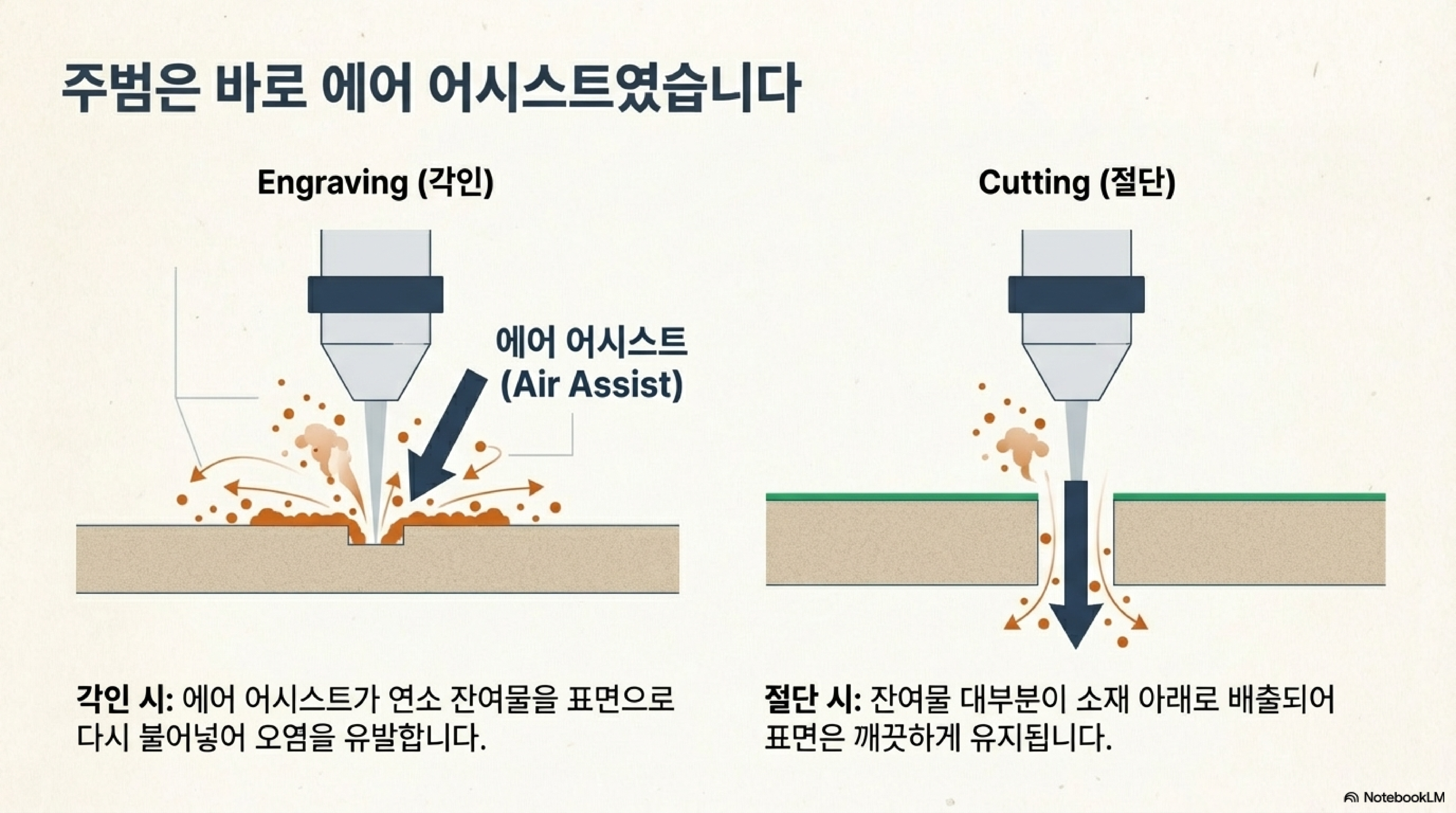 에어 어시스트 노즐에서 나오는 강력한 공기 분사가 문제의 원인이었습니다. 이 공기 흐름은 뜨겁게 기화된 목재 잔여물을 급격하게 냉각시켜, 끈적끈적한 갈색 막의 형태로 재료 표면에 다시 응축시켜 뿌려버렸습니다. 즉, 깨끗하게 만들려고 사용한 기능이 오히려 표면을 오염시키고 있었던 것입니다.