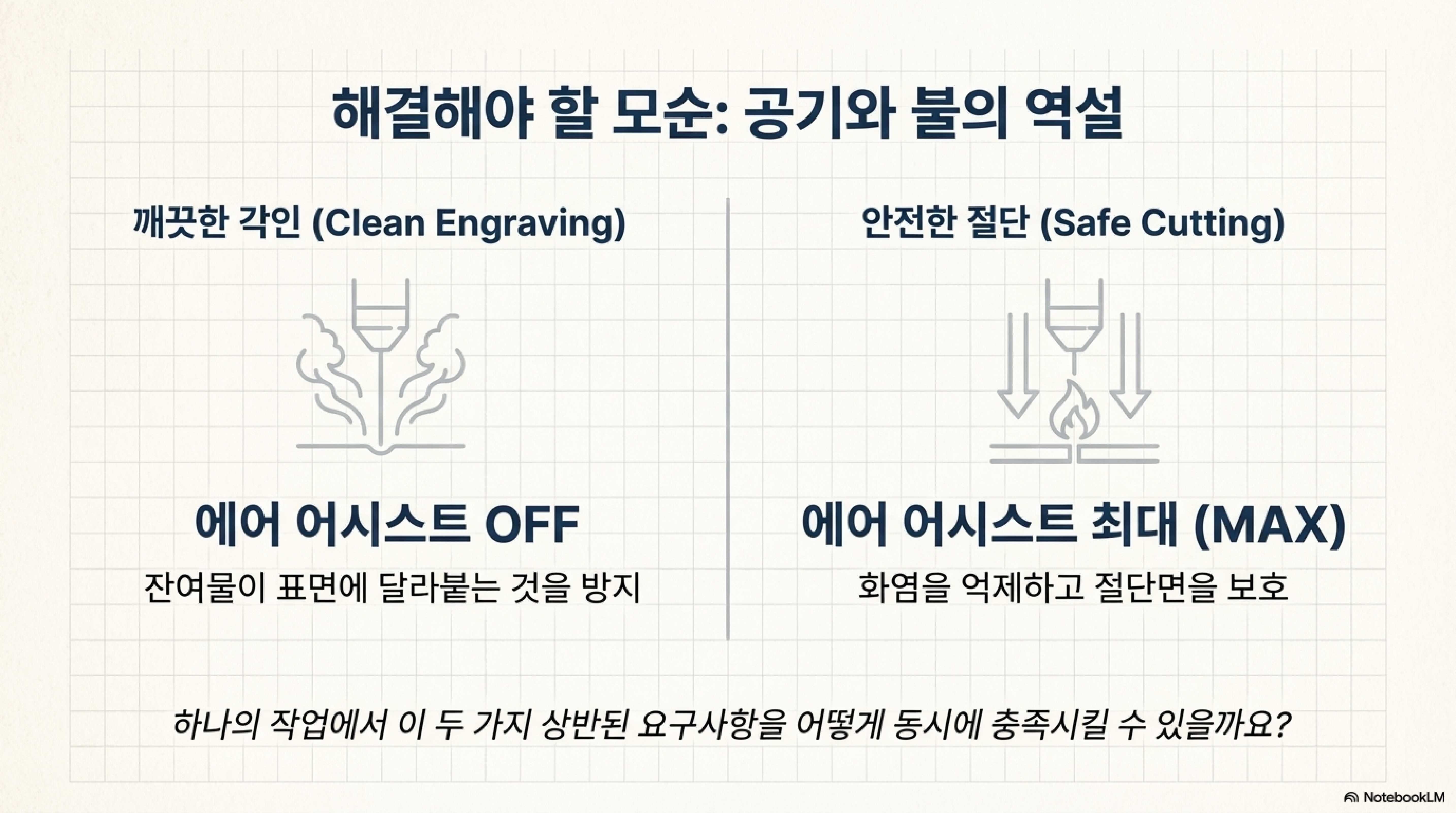 이 발견은 저에게 큰 딜레마를 안겨주었습니다. 제 각인은 마침내 깨끗해졌지만, 화염 방지를 위해 강력한 에어 어시스트가 반드시 필요한 절단 작업과 어떻게 결합해야 할까요?