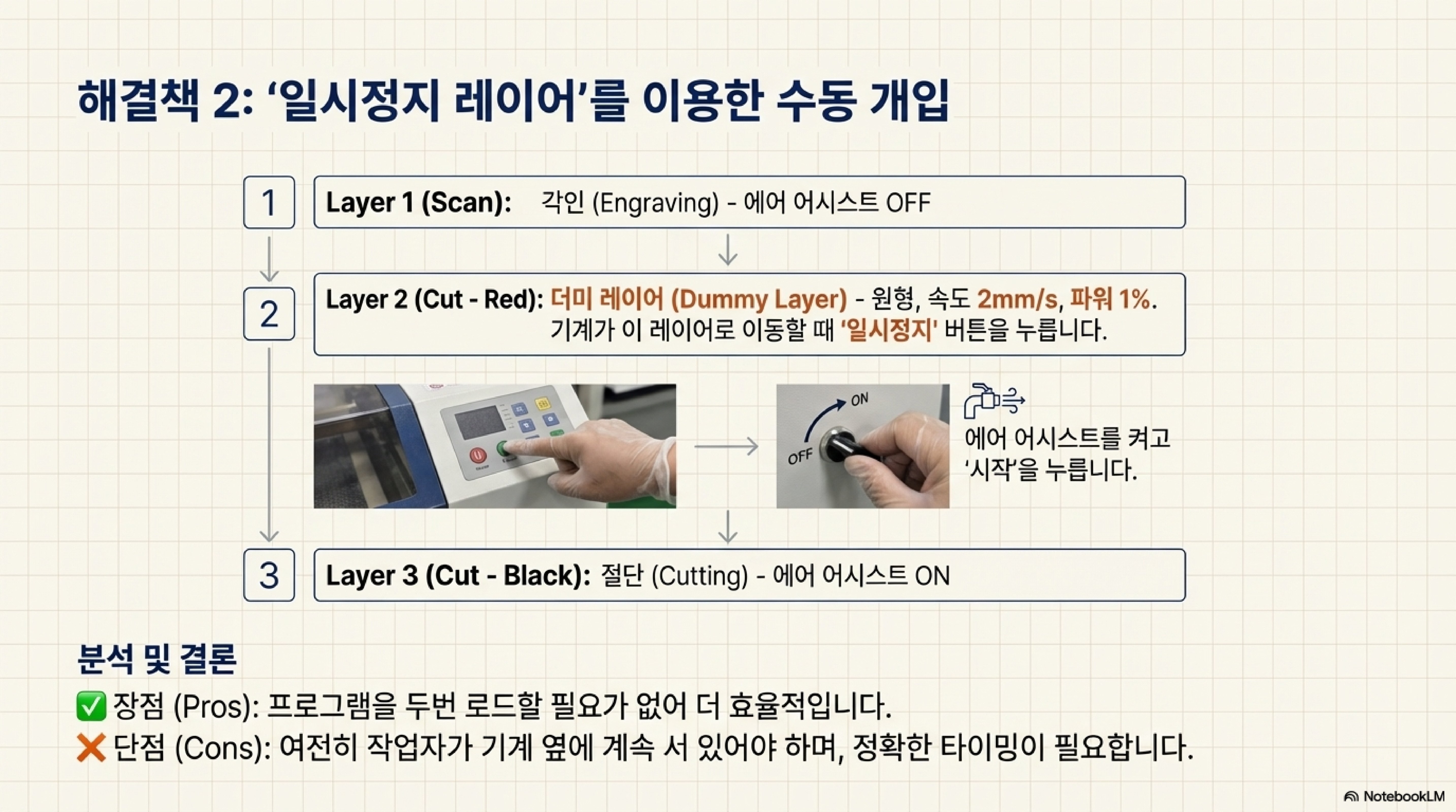 - 방법 2 (작업 중 일시정지): 각인 레이어와 절단 레이어 사이에 매우 느리고 힘이 없는 도형을 추가하는 기발한 방법을 썼습니다. 이는 프로그램된 일시정지 역할을 하여, 제가 기계를 멈추고 수동으로 에어 어시스트를 켤 시간을 벌어주었습니다. 더 나은 방법이었지만, 여전히 "기계 옆에 서 있어야" 하는 수고가 필요했습니다.