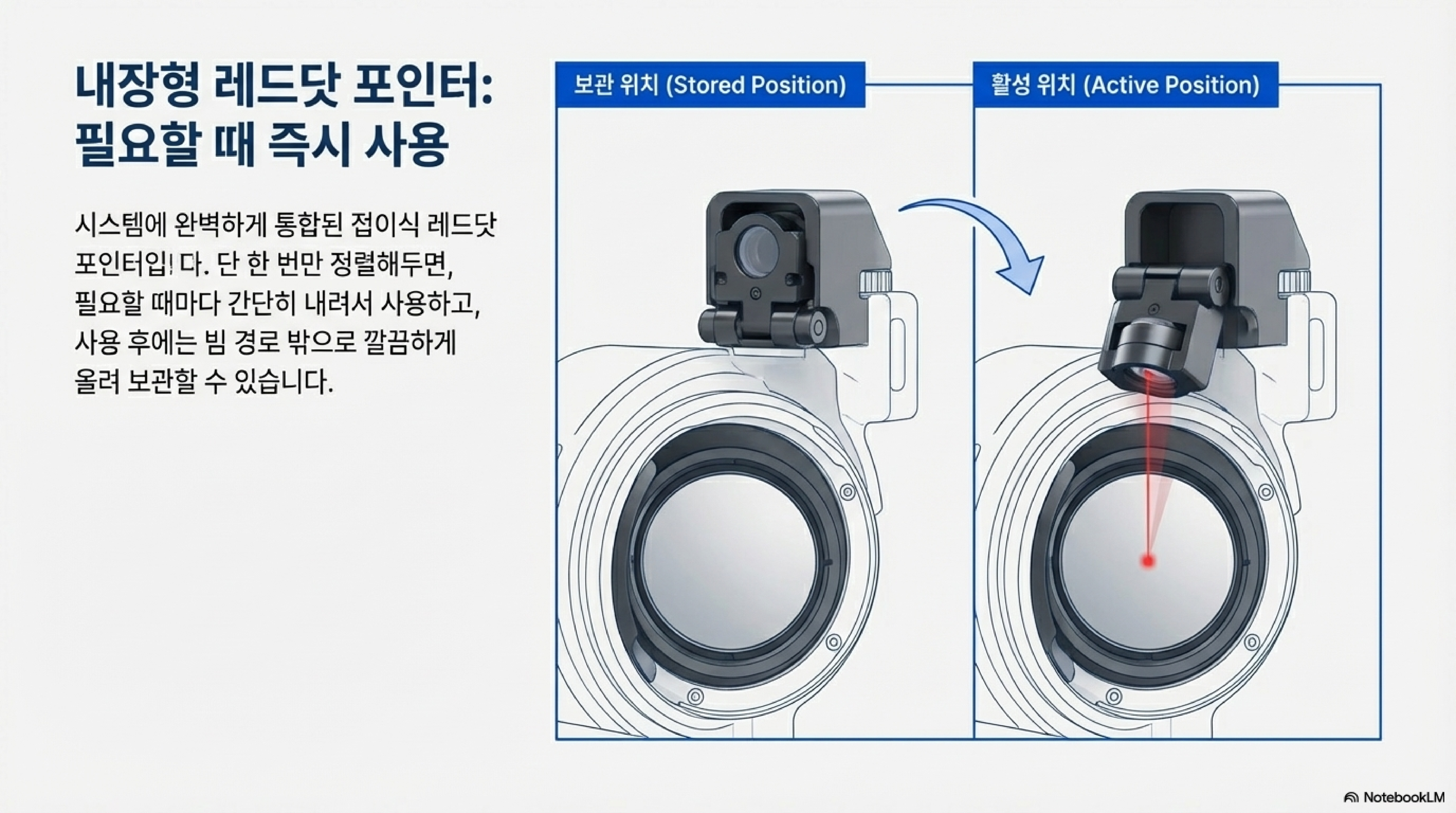 - 레드닷 포인터: 필요할 때 제 위치에 끼워 넣고, 작업 중에는 옆으로 치워둘 수 있는 내장형 레드닷 포인터 마운트는 제가 숨겨둔 '깜짝 기능'입니다. 안전을 위해 마이크로 스위치를 추가할 계획도 세웠습니다.