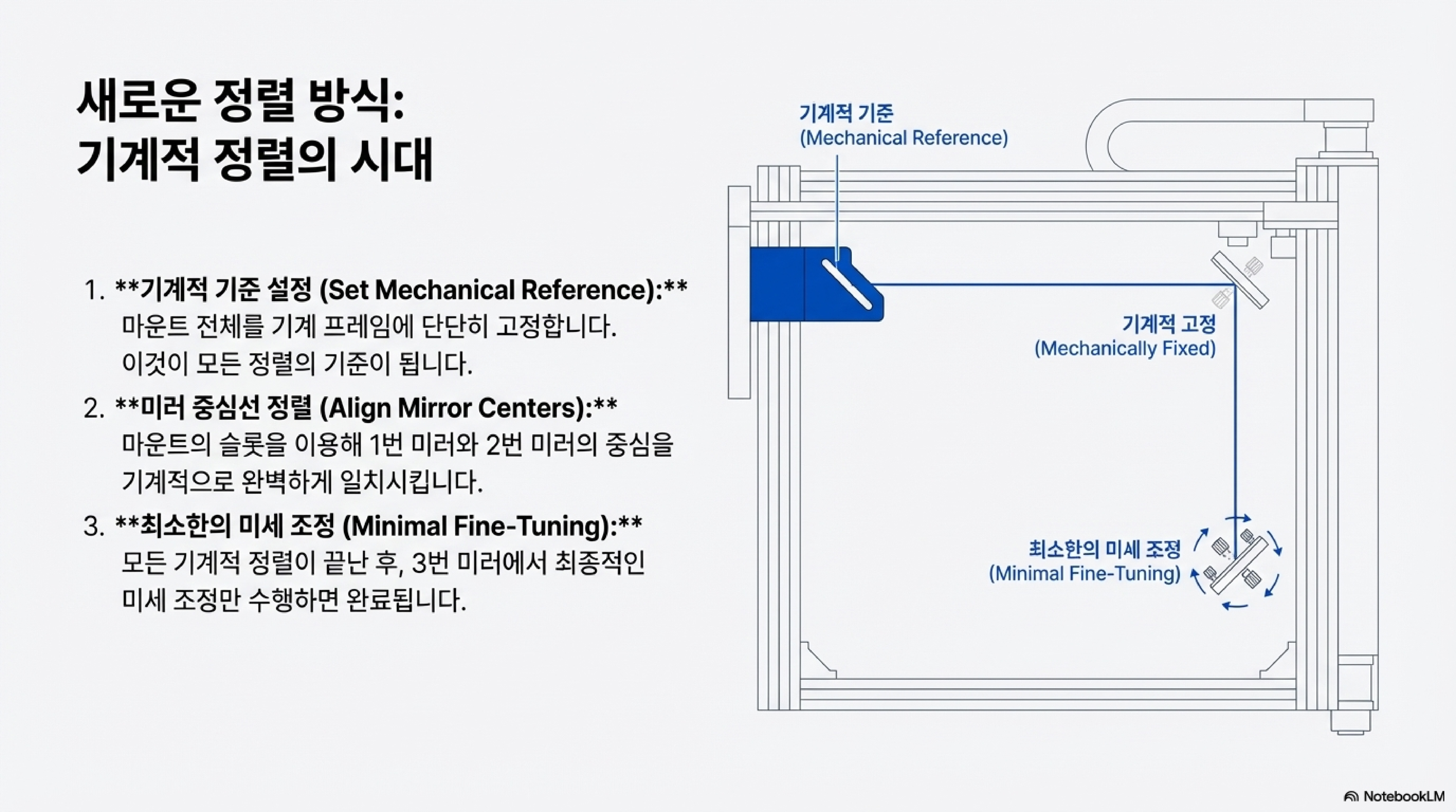 제가 얻은 가장 핵심적인 통찰은 이것입니다. 일반적인 중국산 레이저 커터의 미러 마운트 정렬이 어려운 이유는 작업이 본질적으로 복잡해서가 아닙니다. 바로 그 부품들이 너무나도 다양한 기계에 맞도록 '극도의 유연성'을 가지고 설계되었기 때문입니다.