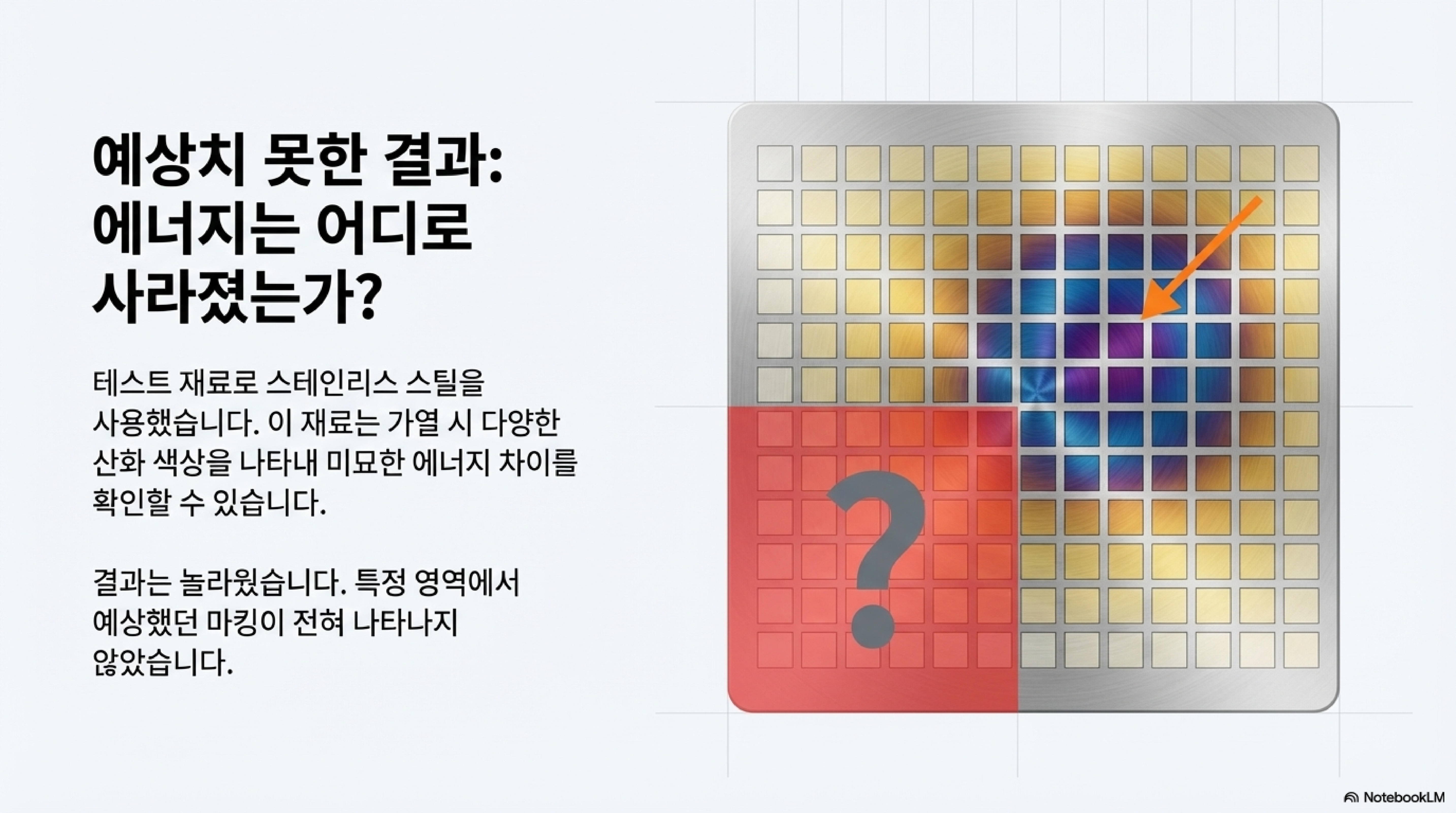 저는 기계의 성능을 파악하기 위해 16개의 다른 펄스와 14개의 다른 주파수를 조합하여 테스트 매트릭스를 실행했습니다. 처음에는 양극 산화 처리된 검은색 알루미늄에 테스트했지만, 이 소재는 제가 '이진(binary)' 재료라고 부르는 특성, 즉 검은색 아니면 흰색으로만 반응하여 미묘한 변화를 감지하기 어려웠습니다. 그래서 저는 산화물 색상과 회색 음영을 통해 출력 변화를 세밀하게 보여주는 스테인리스 스틸로 재료를 바꾸었습니다. 당연히 모든 칸에 어떤 형태로든 마킹이 나타날 것이라고 예상했습니다. 하지만 결과는 충격적이었습니다. 특정 저주파수 영역에서는 아무런 흔적도 발견되지 않았습니다. 마치 레이저가 작동을 멈춘 것처럼 말이죠. 대체 무엇이 잘못된 걸까요? 이 미스터리를 해결하는 과정이 바로 이 글의 핵심입니다.