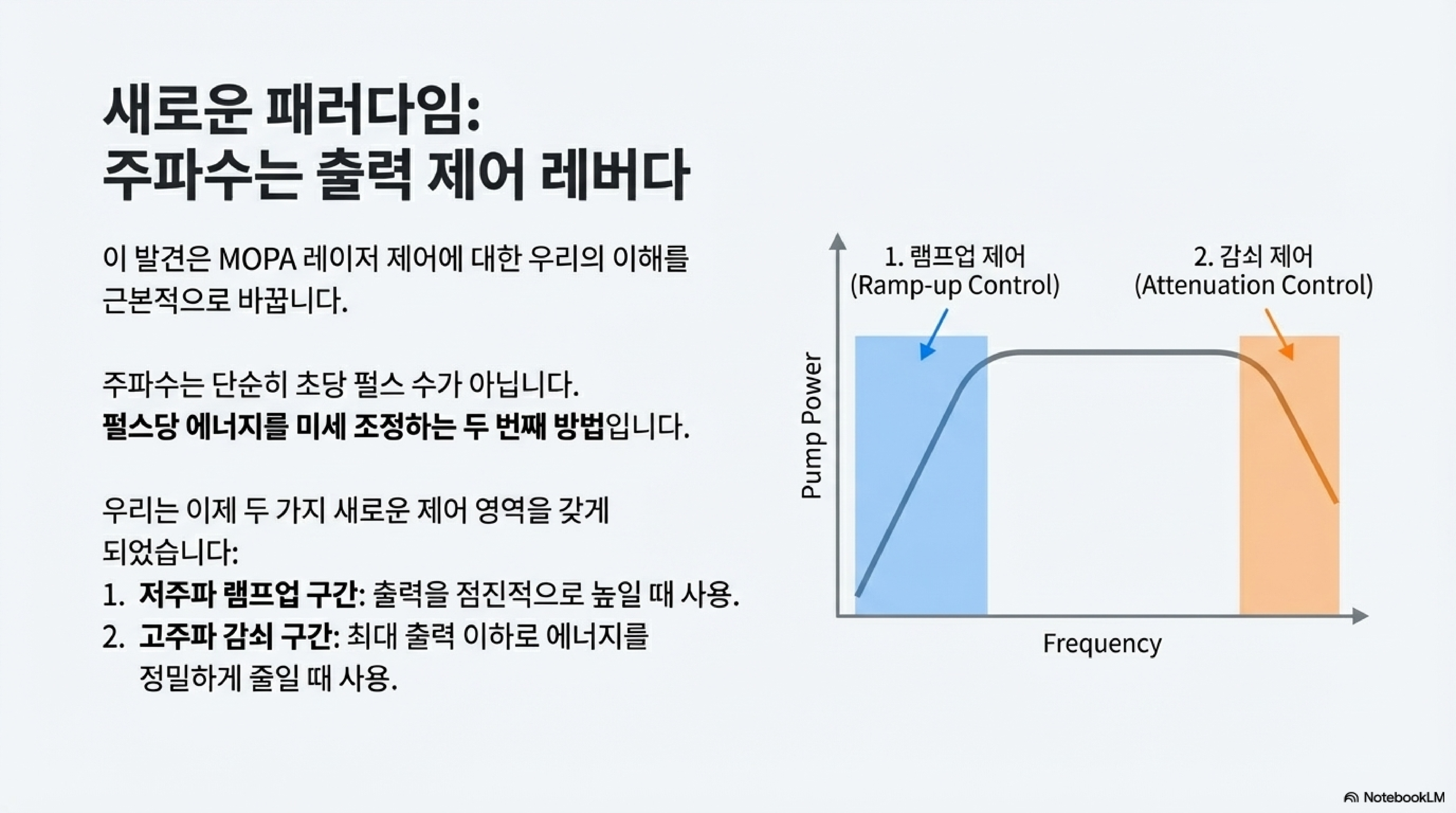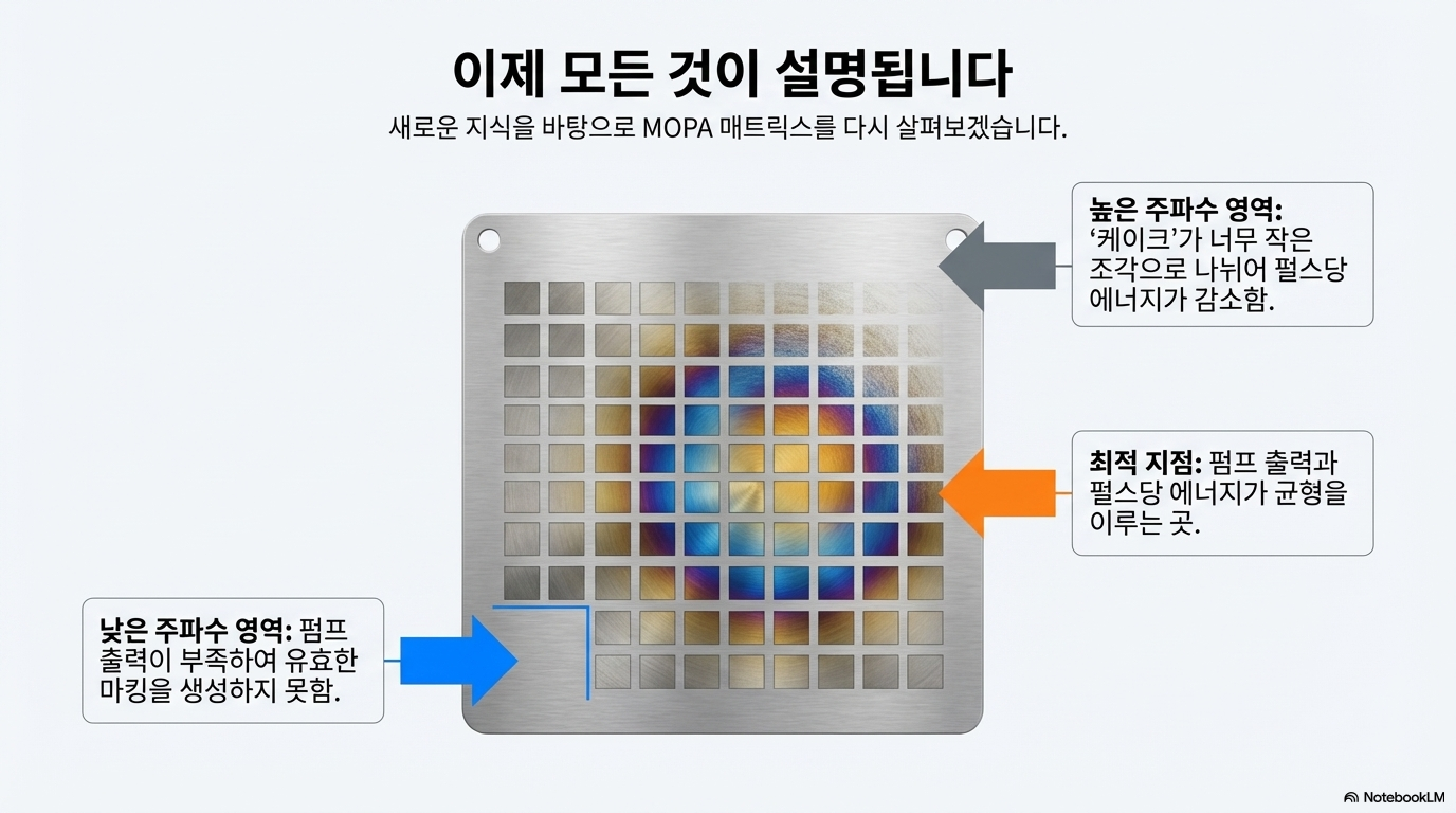 주파수를 높이는 것이 항상 더 강한 에너지를 의미하지는 않는다는 사실은 매우 역설적입니다. 특정 지점을 지나면, 주파수를 높일수록 오히려 '펄스당 에너지'는 감소합니다.