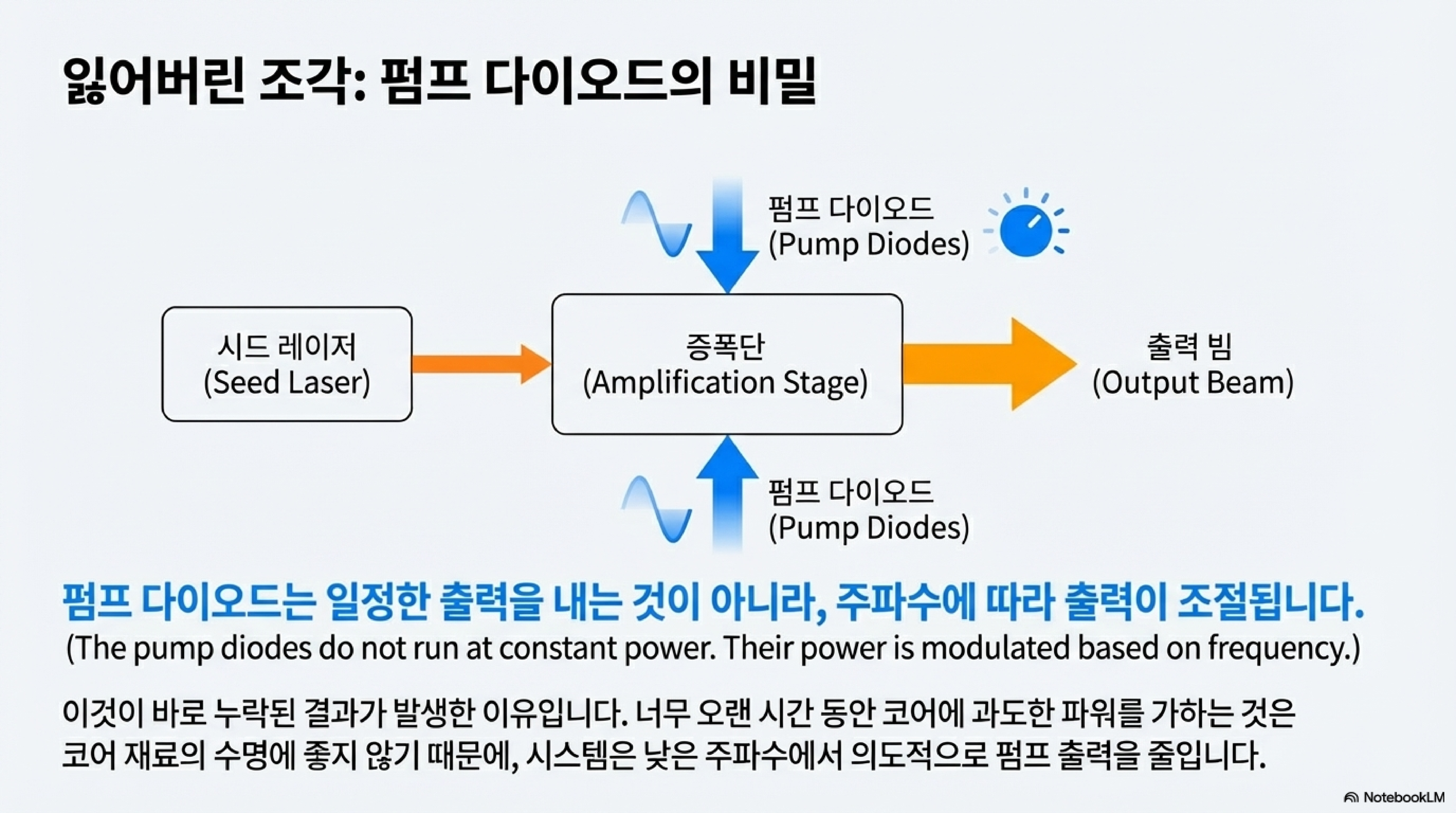 저는 처음에 펌프 다이오드가 항상 일정한 최상의 출력으로 작동할 것이라고 가정했습니다. 하지만 이 모델은 완전히 틀렸습니다. 실제로는 레이저 코어의 수명을 보호하기 위해, 펄스 사이의 간격이 긴 저주파수에서는 펌프 다이오드에 공급되는 전력이 점진적으로 증가하도록 설계되어 있었습니다. 즉, 펄스를 발사하기 직전에 필요한 만큼만 에너지를 '충전'하는 방식입니다. 저주파수에서는 다음 펄스까지의 간격이 너무 길어, 코어에 무리를 주지 않기 위해 펌프 다이오드의 출력을 최소한으로 유지하는 것입니다.