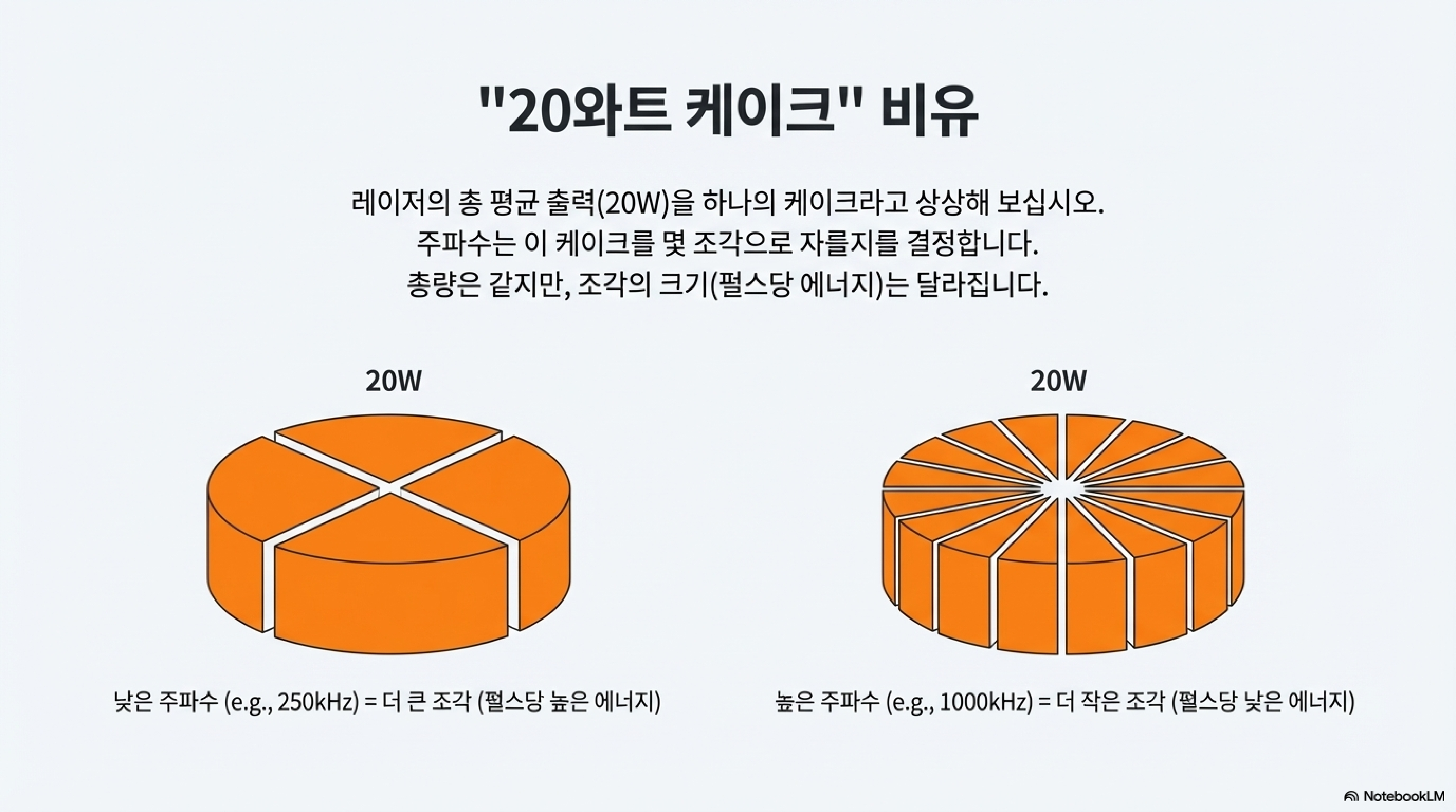 이 개념을 쉽게 이해하기 위해 '케이크 비유'를 사용해 보겠습니다. 이 기계의 총 출력인 20와트가 하나의 커다란 케이크라고 상상해 보세요. 주파수는 이 케이크를 몇 조각으로 자를지를 결정하는 것과 같습니다. 250kHz 같은 낮은 주파수에서는 각 조각의 크기가 큽니다. 반면, 1000kHz처럼 주파수가 높을수록 케이크 조각의 수는 많아지지만 각 조각(펄스당 에너지)의 크기는 훨씬 작아집니다. 이것이 바로 제 테스트 매트릭스에서 고주파수 영역으로 갈수록 스테인리스 스틸에 새겨진 마킹이 점점 희미해졌던 이유입니다.