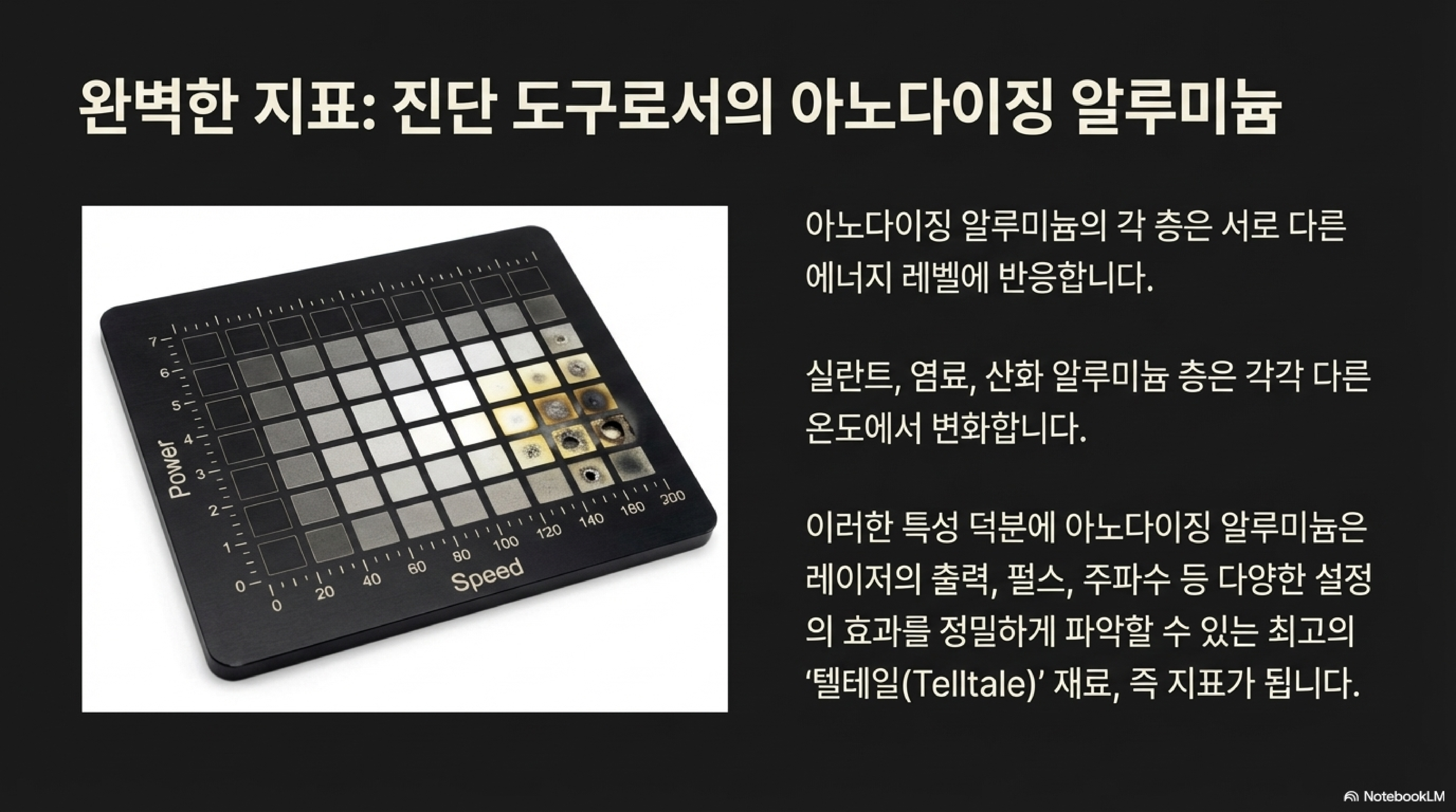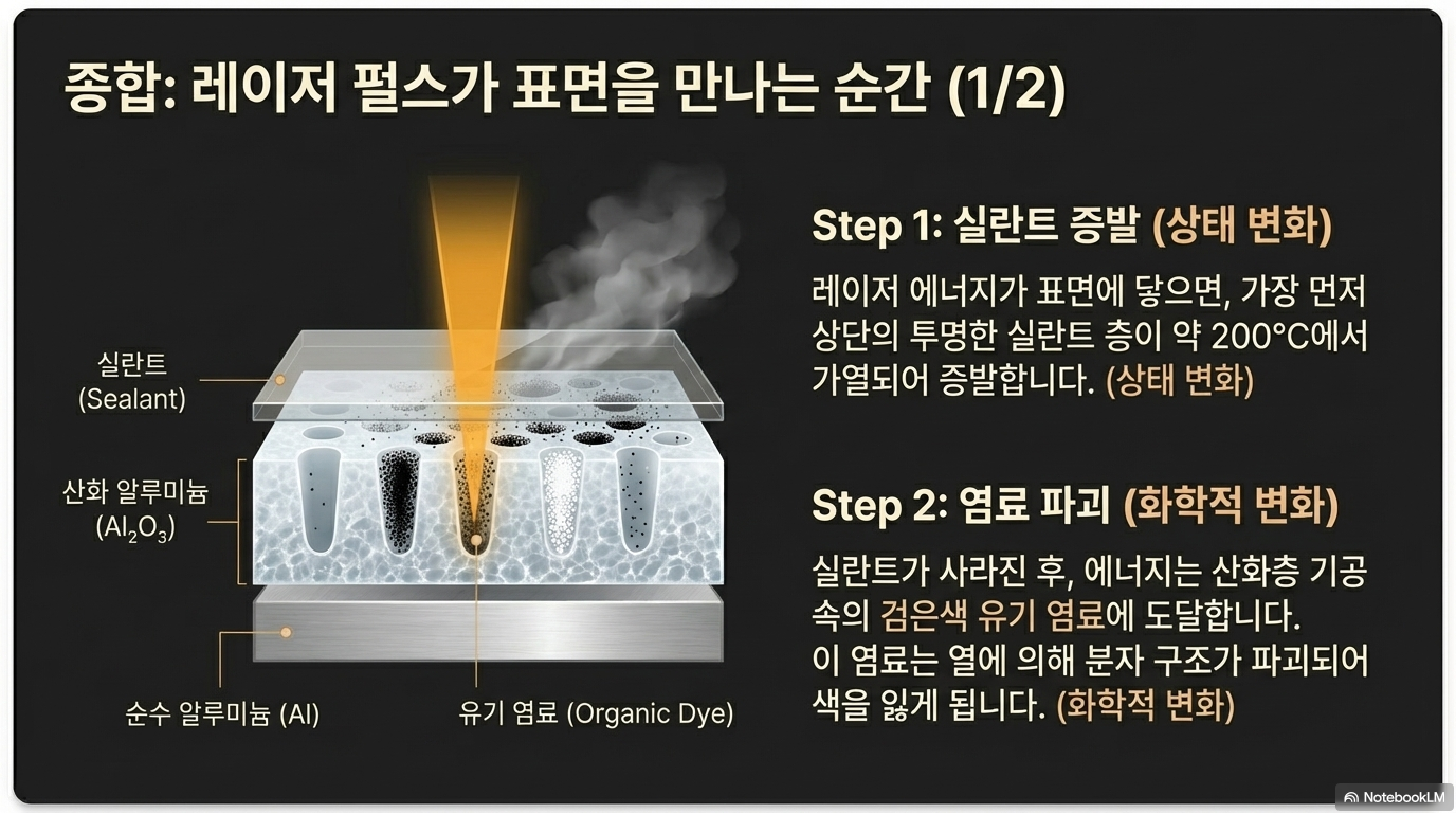검은색 아노다이징 알루미늄 표면에 레이저로 하얀 글씨를 새기는 것은 단순히 표면의 염료를 태우는 과정이 아닙니다. 이것은 원자 단위에서 물질을 재구성하는 정교한 작업에 가깝습니다.