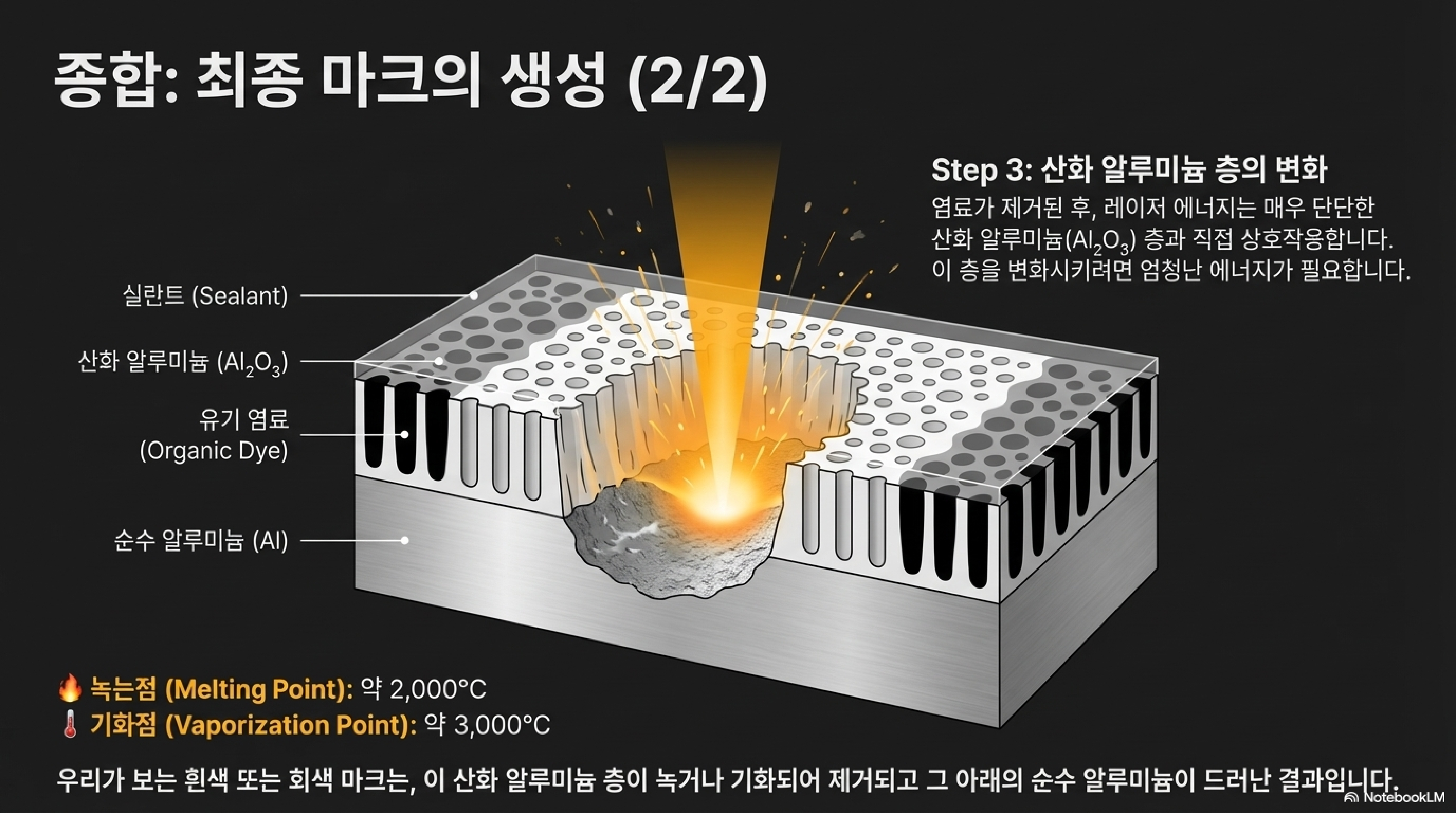 레이저가 이 단단한 표면에 영구적인 흰색 마크를 남기려면, 맨 아래의 산화 알루미늄 층 자체를 기화시켜야 합니다. 더욱 놀라운 점은 이 산화 알루미늄이 기화되기 시작하는 온도가 섭씨 3,000도 이상이라는 사실입니다. 이는 단순한 연소가 아니라, 극도로 집중된 에너지를 이용해 놀랍도록 견고하게 설계된 물질의 구조 자체를 원자 단위에서 분해하고 변화시키는 과정입니다.