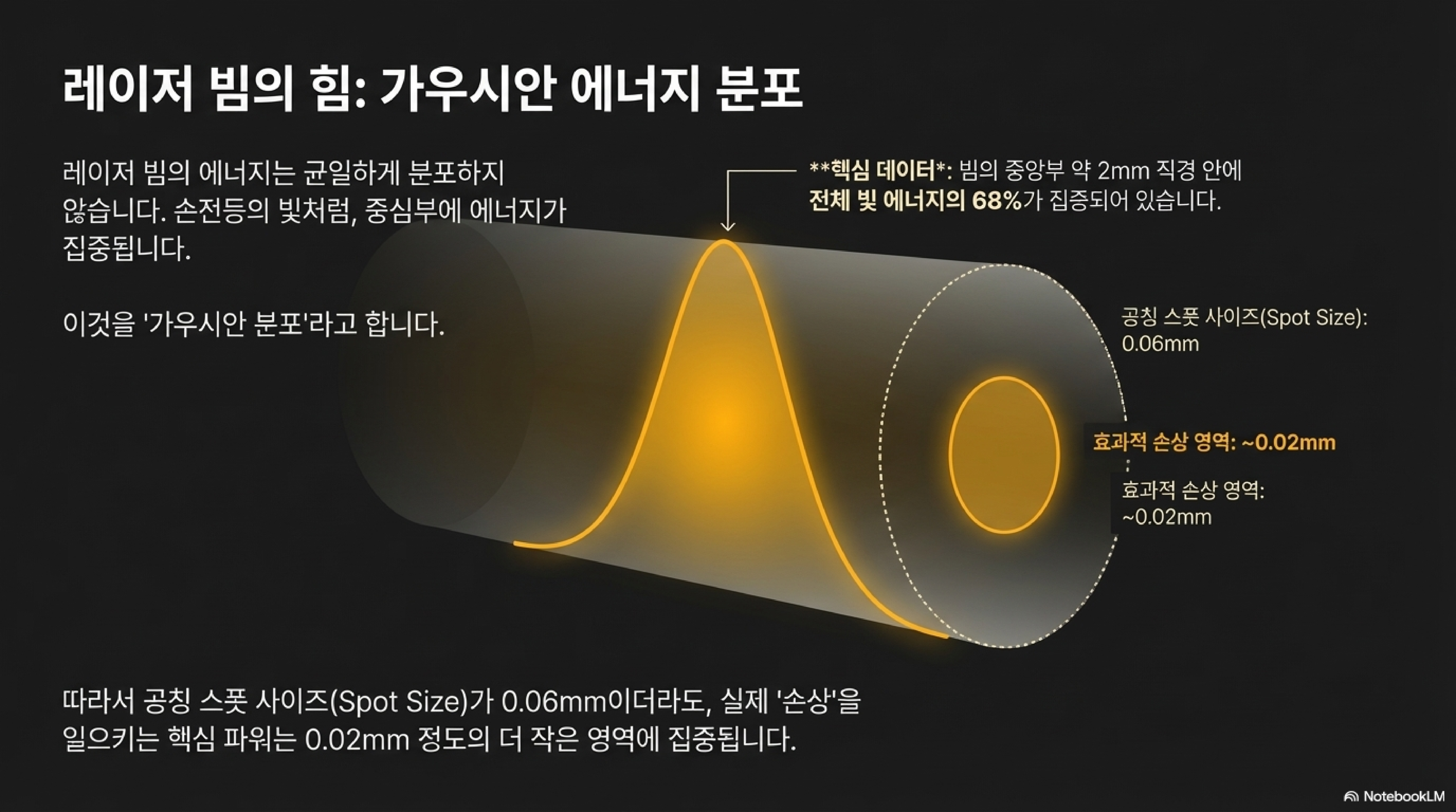 이 원리가 실제로 적용되면 그 결과는 더욱 놀랍습니다. 예를 들어, 렌즈를 통해 빔을 직경 0.06mm의 작은 점으로 집속시켰다고 가정해 봅시다. 이 경우, 실질적으로 손상을 입히는 '진짜 힘'은 그보다 훨씬 작은 중앙의 0.02mm 영역에 집중됩니다. 이는 우리가 생각하는 것보다 훨씬 더 작은 지점에 에너지가 극도로 집중되어 강력한 효과를 낼 수 있다는 것을 의미합니다.