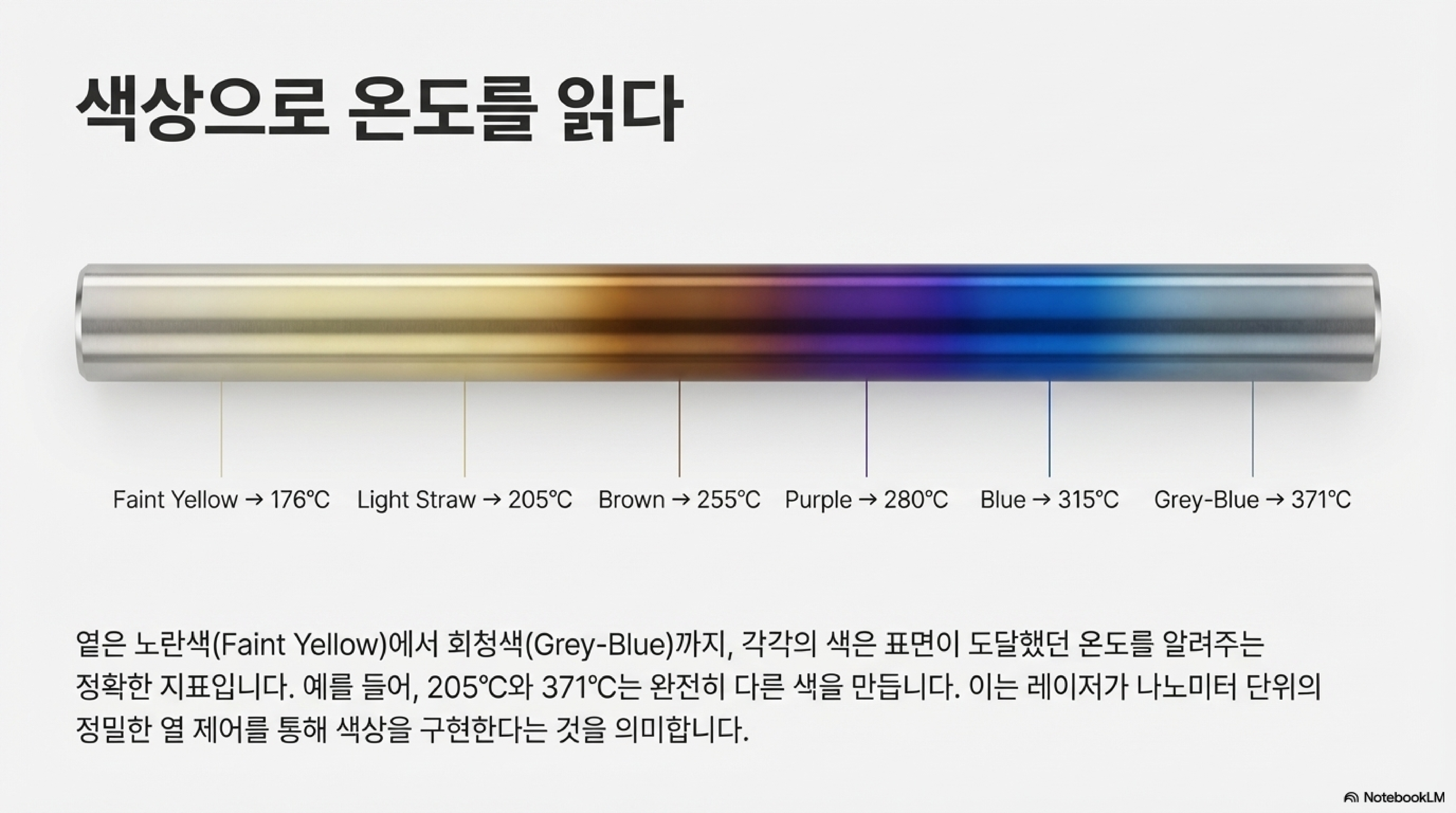 레이저가 하는 일은 바로 이 투명한 산화막에 정밀한 열을 가하여 그 두께를 미세하게 변화시키는 것입니다. 예를 들어, 표면을 약 371°C까지 가열하면 특정 두께의 막이 형성되고, 이 두께가 우리 눈에 회청색(grey-blue)으로 보이게 만듭니다. 물론 레이저는 거대한 토치와 달리 극소 부위에 에너지를 집중시키므로, 전체를 가열하기보다는 국소적인 자극을 통해 산화막의 성장을 유도하는 더 복잡한 과정을 거칠 수 있습니다.