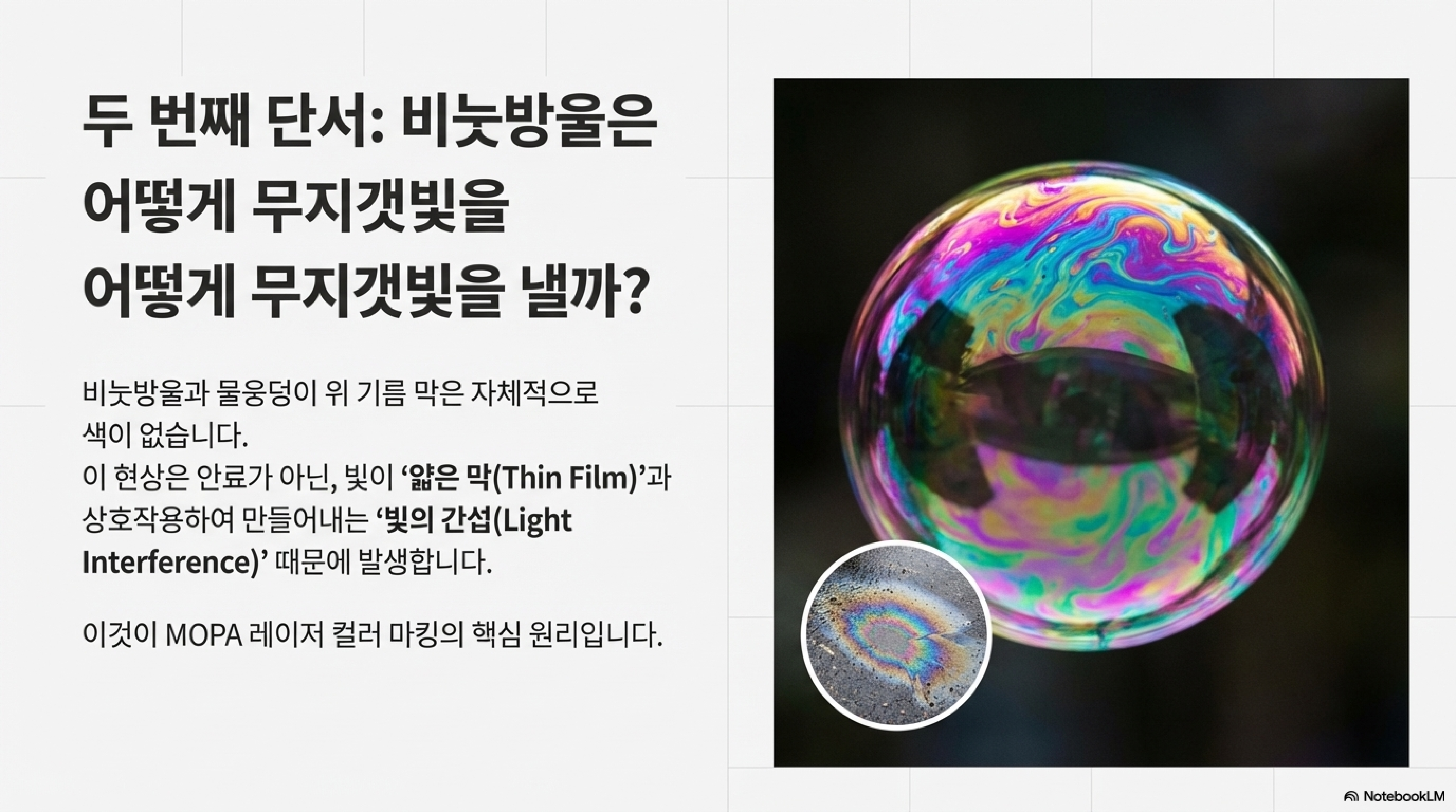 여기서부터 정말 흥미로워집니다. 이 원리가 사실 여러분이 이미 수백 번은 본 현상과 똑같기 때문이죠. 레이저로 두꺼워진 투명한 막이 어떻게 색을 만들어낼까요? 이 복잡해 보이는 현상은 우리 주변에서 흔히 볼 수 있는 비눗방울이나 물웅덩이에 뜬 기름 막에서 무지갯빛이 보이는 것과 정확히 같은 원리입니다. 이를 과학 용어로는 ‘박막 간섭(Thin Film Interference)’이라고 부릅니다.