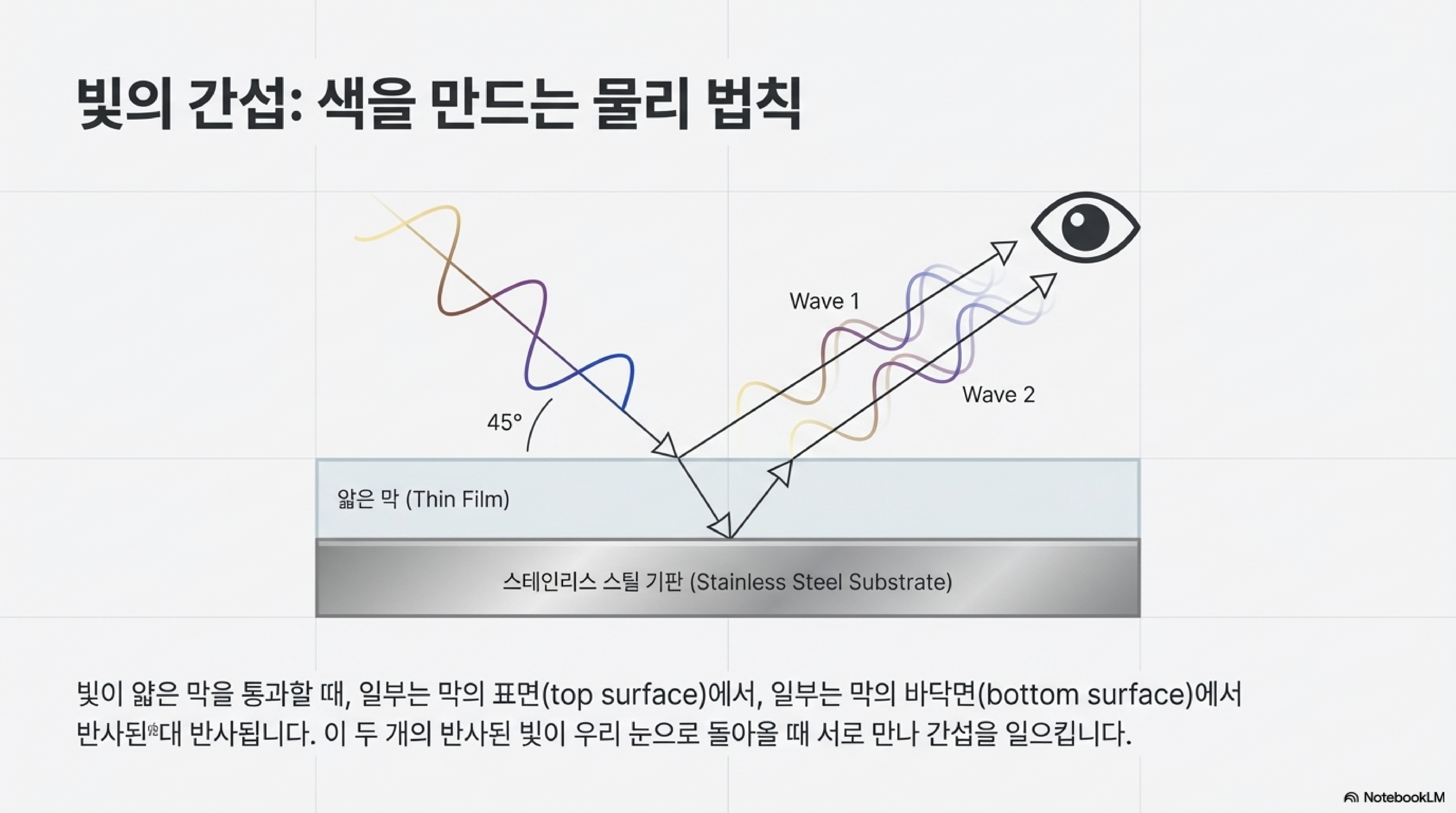 - 두 가지 다른 경로로 반사된 빛의 파동이 다시 만나 서로 ‘간섭’을 일으킵니다. 여기서 핵심 변수는 바로 산화막의 두께입니다. 이 두께가 두 빛의 경로 차이를 결정합니다.