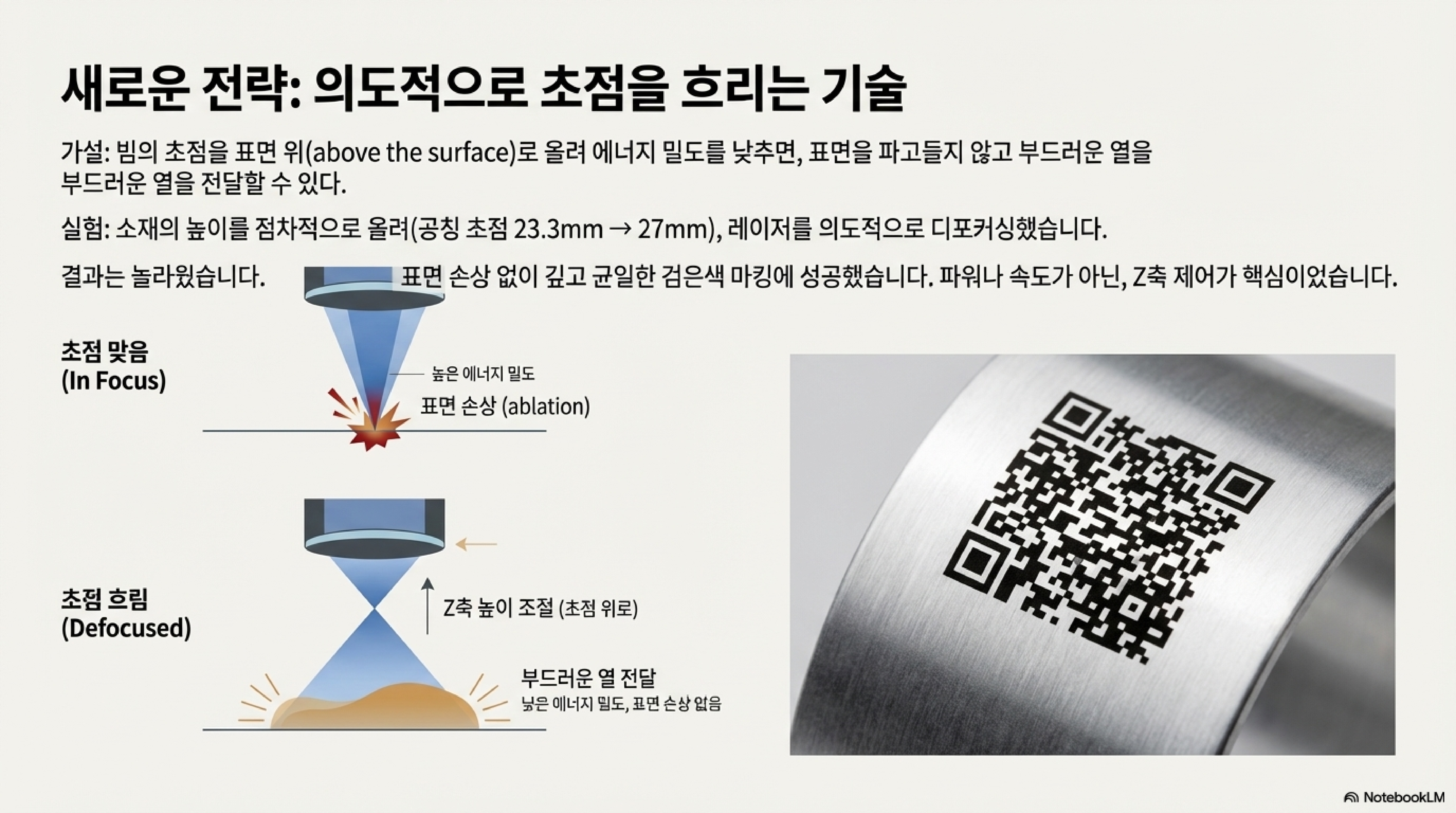 이 기법의 비밀은 에너지 밀도에 있었습니다. 초점을 흐리면 단위 면적당 에너지가 낮아져 재료를 파괴하는 '절삭'이 아닌, 부드러운 열로 화학적 변화를 유도하는 '가열'에 최적화된 상태가 만들어집니다. 정확한 초점이 생명이라는 레이저 각인의 상식이 완전히 뒤집히는 순간이었습니다.