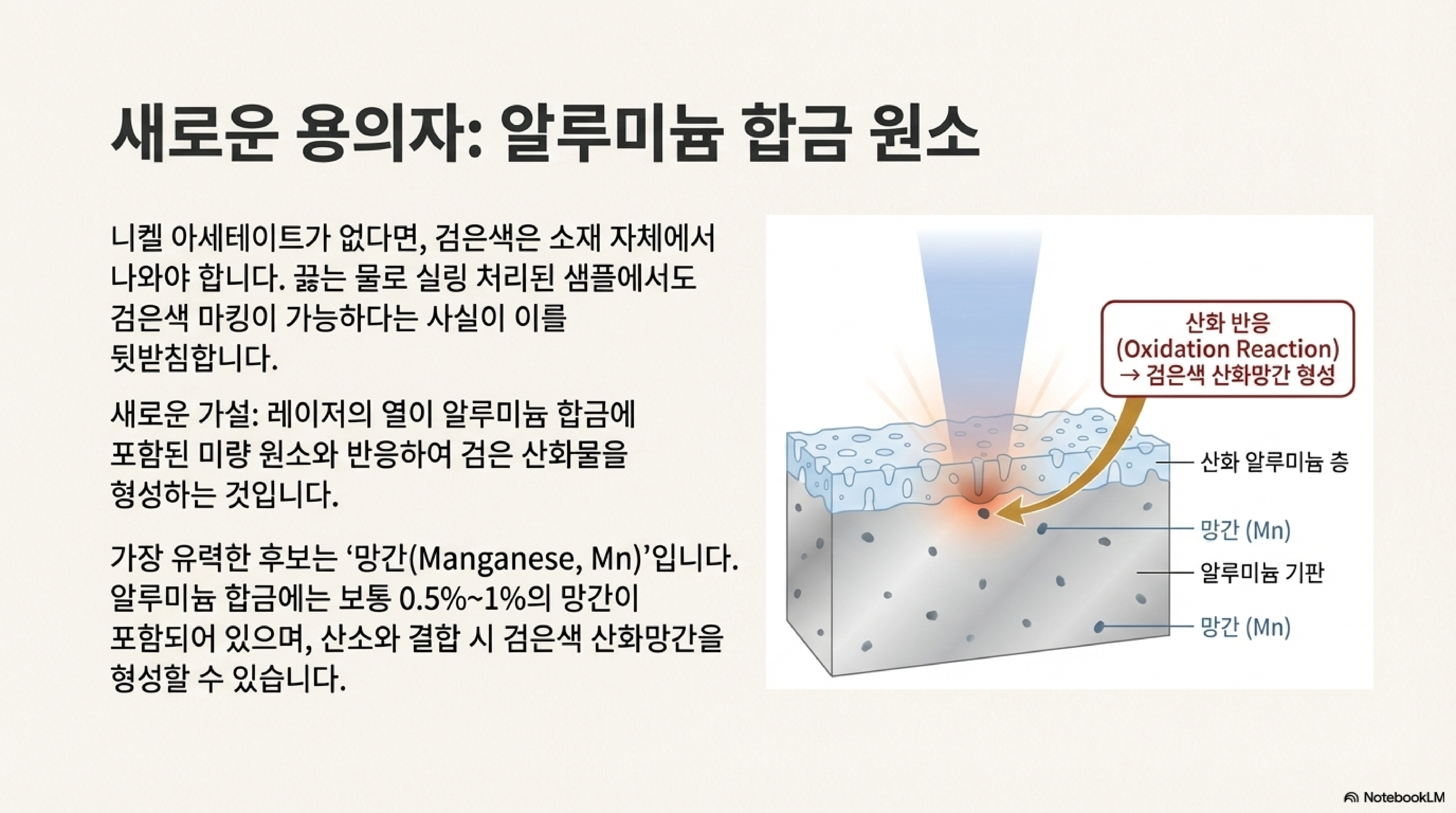 이제 범인은 명확해졌습니다. 검은색의 기원은 외부 첨가물이 아닌, 알루미늄 합금 그 자체에 있었습니다. 여기서 저의 화학 및 금속공학에 대한 지식을 바탕으로 한 새로운 가설이 탄생했습니다. 알루미늄 합금에는 보통 0.5%에서 1%가량의 '망간(manganese)'이 포함되어 있습니다. 레이저의 강한 열이 이 망간을 공기 중의 산소와 반응시켜 검은색의 산화망간을 형성했을 가능성이 매우 높습니다. 필요한 모든 재료(알루미늄 속 망간, 공기 중 산소, 레이저의 열)가 바로 그 자리에 있었기 때문입니다.