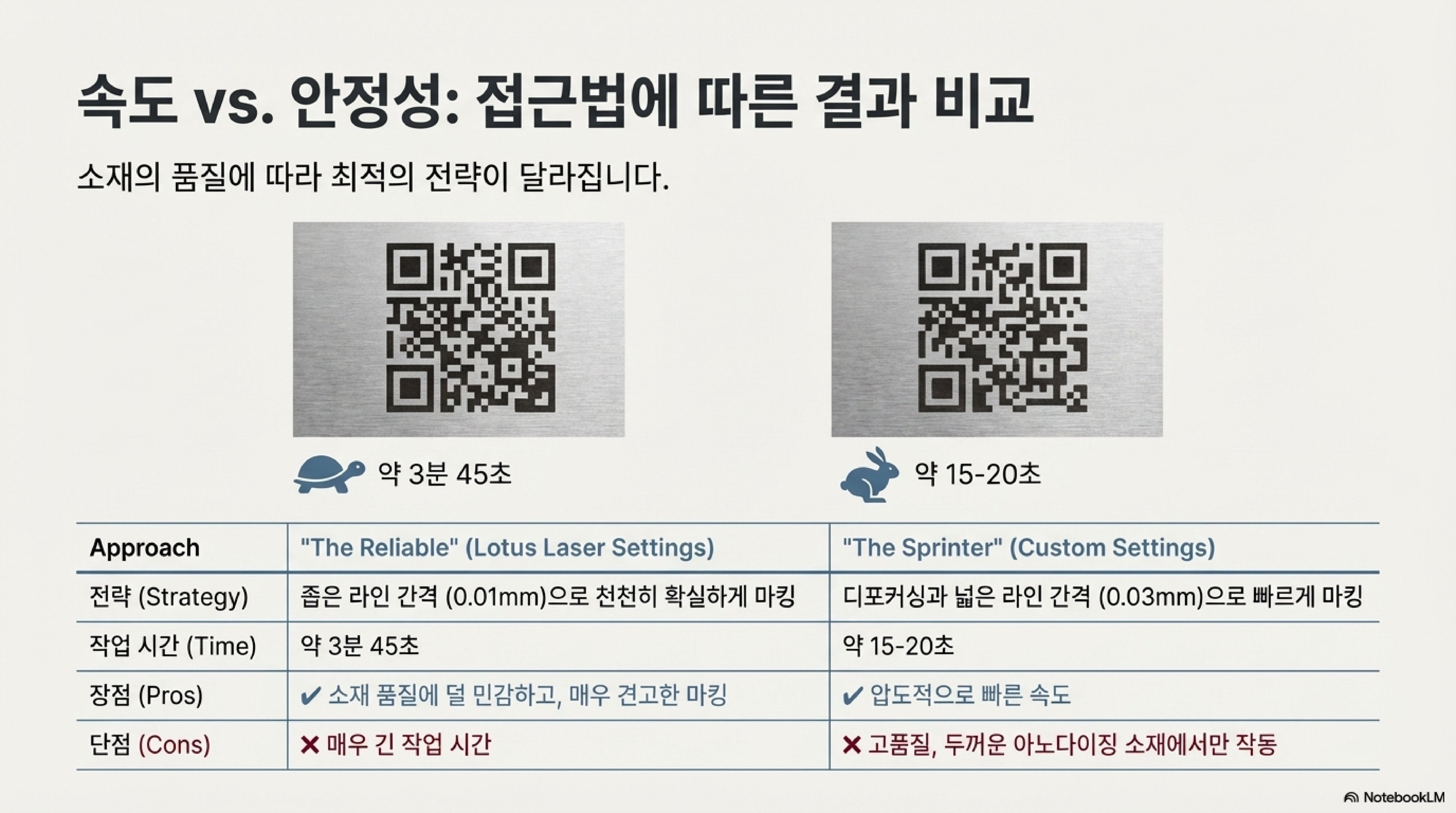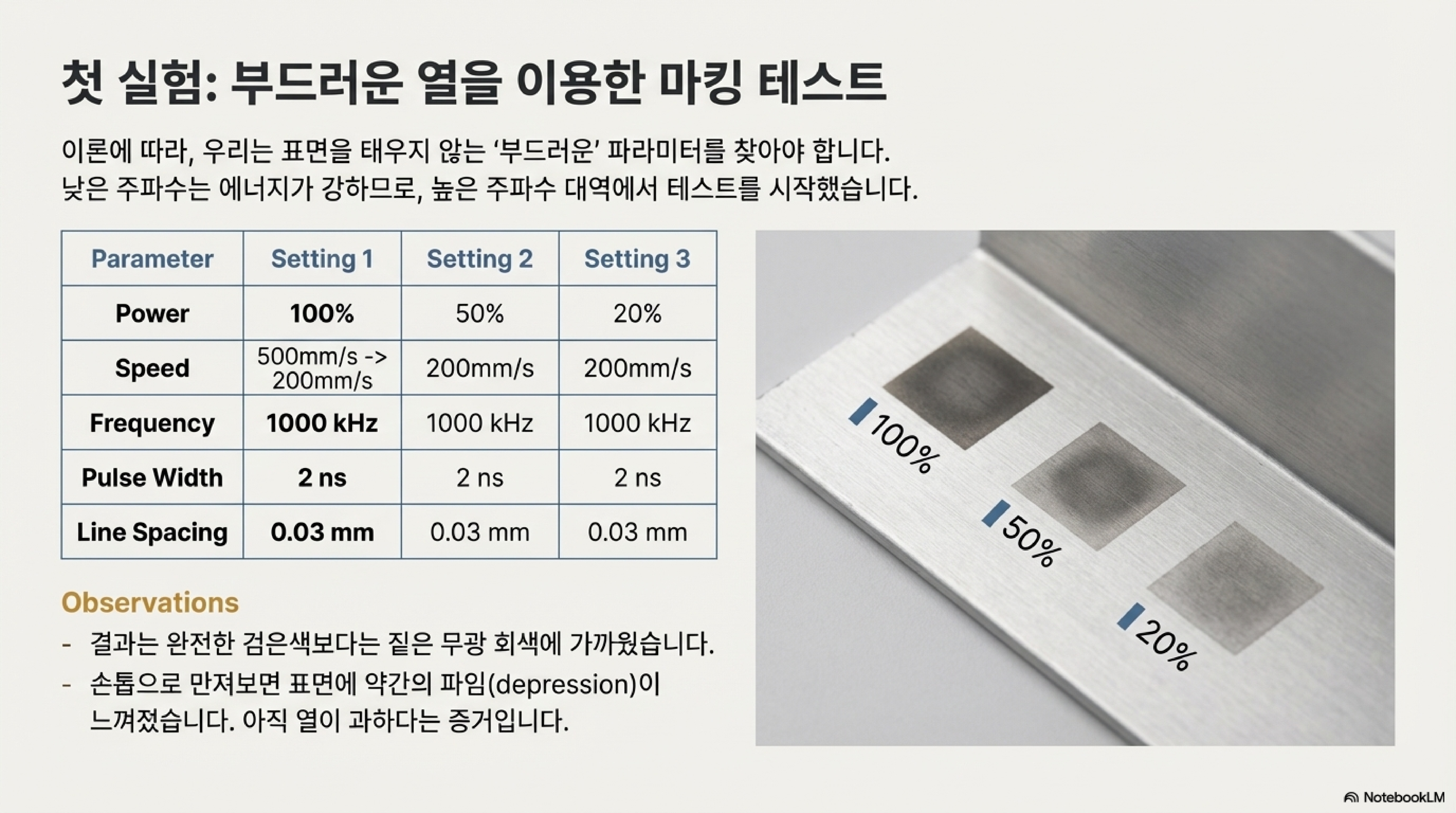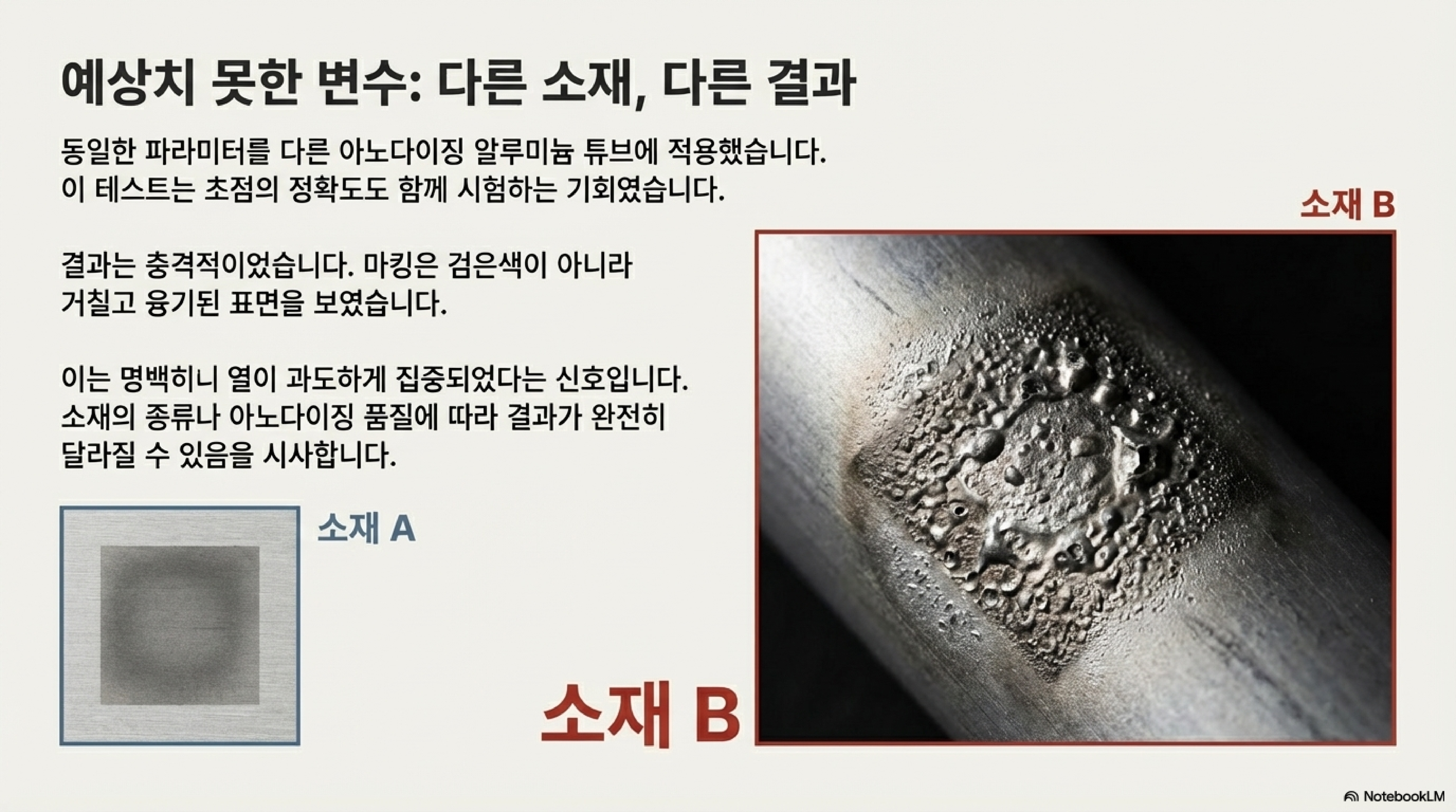 이 실패의 연속은 중요한 깨달음으로 이어졌습니다. 문제는 레이저 설정값이 아니라 '재료' 그 자체에 있었습니다. 아노다이징 층의 두께나 품질이 미세하게라도 다르다면, 결과는 극과 극을 오갔습니다. 완벽한 설정값을 찾는 데 시간을 쏟기 전에, 내가 작업할 재료의 고유한 특성을 먼저 파악하는 것이 가장 중요하다는 것, 이것이 두 번째 발견이었습니다.