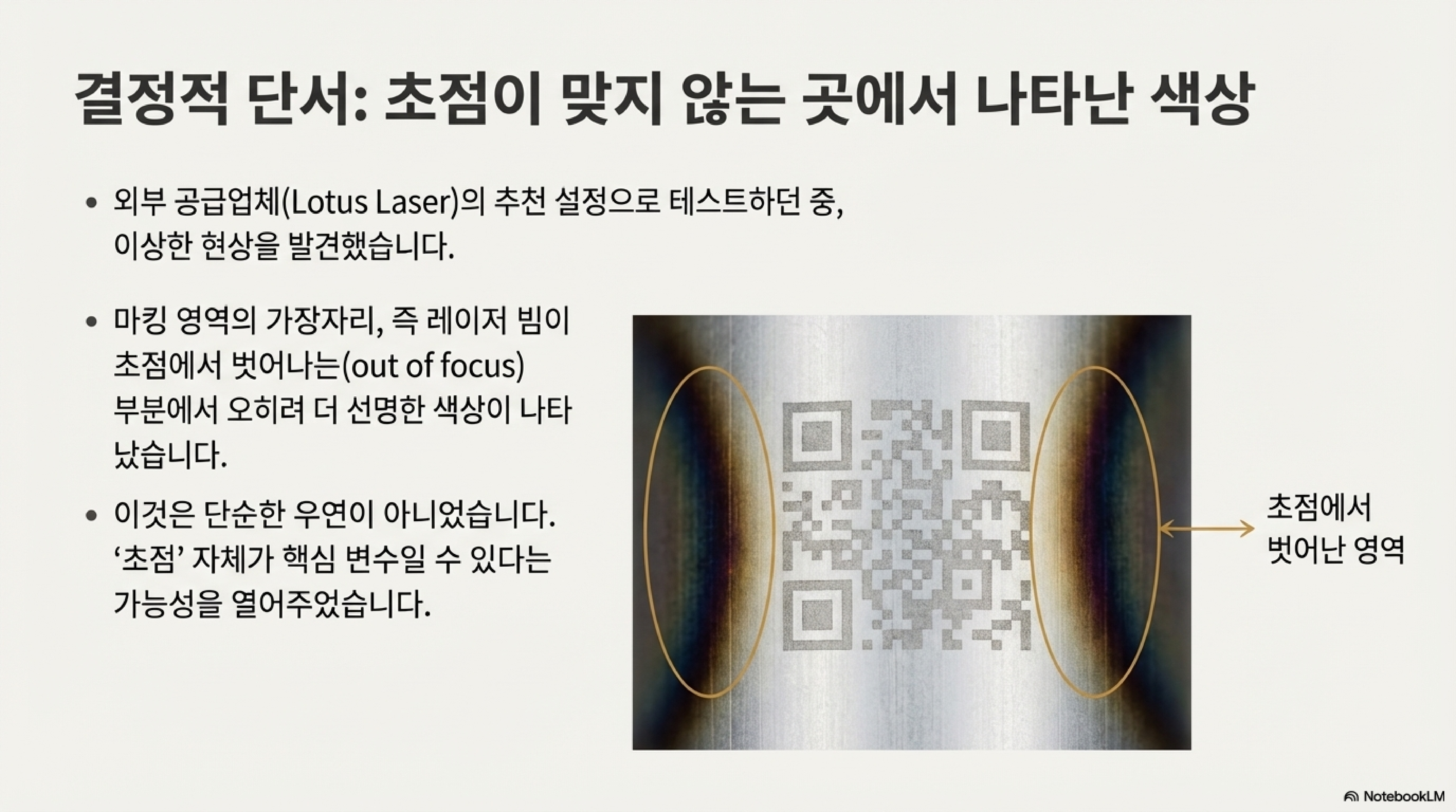 재료의 불균일성이라는 난관에 부딪힌 저는 출력과 속도를 미세하게 조정하며 수많은 시도를 반복했지만, 결과는 실망스러웠습니다. 너무 강한 에너지는 표면을 파내기만 했고, 너무 약한 에너지는 아무런 흔적도 남기지 못했습니다. 바로 그때, 실패한 마킹의 가장자리에서 예상치 못한 단서를 발견했습니다. 레이저 빔이 초점에서 살짝 벗어난 경계 부분에서 희미하게 색이 나타나고 있었던 것입니다.