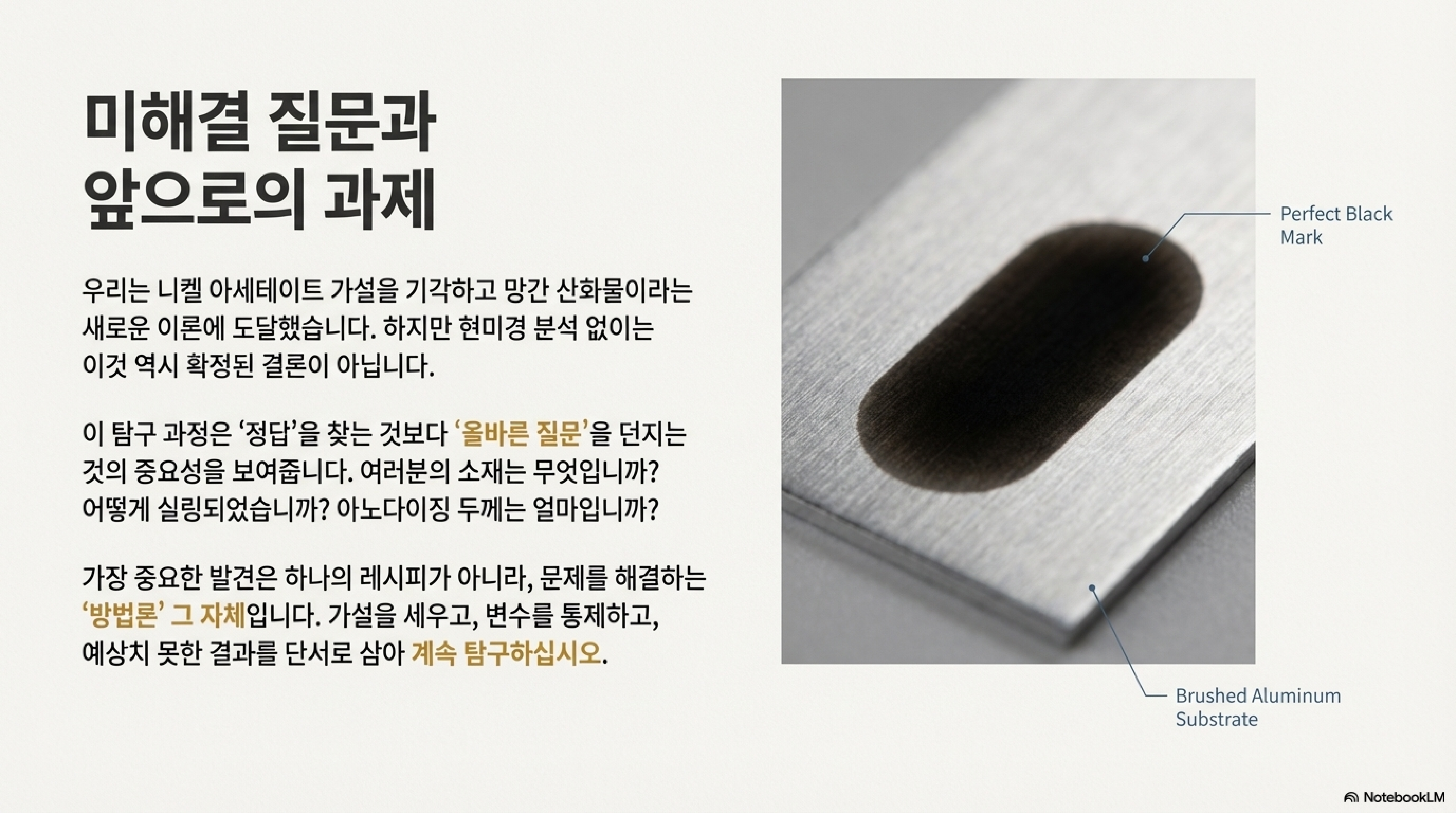 니켈 아세테이트 이론이 논파된 후, 우리는 계속해서 질문을 던져왔습니다. 도대체 이 '검은색'은 어디에서 오는 것일까? 마침내 결정적인 단서가 나타났습니다. 아노다이징 전문가가 제공한, 오직 '끓는 물'로만 실링 처리된, 즉 니켈 아세테이트가 전혀 포함되지 않은 알루미늄 샘플에서도 선명한 검은색 마크가 성공적으로 생성된 것입니다.